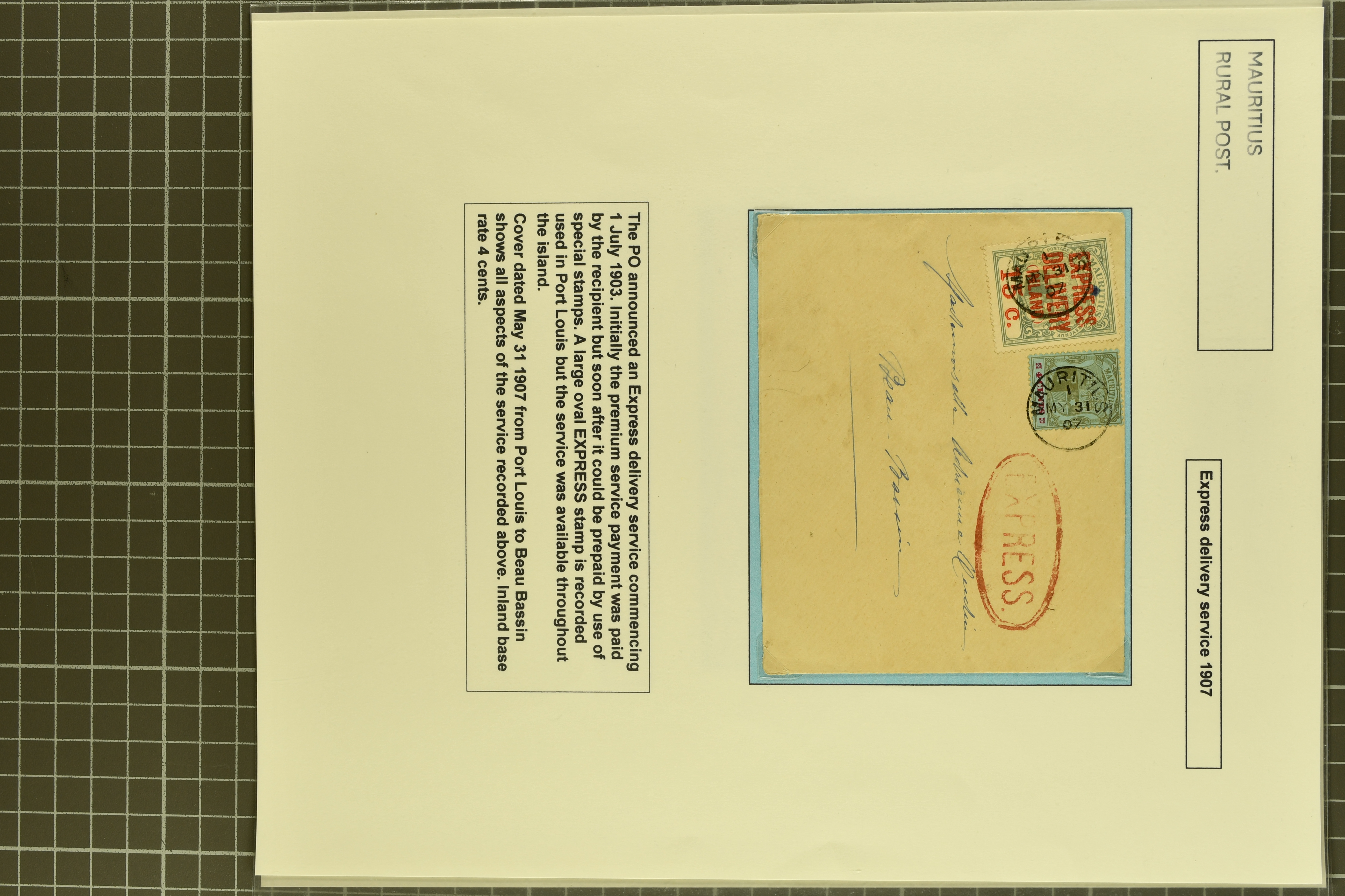 Express Fee Usages 1907/1910: Covers (3) with 1907 usage from Port Louis to Beau-Bassin bearing 4 c. and 1904 Express 15 c. grey-green tied by Mauritius cds's with oval EXPRESS cachet (Proud fig. EXP2) at right in