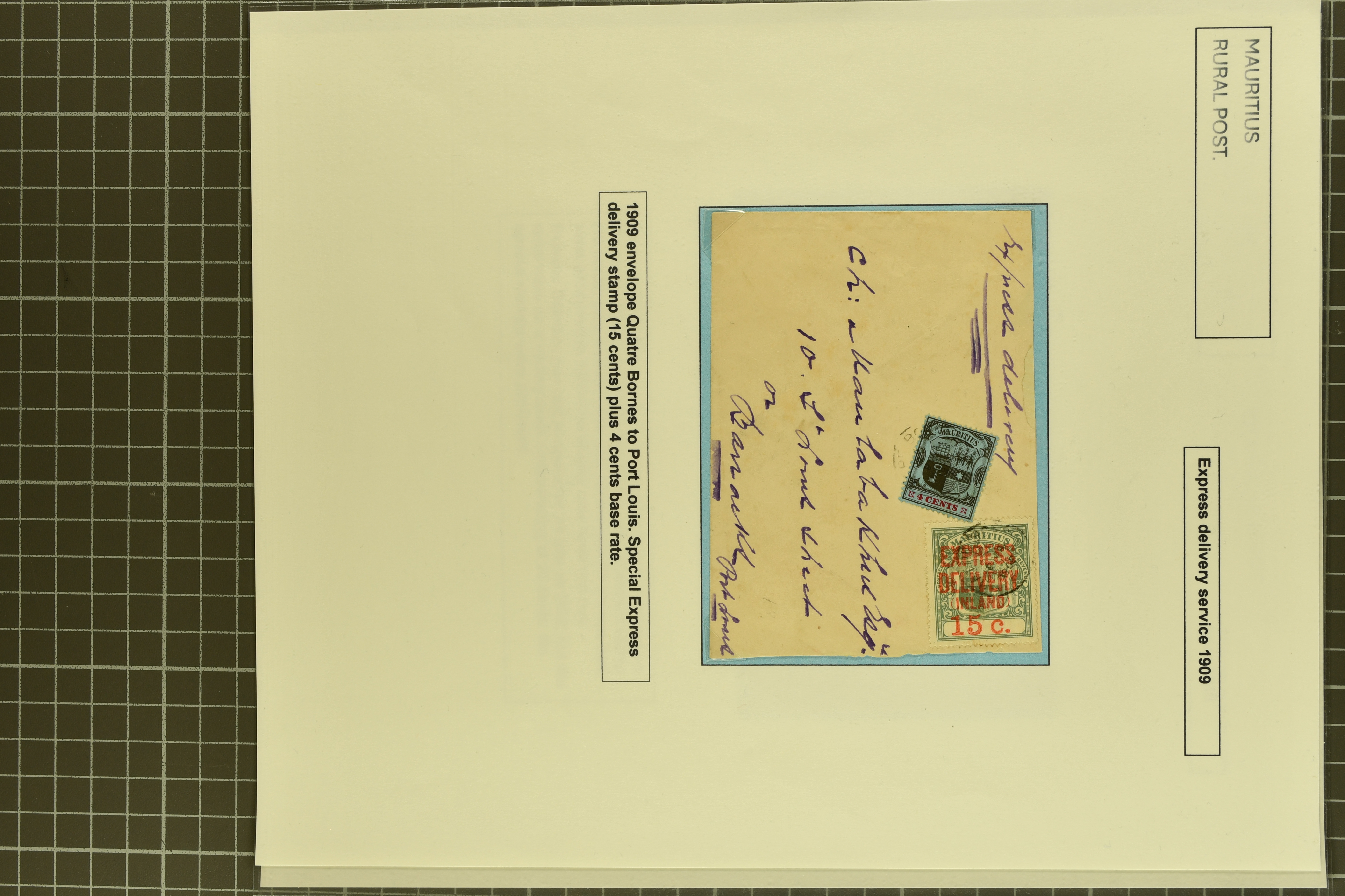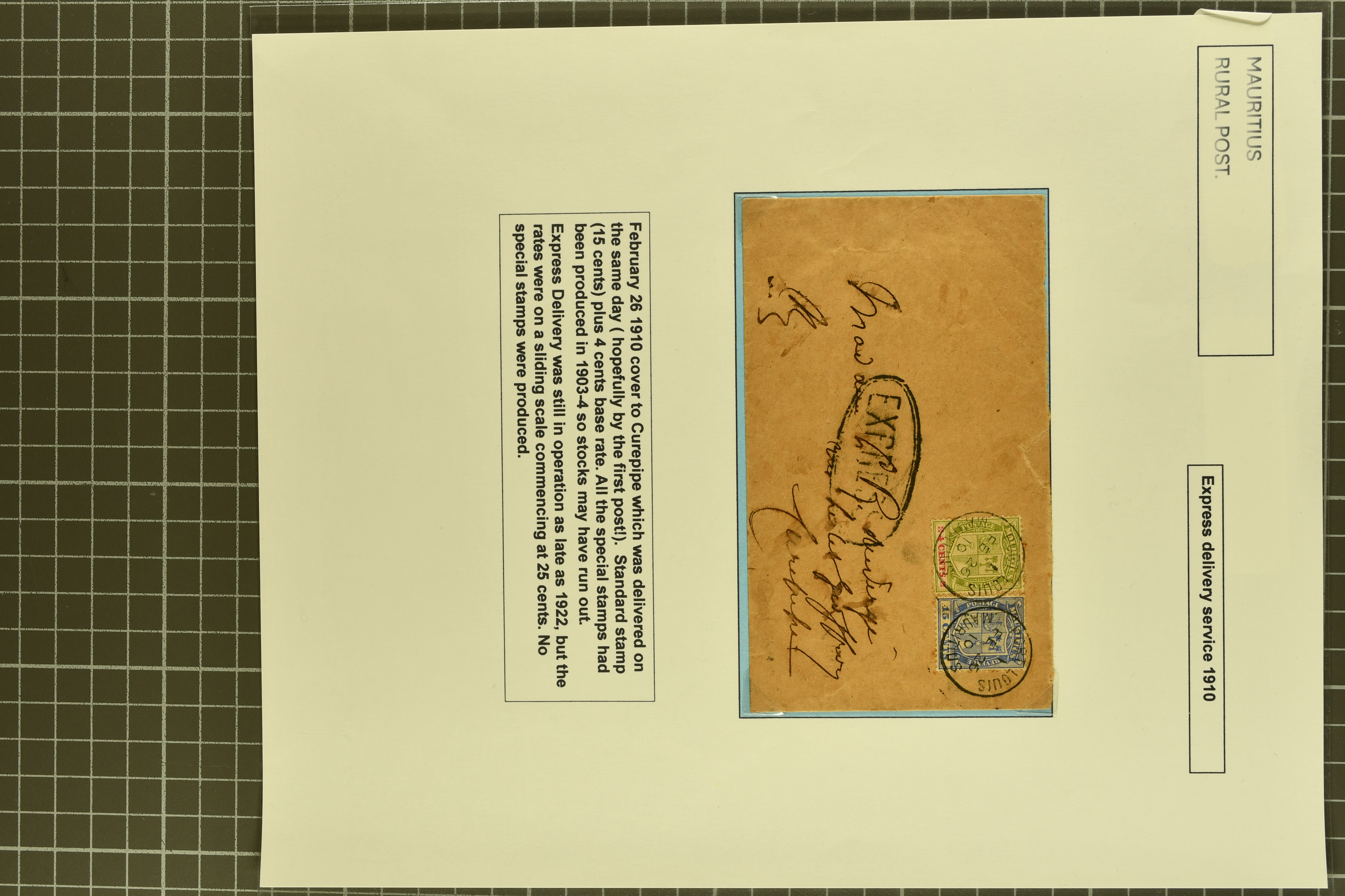 red, 1909 usage with similar franking used from Quatre Bornes to Port Louis but without the cachet; 1910 cover from Port Louis franked by 4 c. and 15 c. definitives to Curepipe with oval EXPRESS cachet in black (Proud fig. EXP2). Scarce (Image 1)