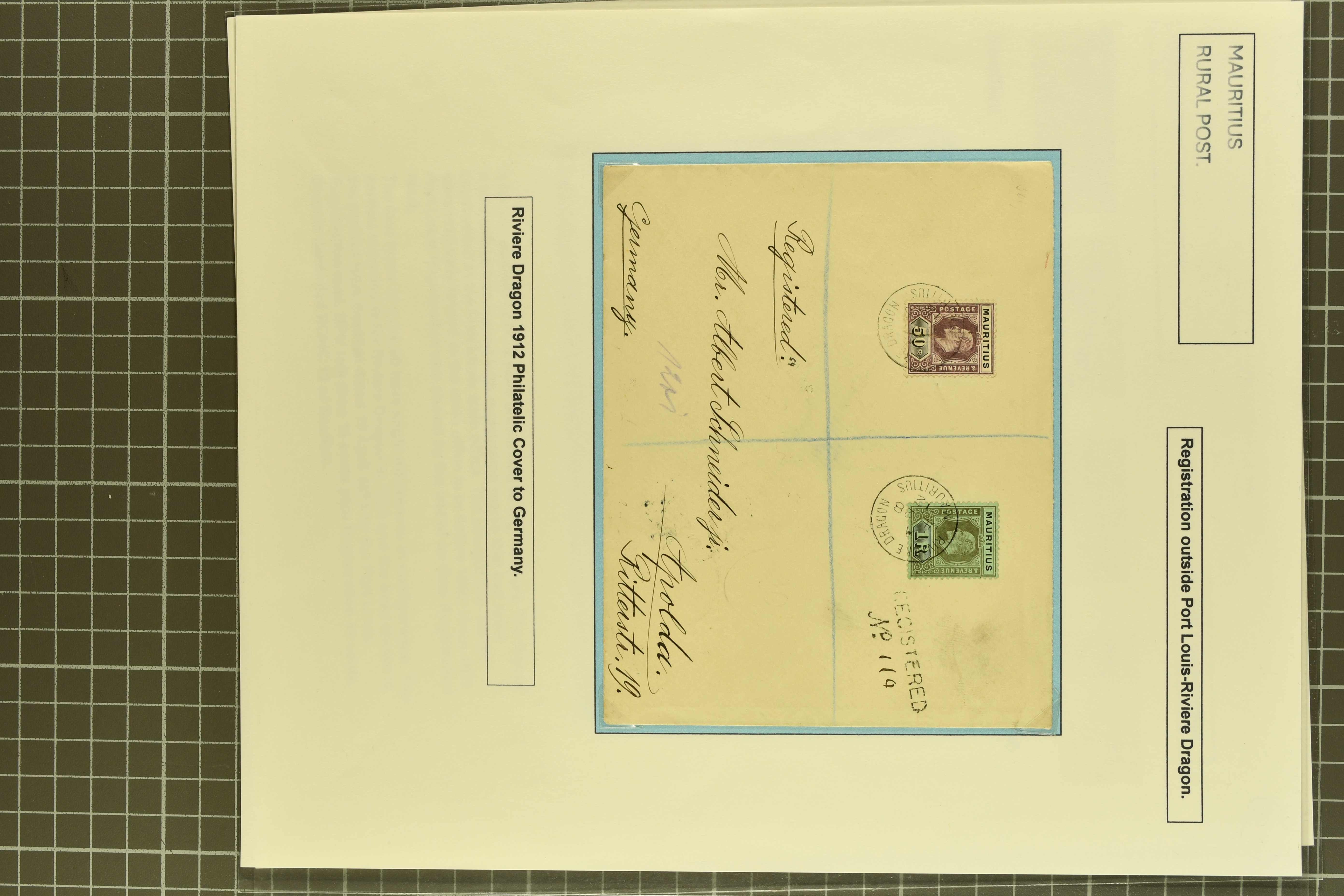 tied "Rodrigues" cds with Registered cachet (Proud fig. R1) on obverse and 1912 cover to Germany with registered cachet used from Riviere Dragon. Scarce group (4) (Image 1)