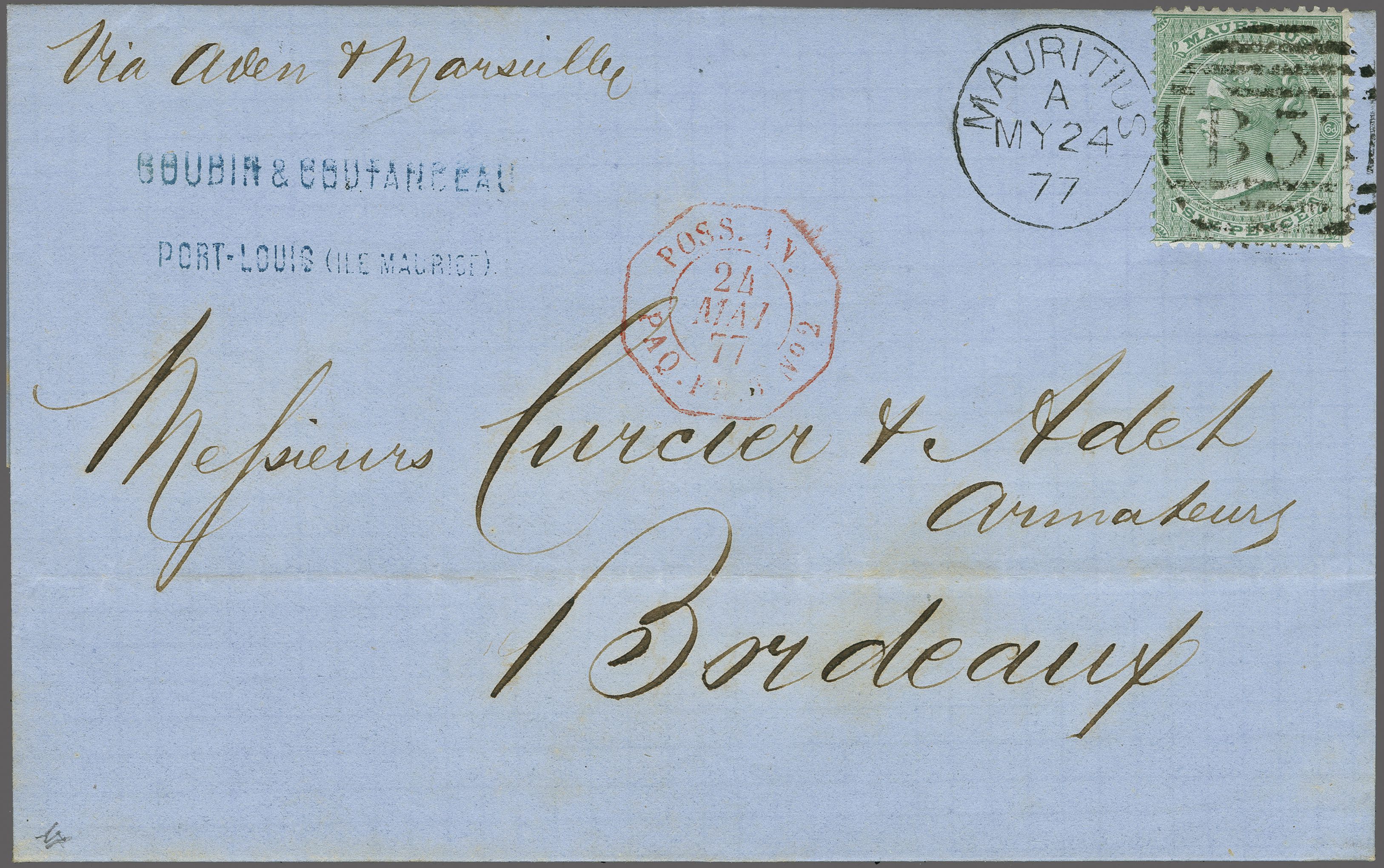 1865: 6 d. yellow-green, a single example used on 1877 entire letter from Port louis to Marseille endorsed "via Aden & Marseille", well tied by Mauritius / B53 duplex (May 24) in black. Carried on steamer "Godavery" with