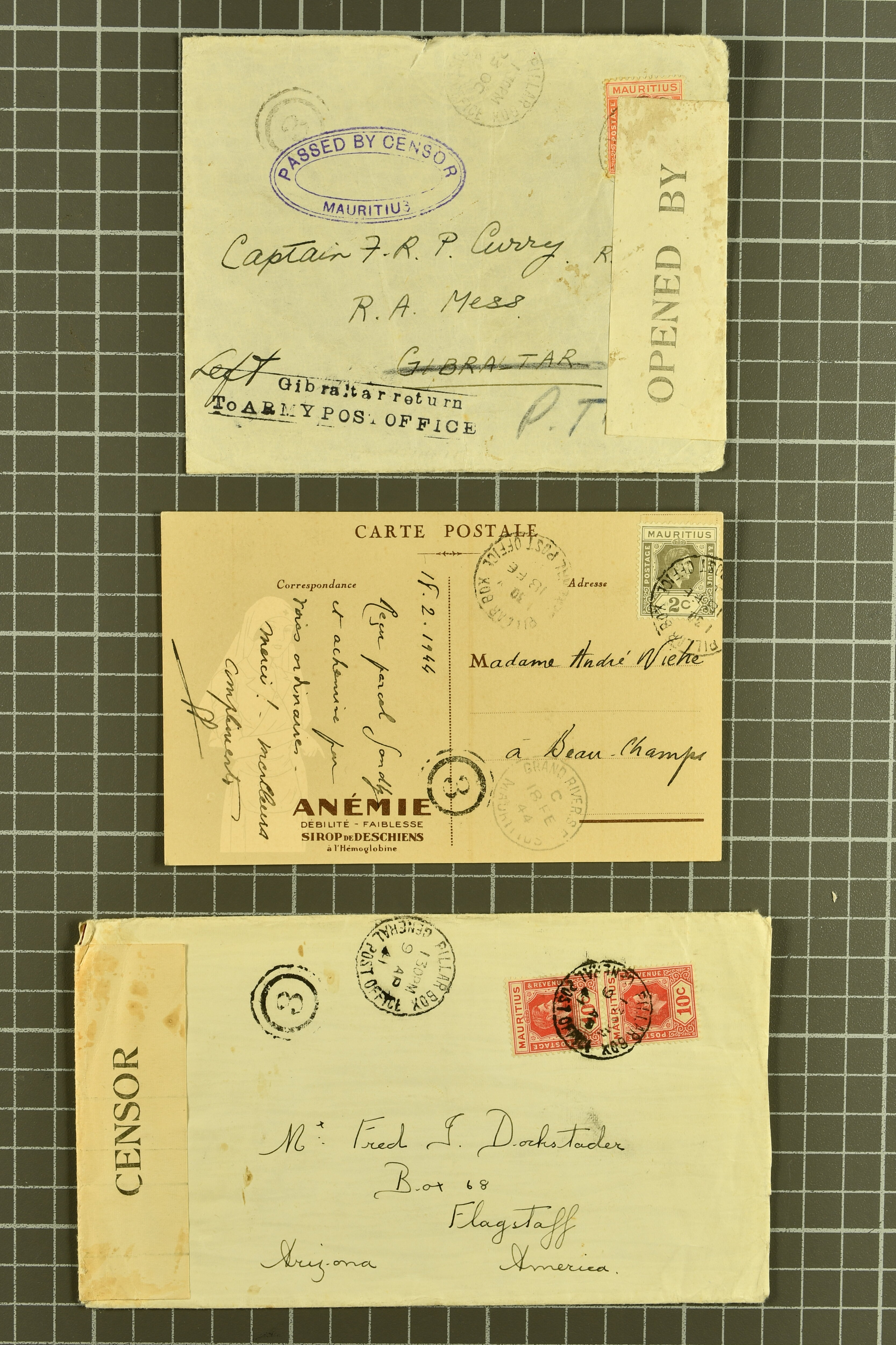 / MAURITIUS in violet and Reseal OPENED BY CENSOR at right (Types IIC). GPO / Mauritius arrival (April 1); 1941 cover to Arizona, USA franked at 20 c. rate with 10 c. pair tied "Pillar Box / General Post Office" (April 9) again with handstamp "3"