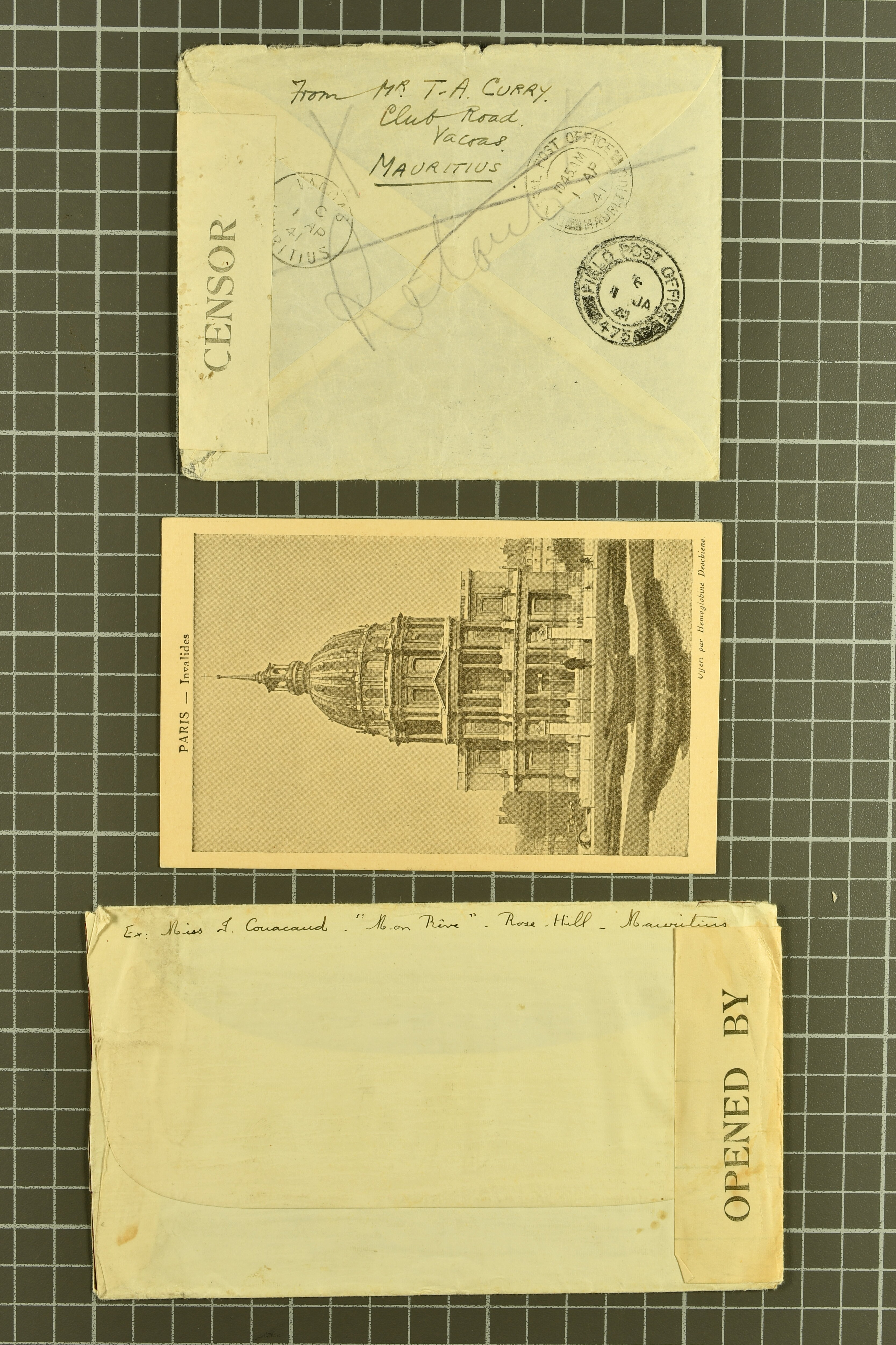 1940/44: Covers/cards (3) showing the re-use of the 1850 (!) numeral "3" handstamp originally supplied to Souillac; with 1940 cover from Mauritius tied by "Pillar Box / General Post Office" cds (Oct 23) with