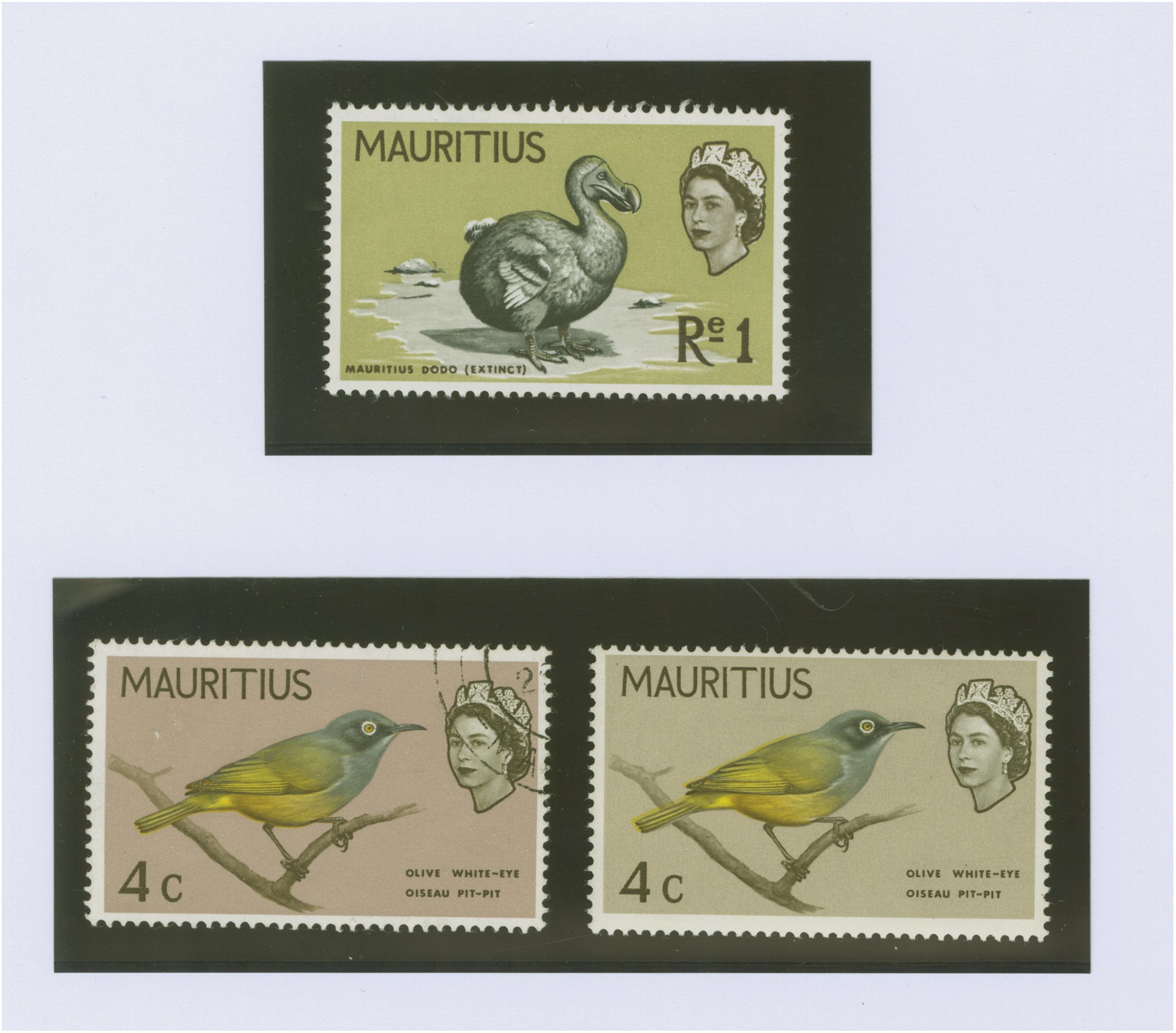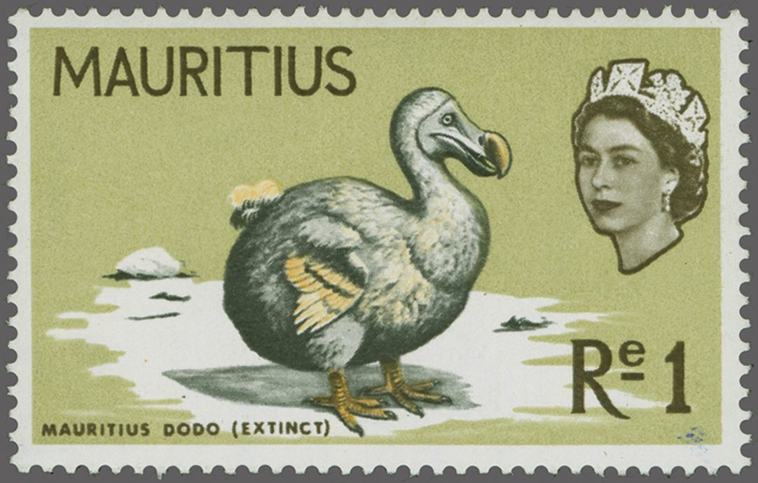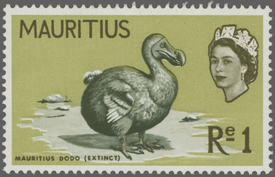 1965 (March 16): 1 r. "Mauritus Dodo" on light yellow-olive background, an unused example with variety "Pale Orange (wing-tips) Omitted", fresh and fine, unmounted og. Rare, sold together with 4 c. light reddish-purple with
