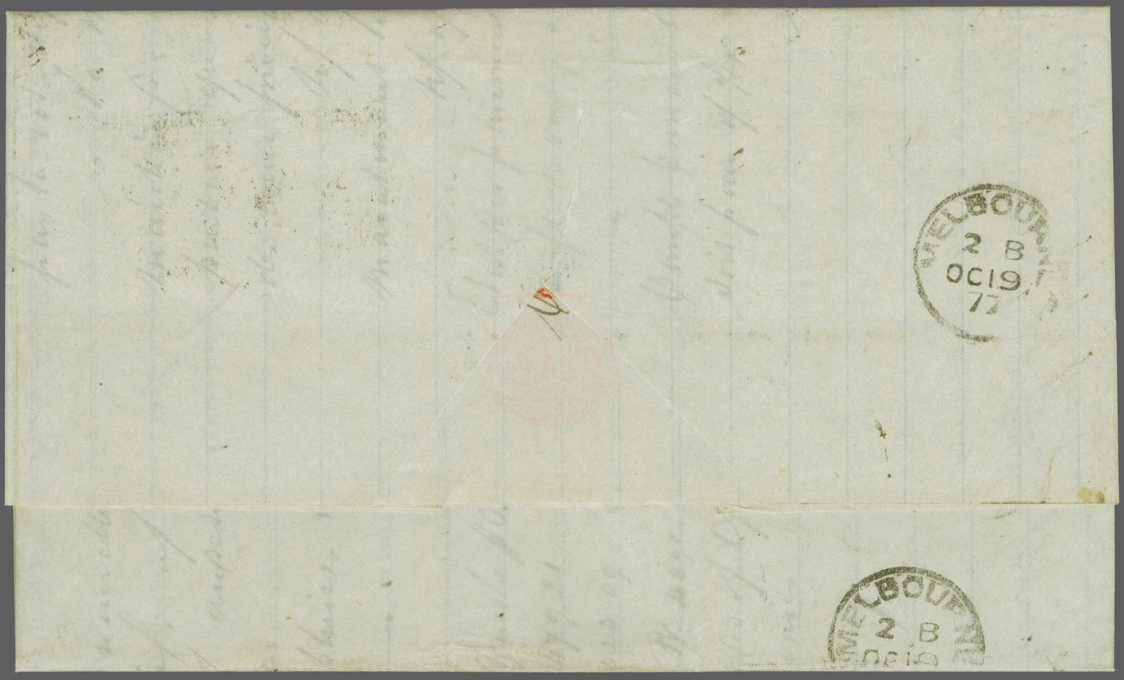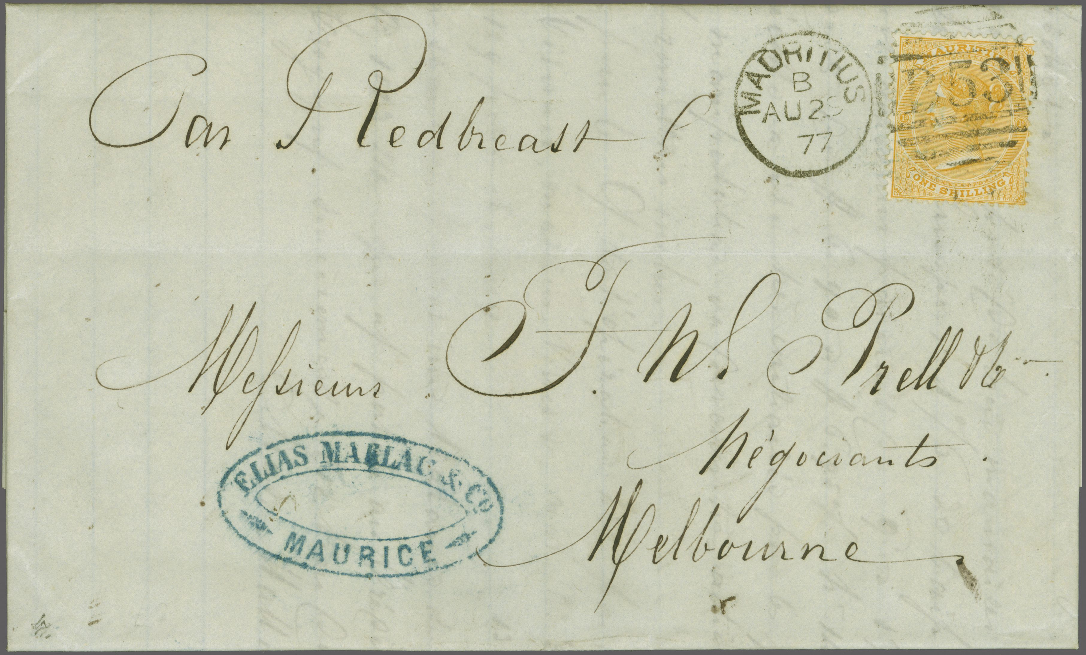 1872: 1 s. orange, wmk. Crown CC, a single example used on 1877 entire letter to Melbourne, Victoria endorsed "Par Redbreast", tied by "Mauritius / B53" duplex in black (Aug 25). Reverse with Melbourne arrival cds (Oct 19) in