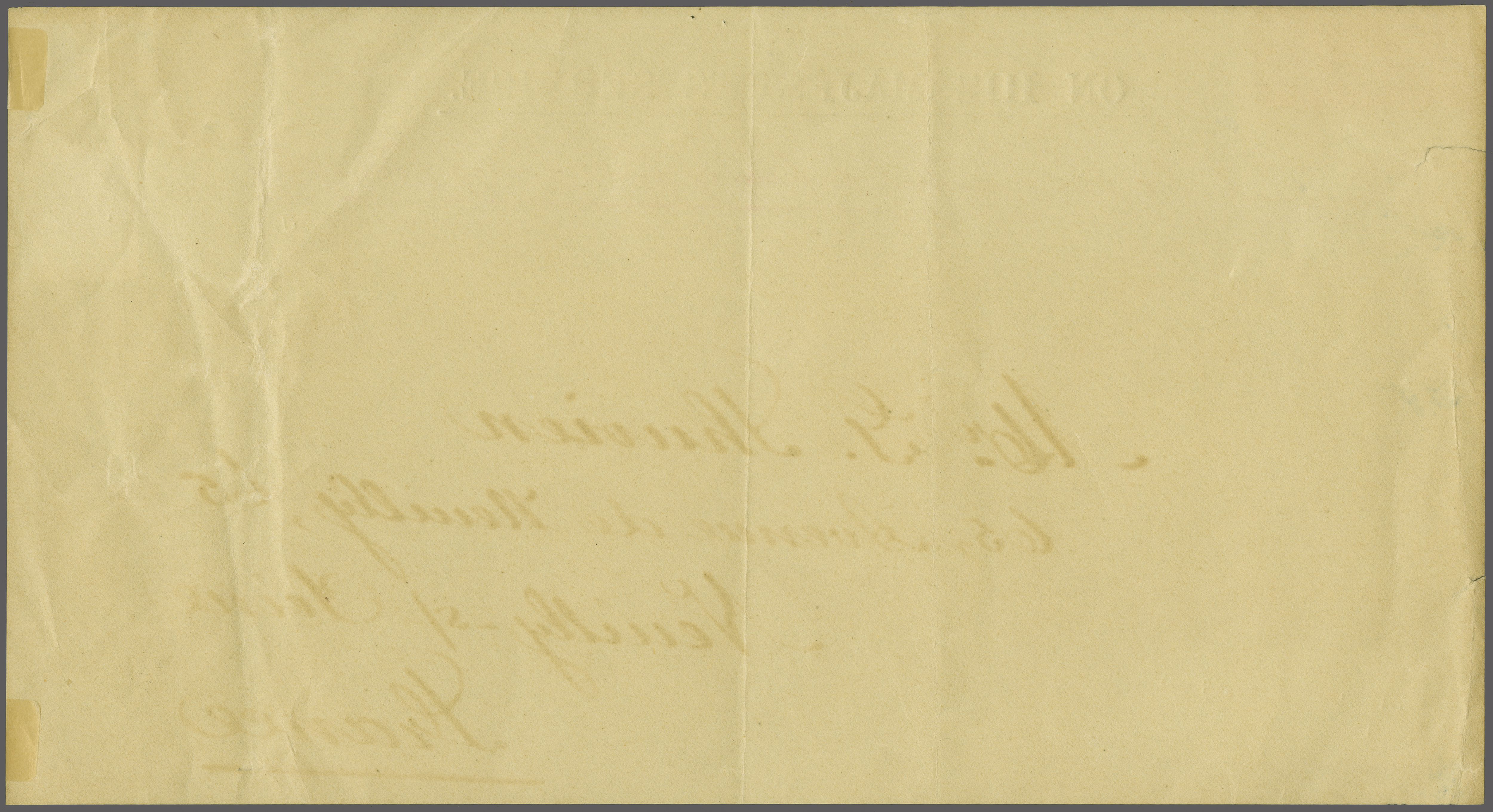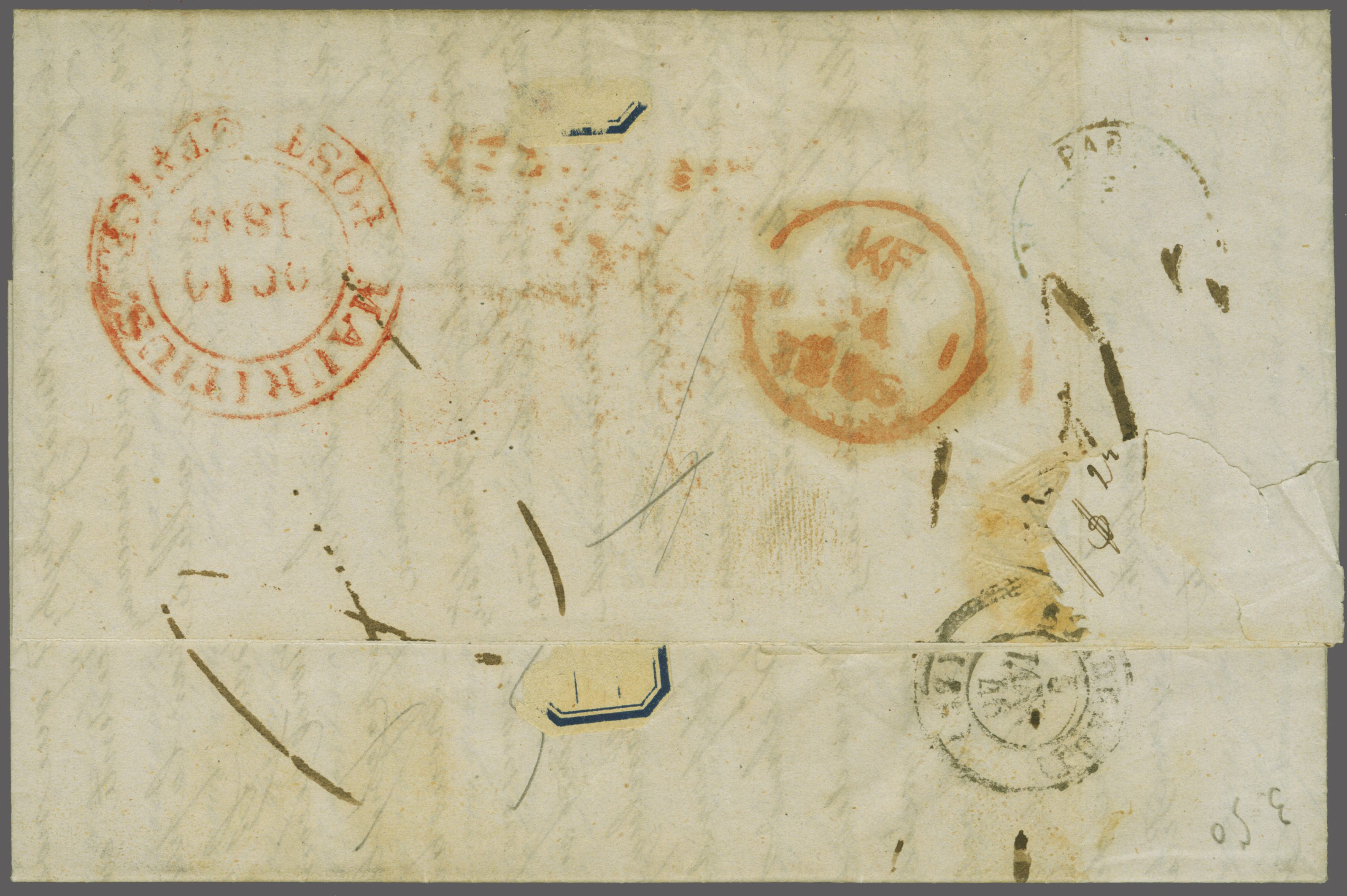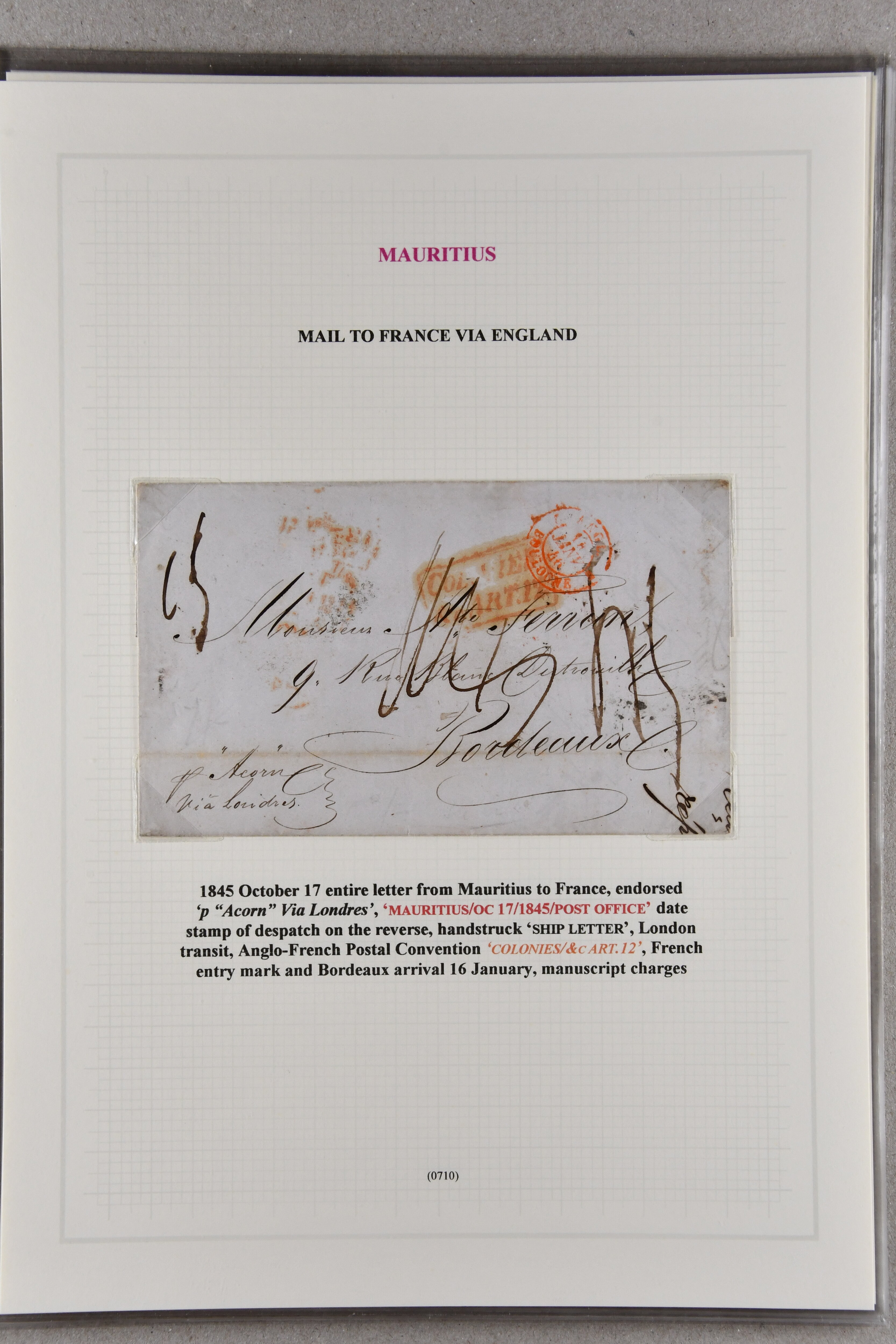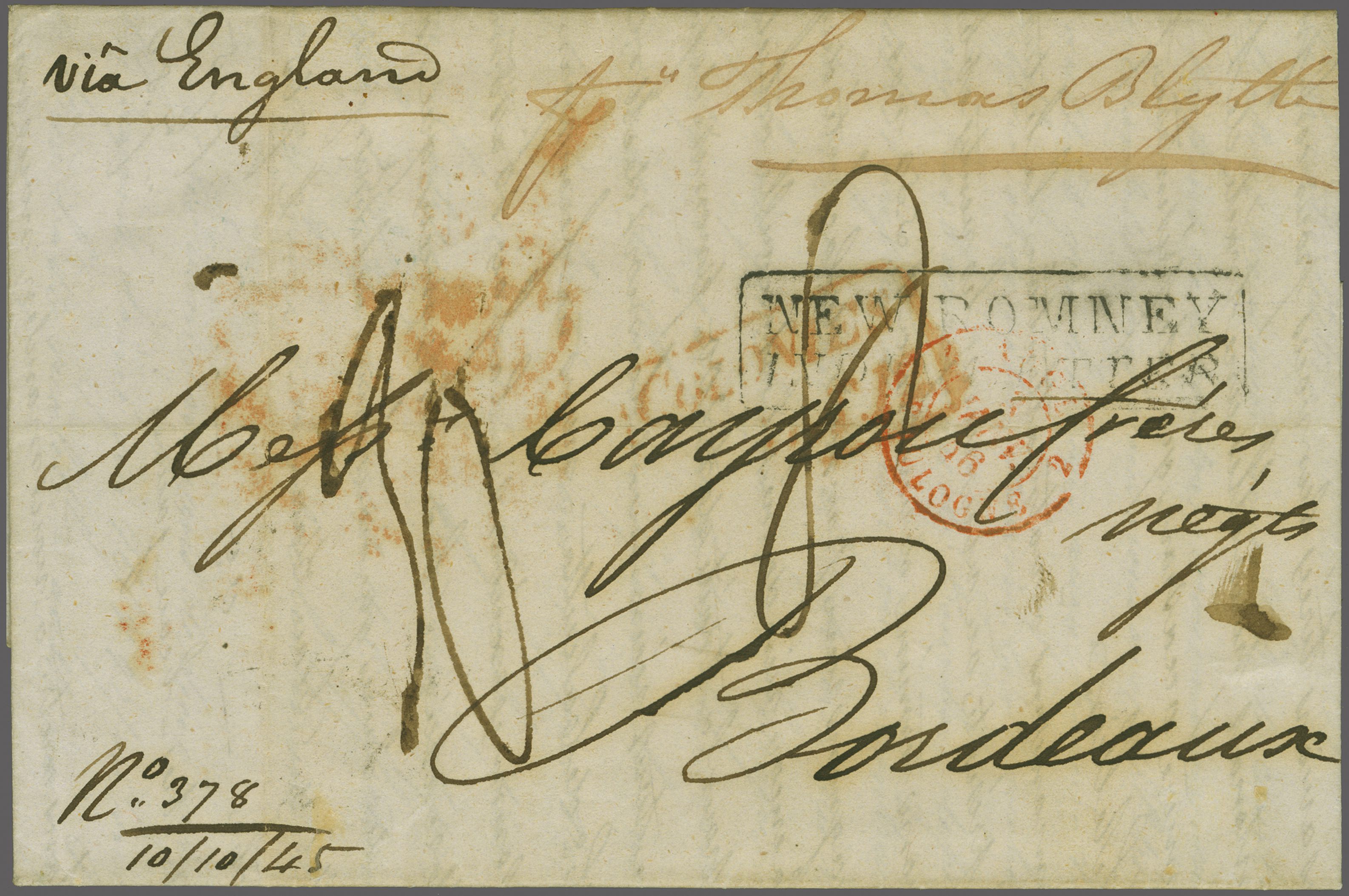 1845 (Oct 9): Entire letter from Port Louis to France endorsed "via England" and "pr. Thomas Blyth", showing circular "MAURITIUS / POST OFFICE" cds on reverse in red (Oct 14), thence landed with "NEW ROMNEY / INDIA LETTER"