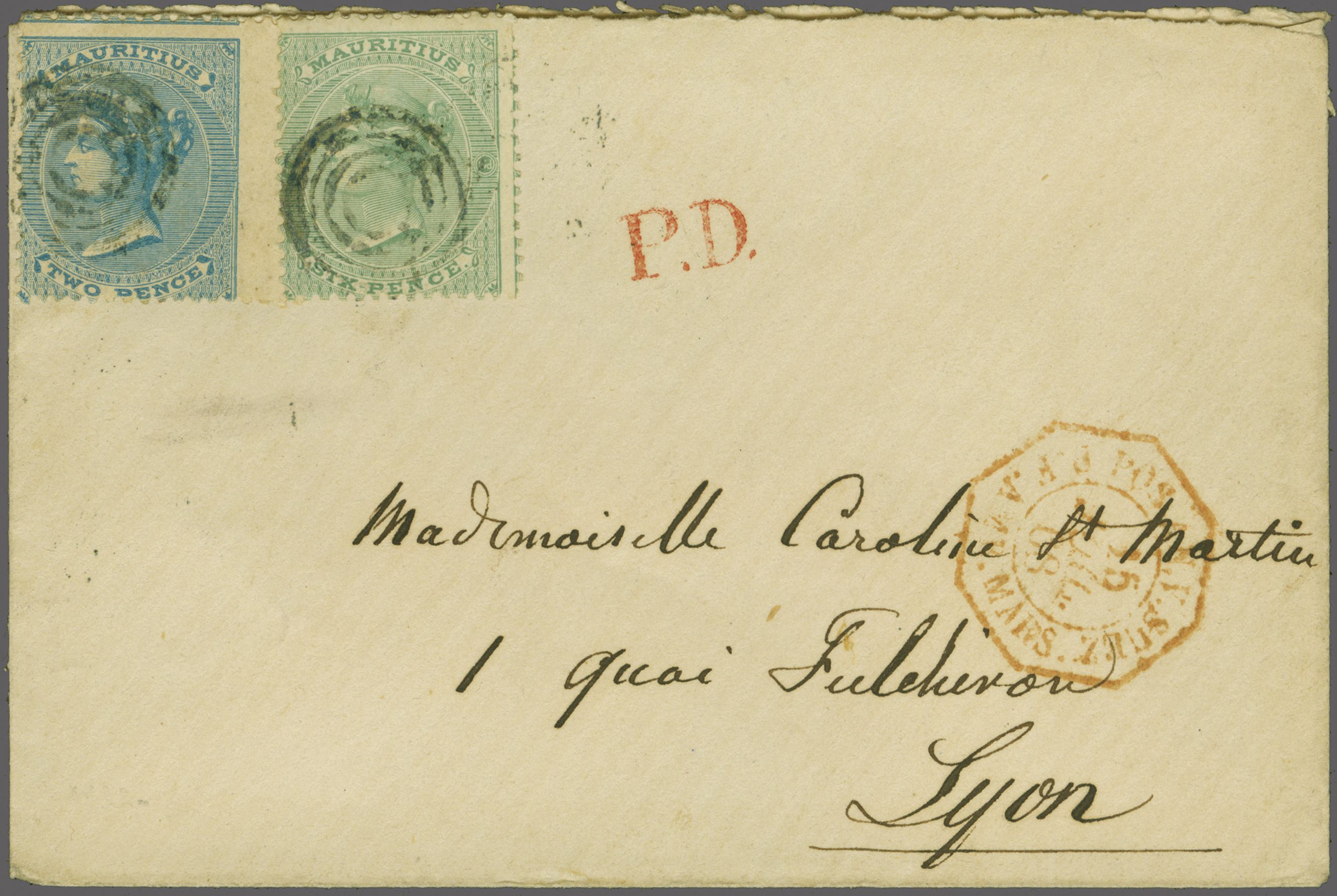 obversse with red "P.D." mailed via French Packet with octagonal Marseille entry marking in red and Lyon arrival cds. Scarce and fine (Image 1)
