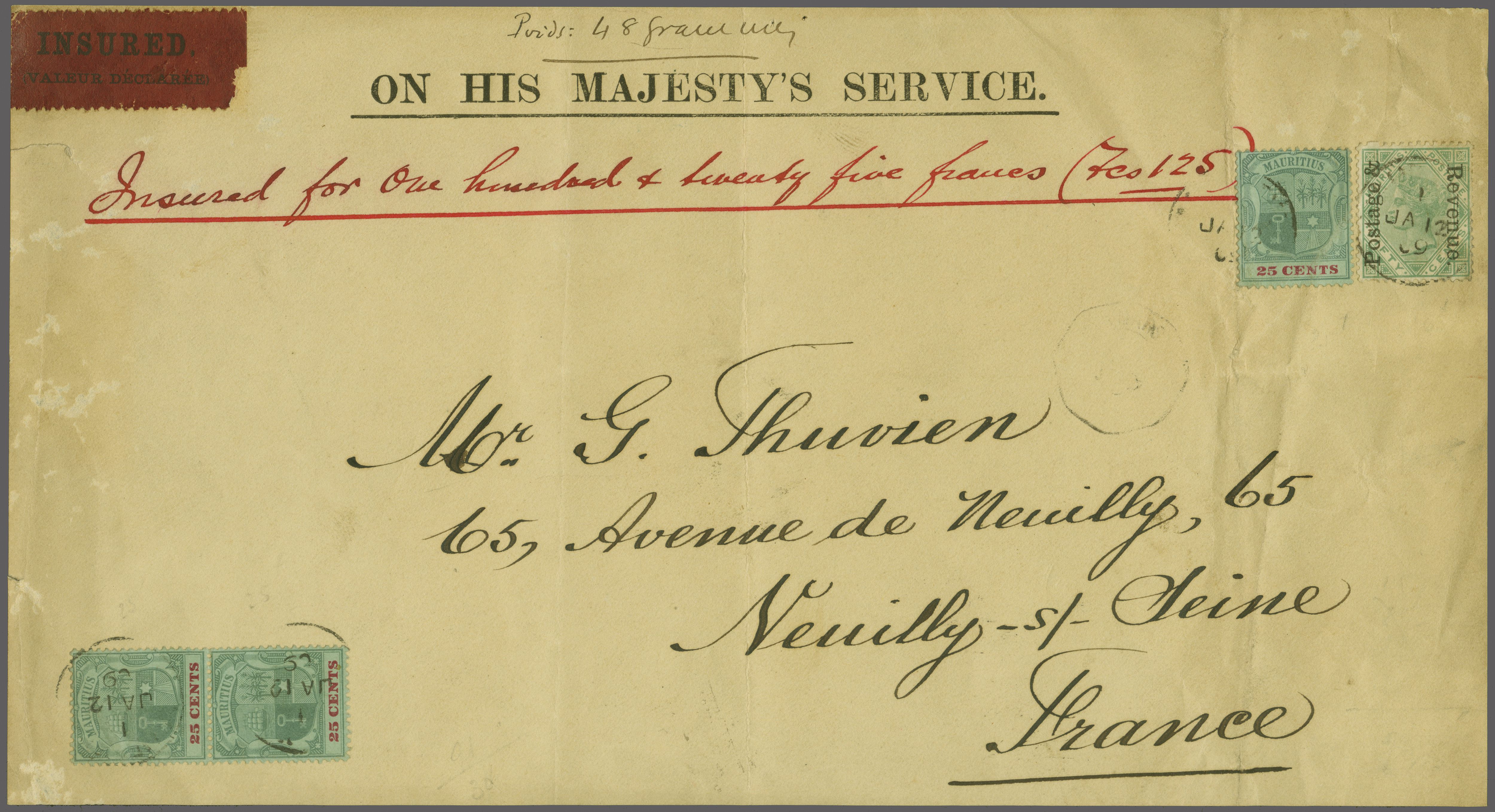 francs" with red perforated "Insured / Valeur Déclarée" label at left, the adhesives all tied by light "Mauritius" cds's (Jan 12) in black. An unusual item (Image 1)