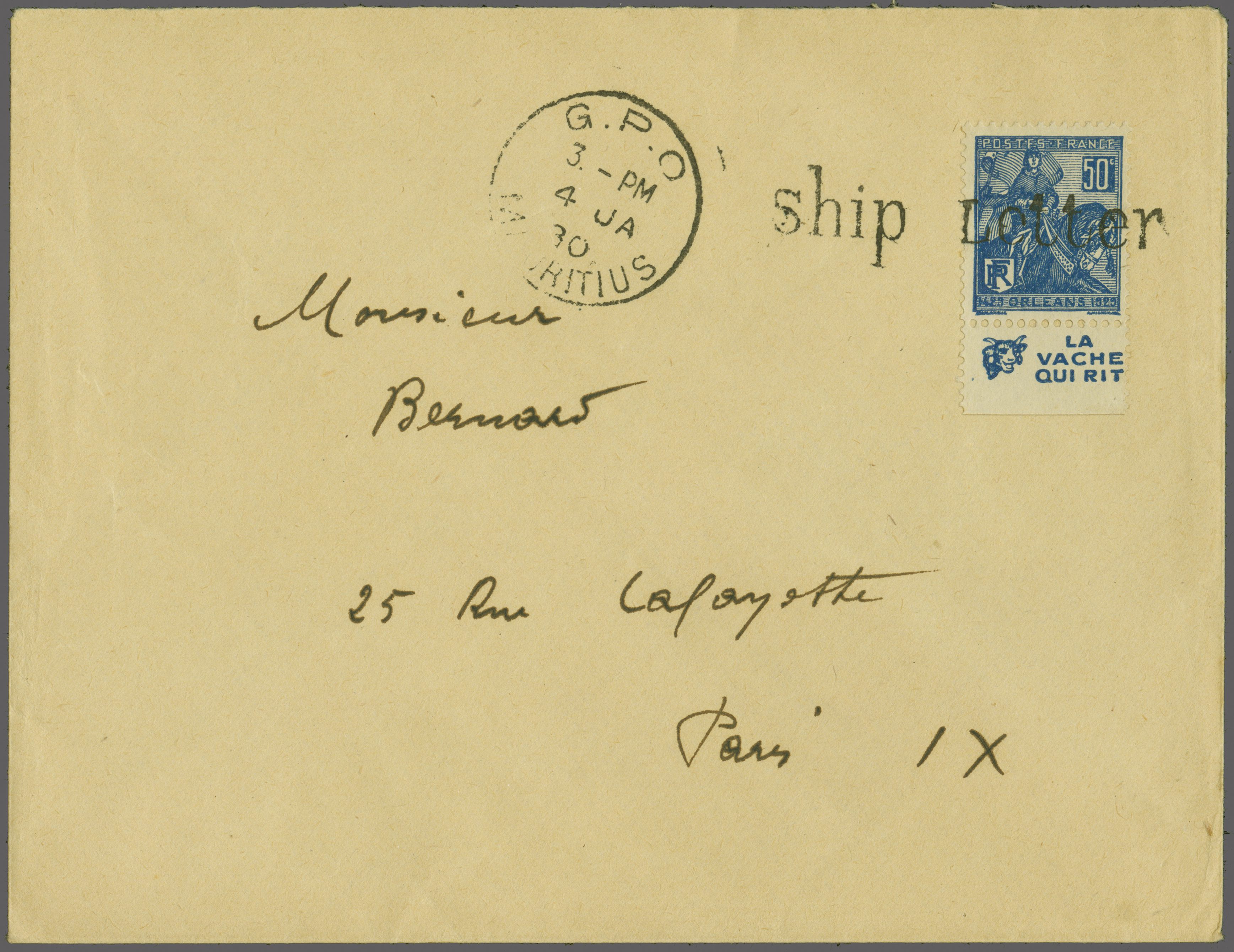 1929: France Joan od Arc 50 c. deep blue (Yvert 257) used on 1930 cover to Paris tied by "ship Letter" straight line handstamp (as first utilised in 1850) struck in black alongside "GPO / MAURITIUS" cds (Jan 4) in black.