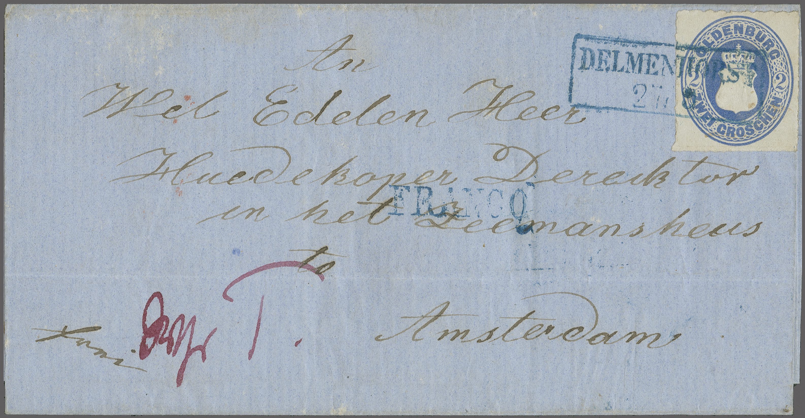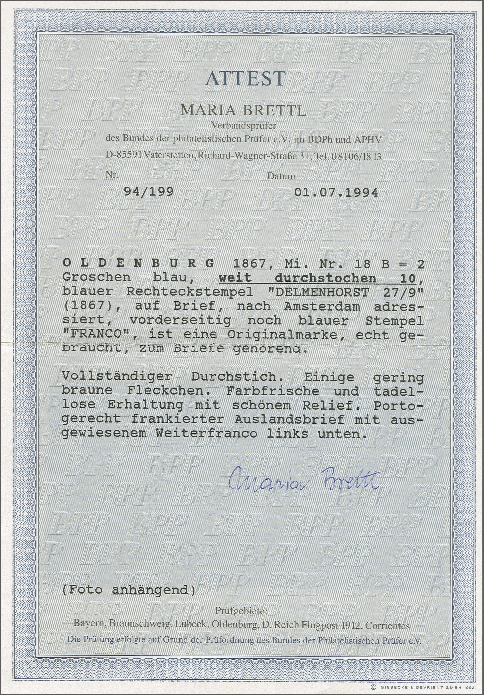 1680 cover imageOldenburg 1867, weit durchstochen, 2 Silbergroschen ultramarin, farbfrisch und mit gutem Durchstich, mit sauber aufgesetztem Ra2 "DELMENHORST 27/9" (1867) auf Briefhülle nach Amsterdam. Eine attraktive und außerordentlich seltene Einzelfrankatur, in einwandfreier Erhaltung. Fotoattest Brettl BPP (1994) Provenienz: 88. Corinphila-Auktion (1994) (Image 1) (Image 2) (Image 3)