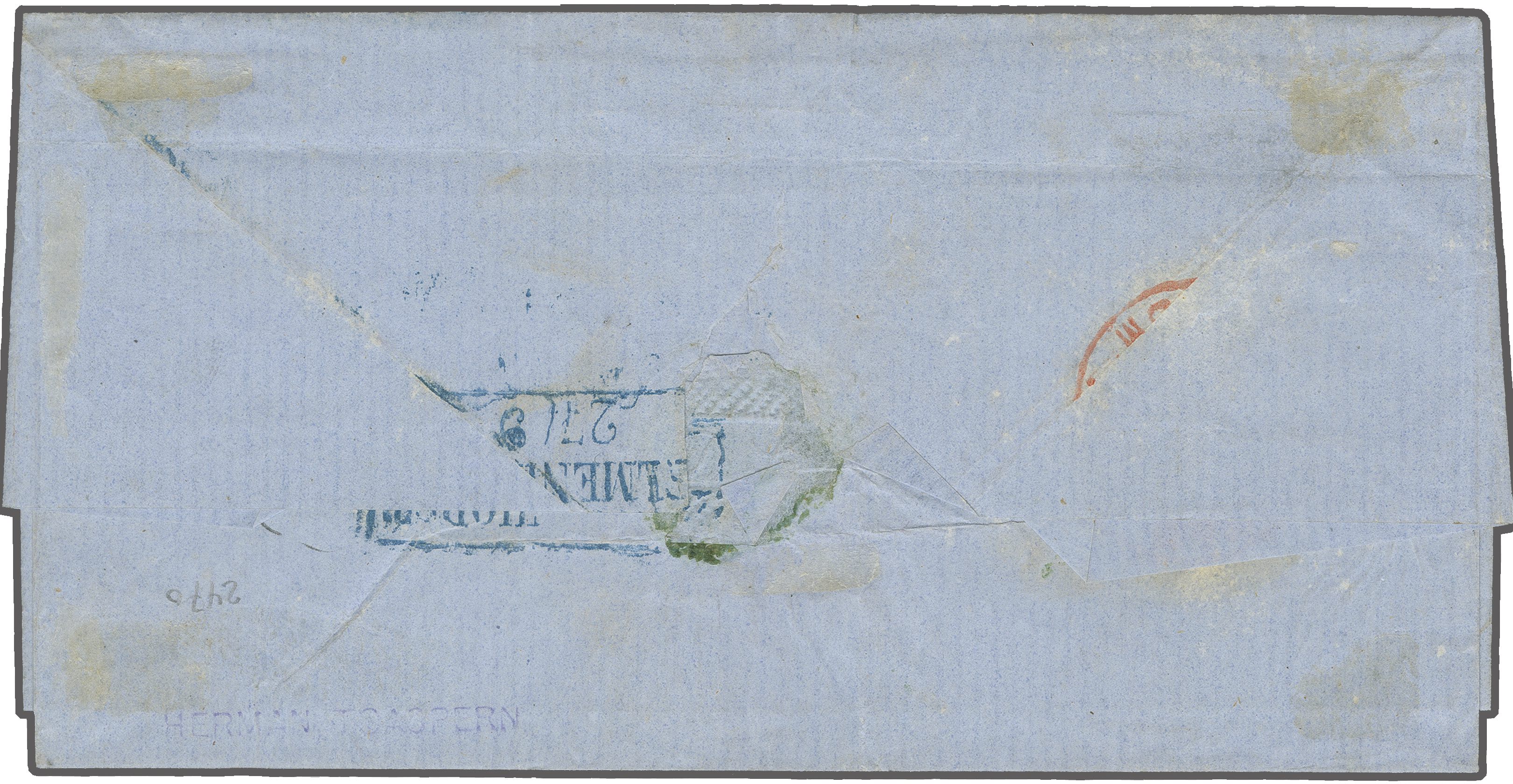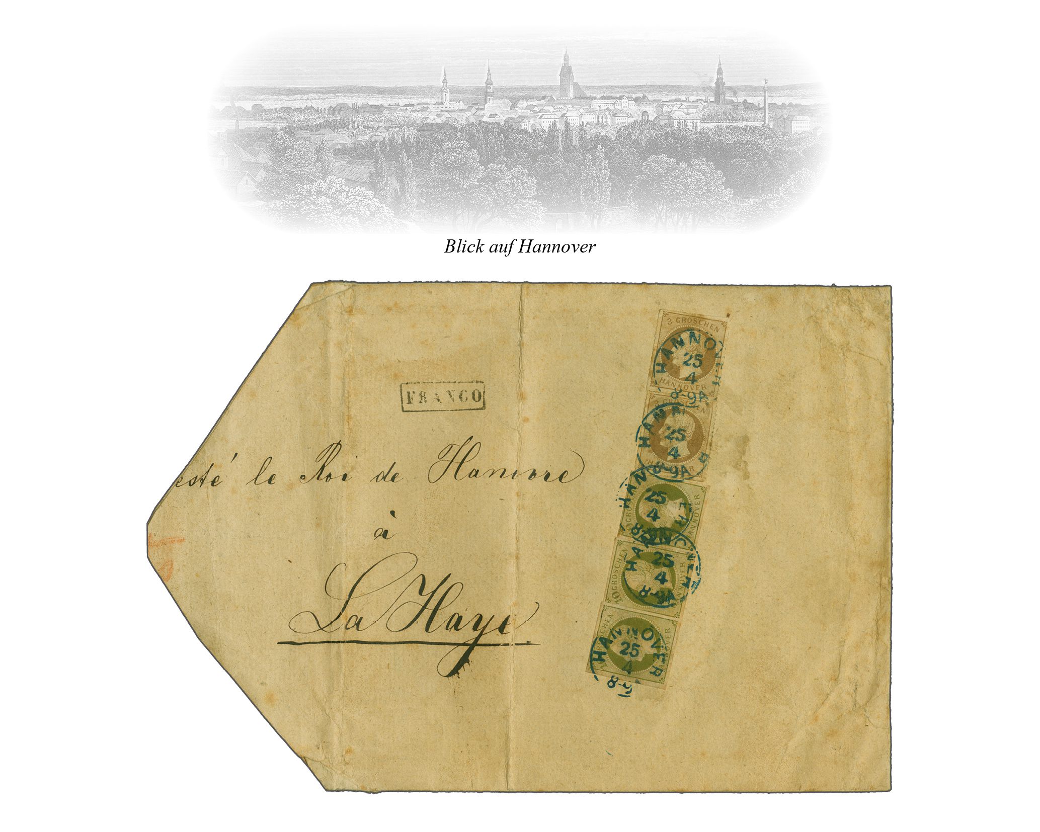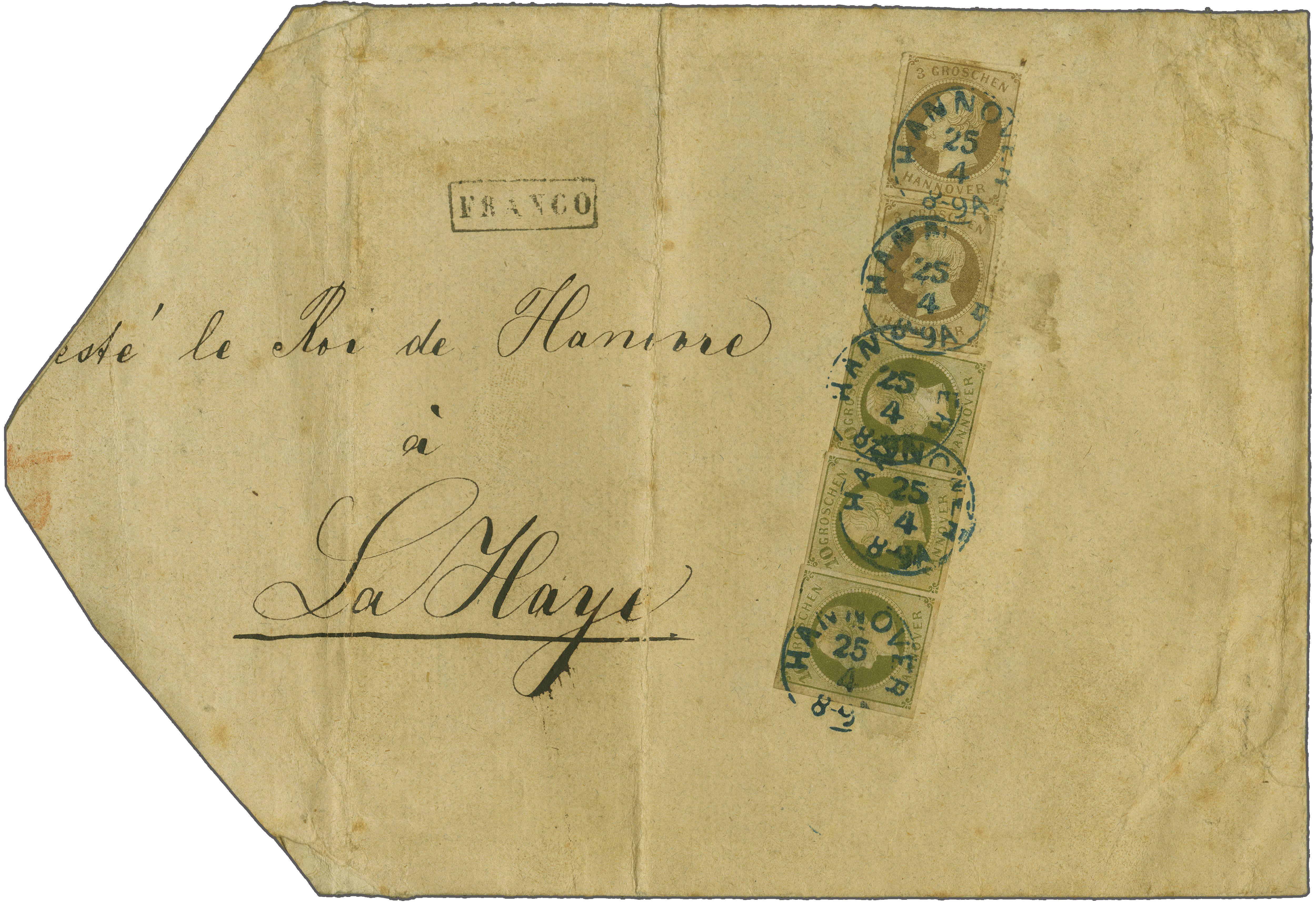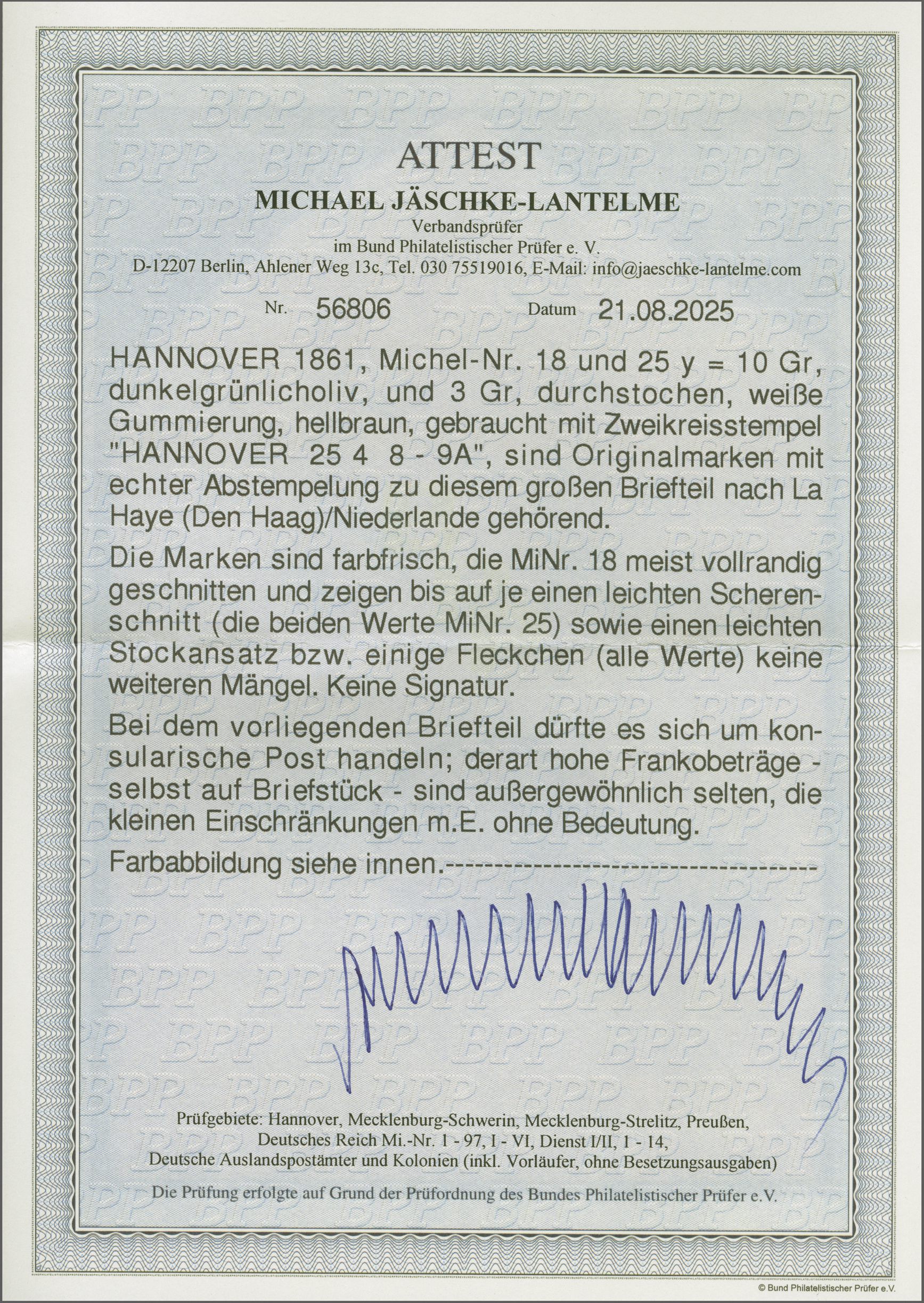 5186 cover imageHannover 1861: 10 Gr. dunkelolivgrün drei Werte meist vollrandig geschnitten und waagr. leicht treppenartig geklebt zusammen mit 3 Gr. hellbraun durchstochen (zwei Werte senkr. geklebt), alle sauber entw. mit blauem Zweikreisstp. 'HANNOVER 25.4. 8-9A' übergehend auf grossem Briefteil nach 'La Haye' (Den Haag) / Niederlande. Eine seltene Frankatur mit leichten Stockansatz und minimen Fleckchen auf grossem Briefteil, vermutlich konsularische Verwendung, mit rücks. Lacksiegel 'ANGELEGENHEITEN.KÖNIGL.HANNOV. MINISTERIUM DER AUS....'. Briefteil zweifach senkr. gefaltet. Gem. Attest Jäschke-Lanthelme sind derart hohe Frankobeträge selbst auf Briefstück aussergewöhnlich selten, die kl. Einschränkungen deshalb ohne Bedeutung. Attest Jäschke-Lantelme (2025) (Image 1) (Image 2) (Image 3) (Image 4)