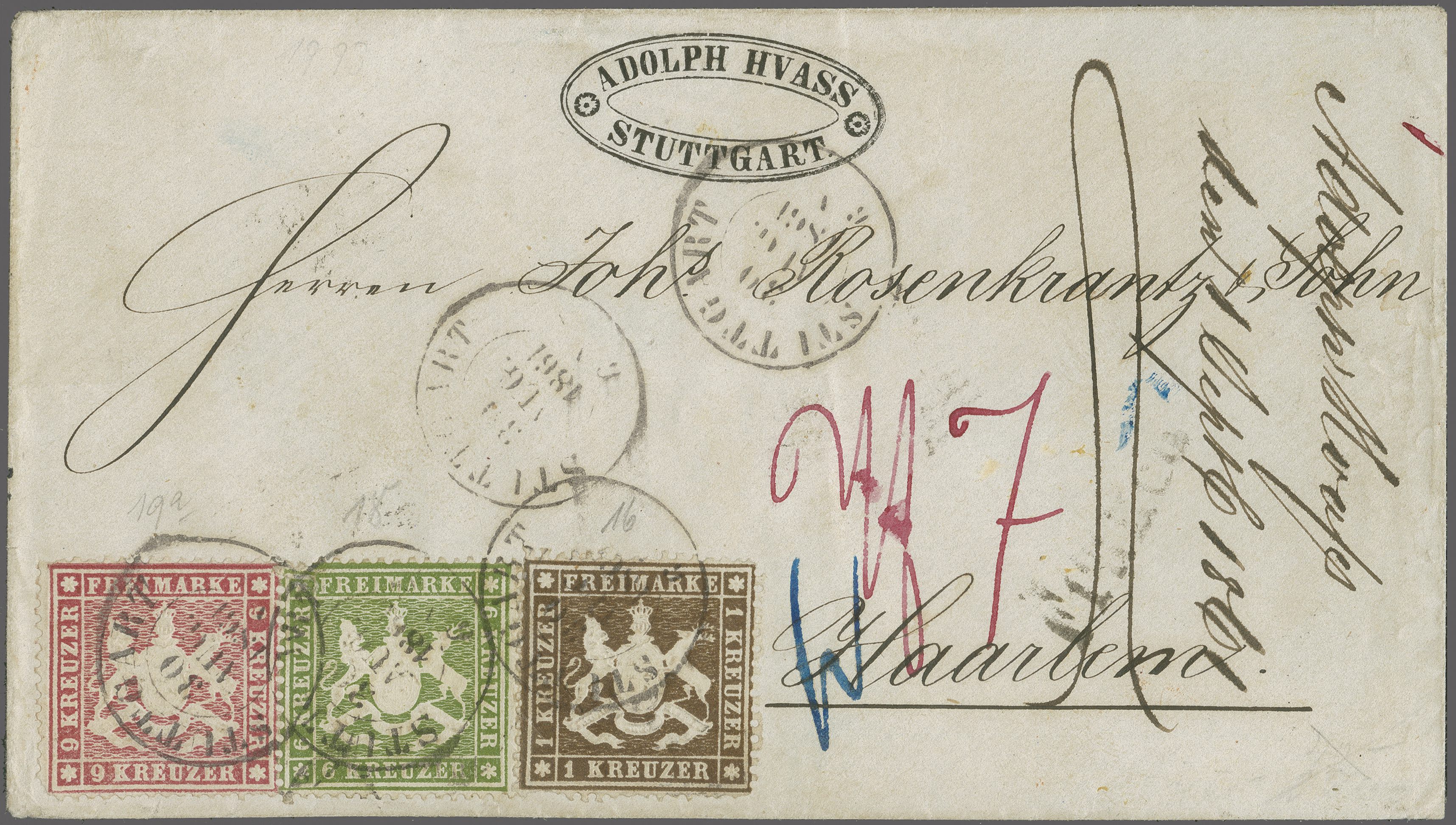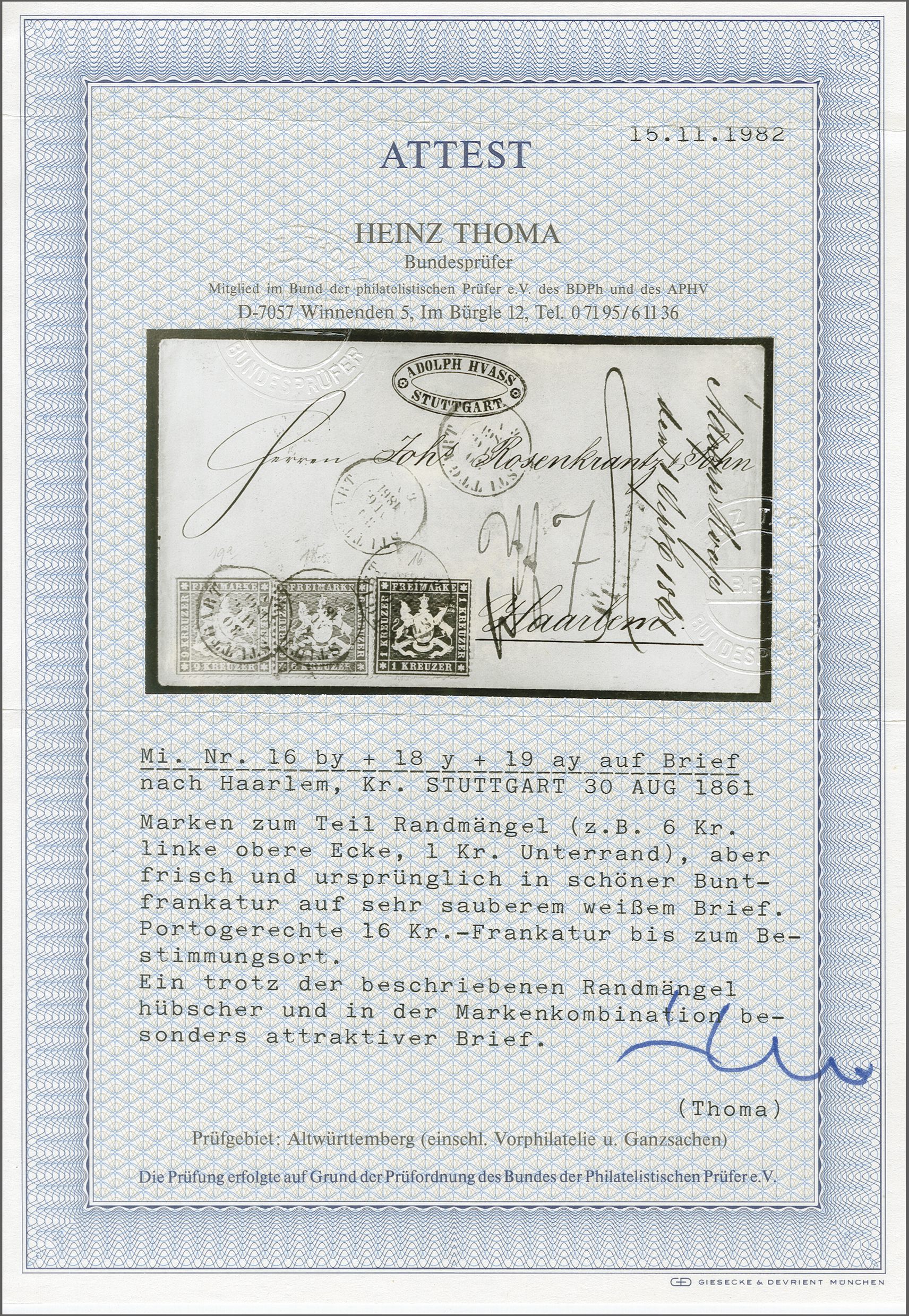 1689 cover imageWürttemberg 1861, dünnes Papier, 1 Kreuzer schwarzbraun, 6 Kreuzer grün und 9 Kreuzer karmin, im Streifen geklebt mit DKr. "STUTTGART 30 AUG. 1861" auf Briefhülle nach Haarlem, Niederlande, mit notiertem Weiterfranko von "7" Kreuzern. Die Frankatur teils Randmängel, aber in frischer, ursprünglicher Erhaltung. Eine äußerst seltene Dreifarben-Frankatur. Fotoattest Thoma BPP (1982) (Image 1) (Image 2) (Image 3)