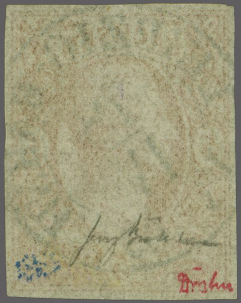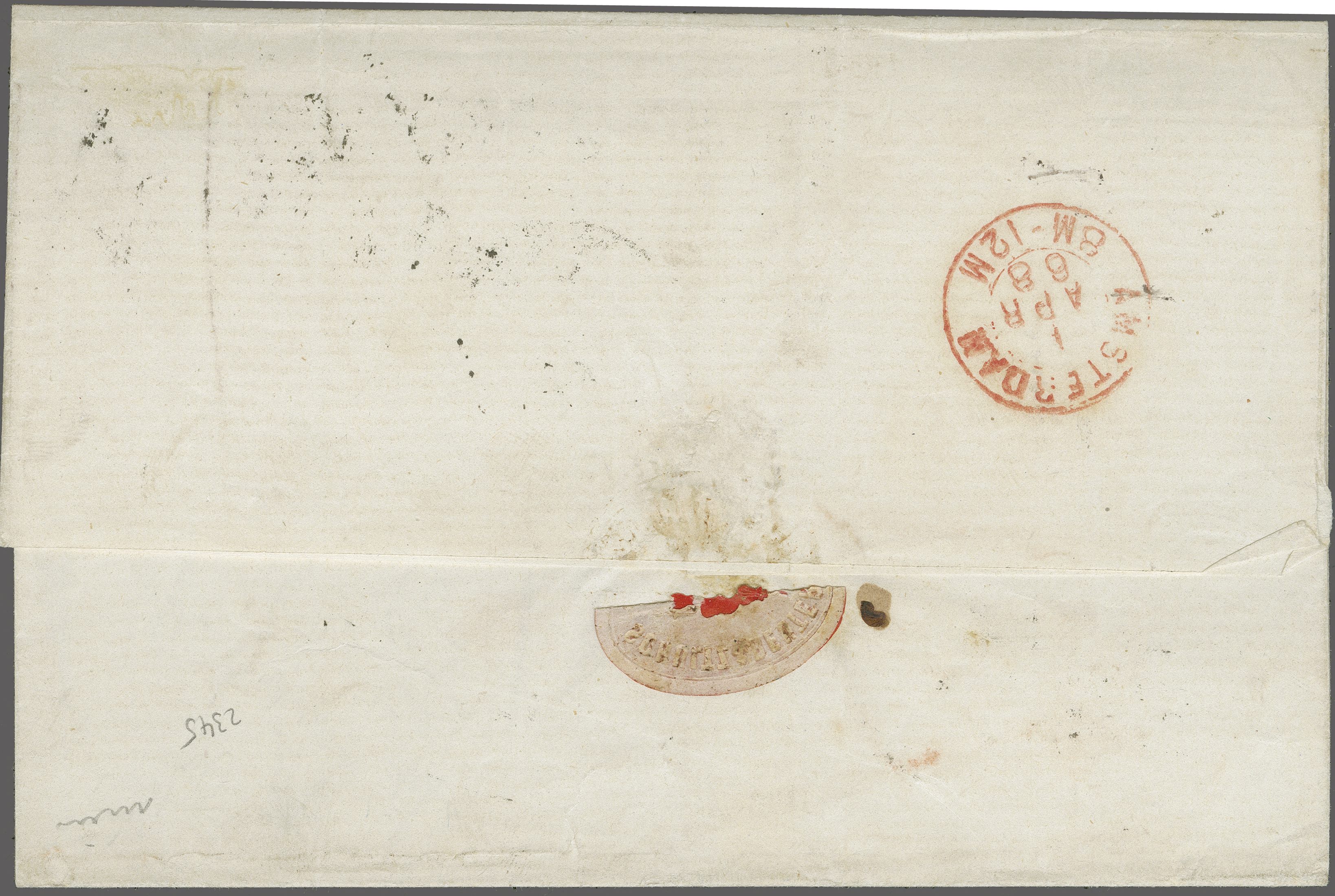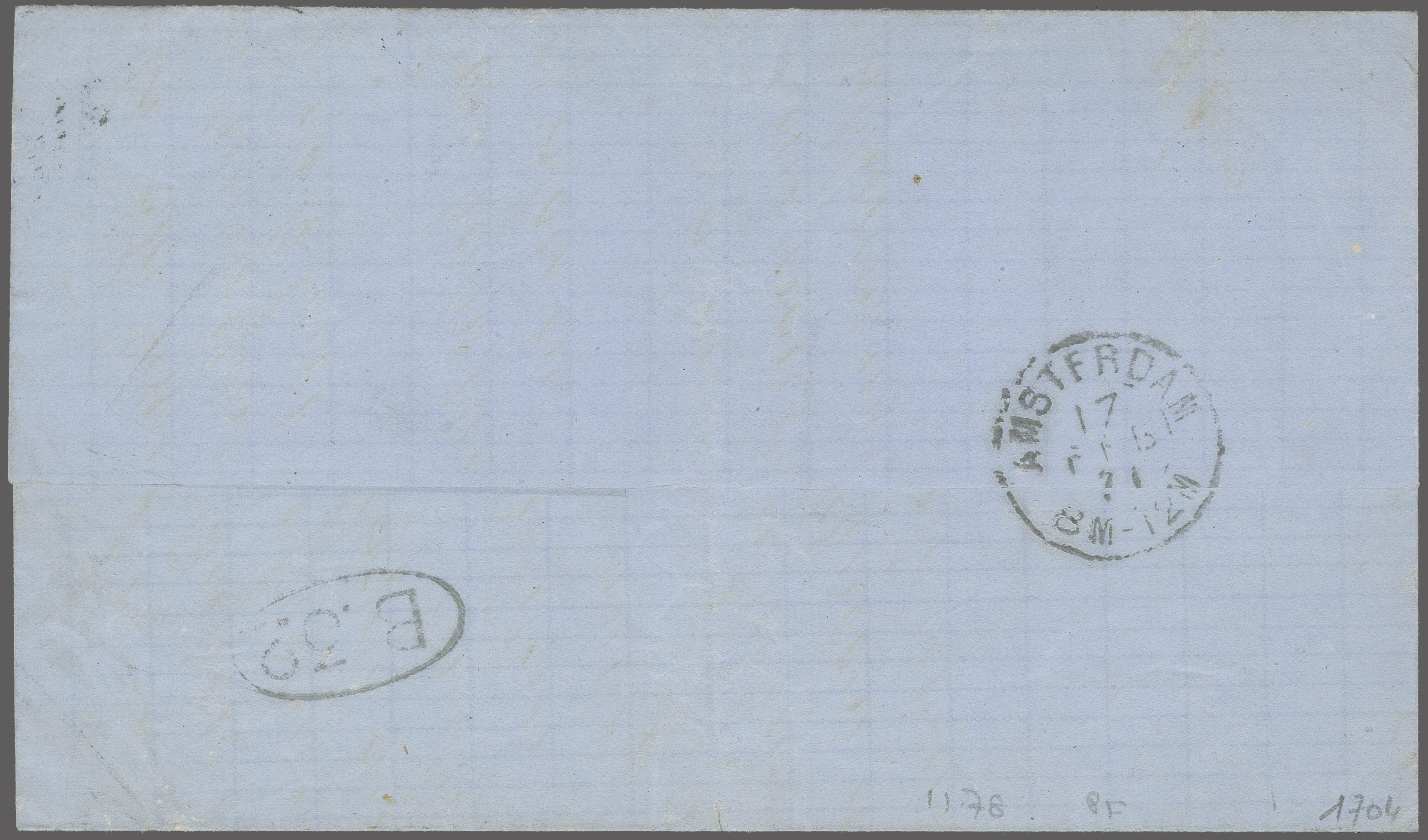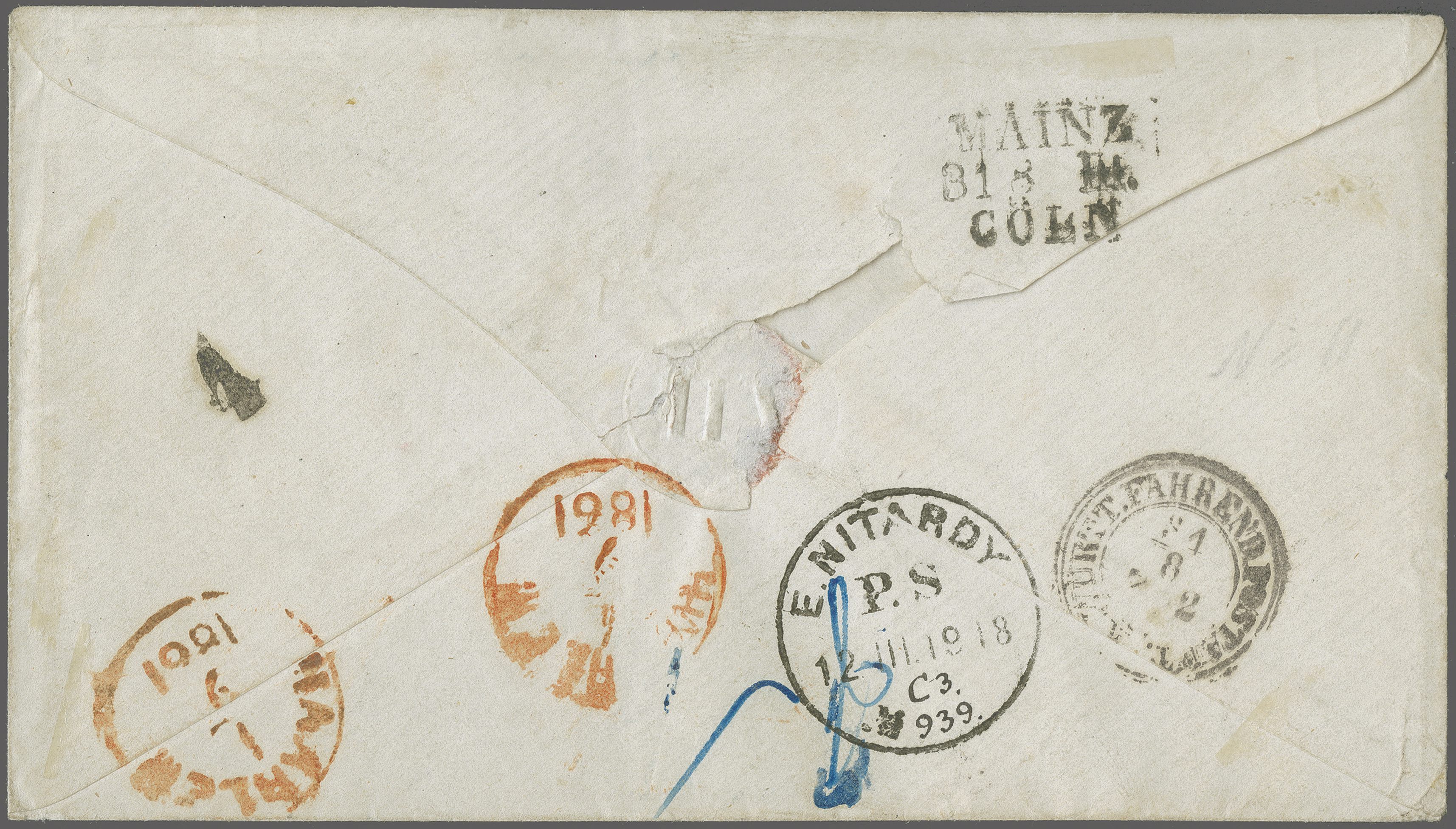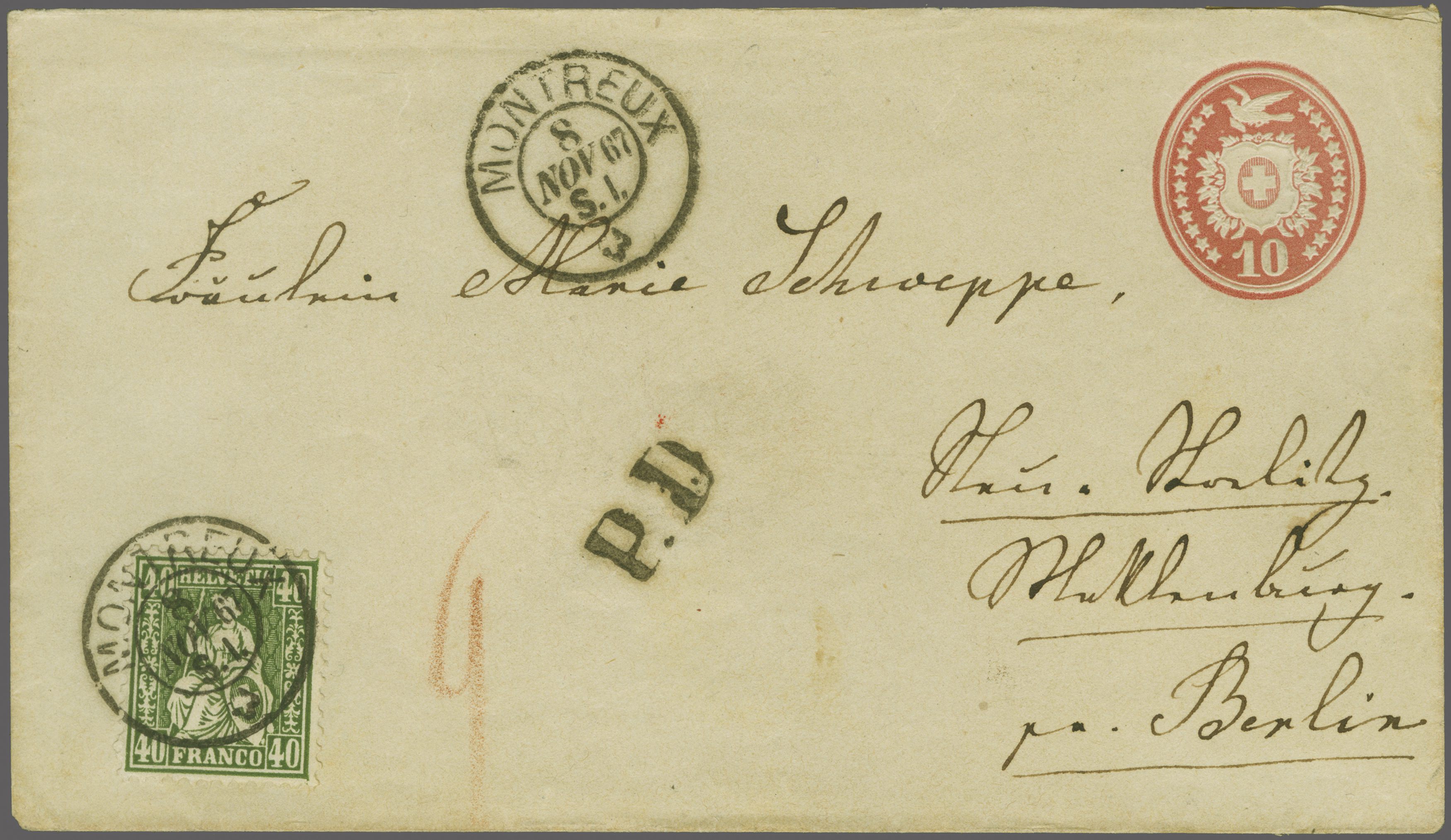 9038 cover imageDeutschland (Mecklenburg-Strelitz) 1867: 40 Rp. grün in einer satten, kräftigen Nuance, farbfr. und fehlerfrei gez. Luxusstück, klar und übergehend entw. mit kl. Zweirkeisstp. "MONTREUX 8. NOV. 67 S.1.", dieser zus. mit schwarzem "P.D" nochmals nebengesetzt, als Zusatzfrankatur auf Tüblibrief 10 Rp. rot nach Neu-Strelitz im damaligen Grossherzogtum Mecklenburg-Strelitz. Rücks. Bahnpoststp. "GENÈVE-SION 8.XI.67". Portogerechte Frankatur von 50 Rp. für einen Brief aus dem 2. Schweizer in den 3. vereinsländischen Rayon gemäss Postvertrag mit dem Deutsch-Österreichischen Postverein vom 15. Oktober 1852, wobei vorders. mit Rötel das deutsche Weiterfranko von "9" Konventionskreuzer (=30 Rappen) ausgewiesen ist. Ein ansprechender Brief aus der Periode der eigenen Posthoheit des Grossherzogtums Mecklenburg-Strelitz; Attest Eichele (2010). SGSSV: BU.002. Provenienz: Sammlung Felix Winterstein, Chiani-Auktion, Gossau (SG) November 1987 (Image 1) (Image 2)