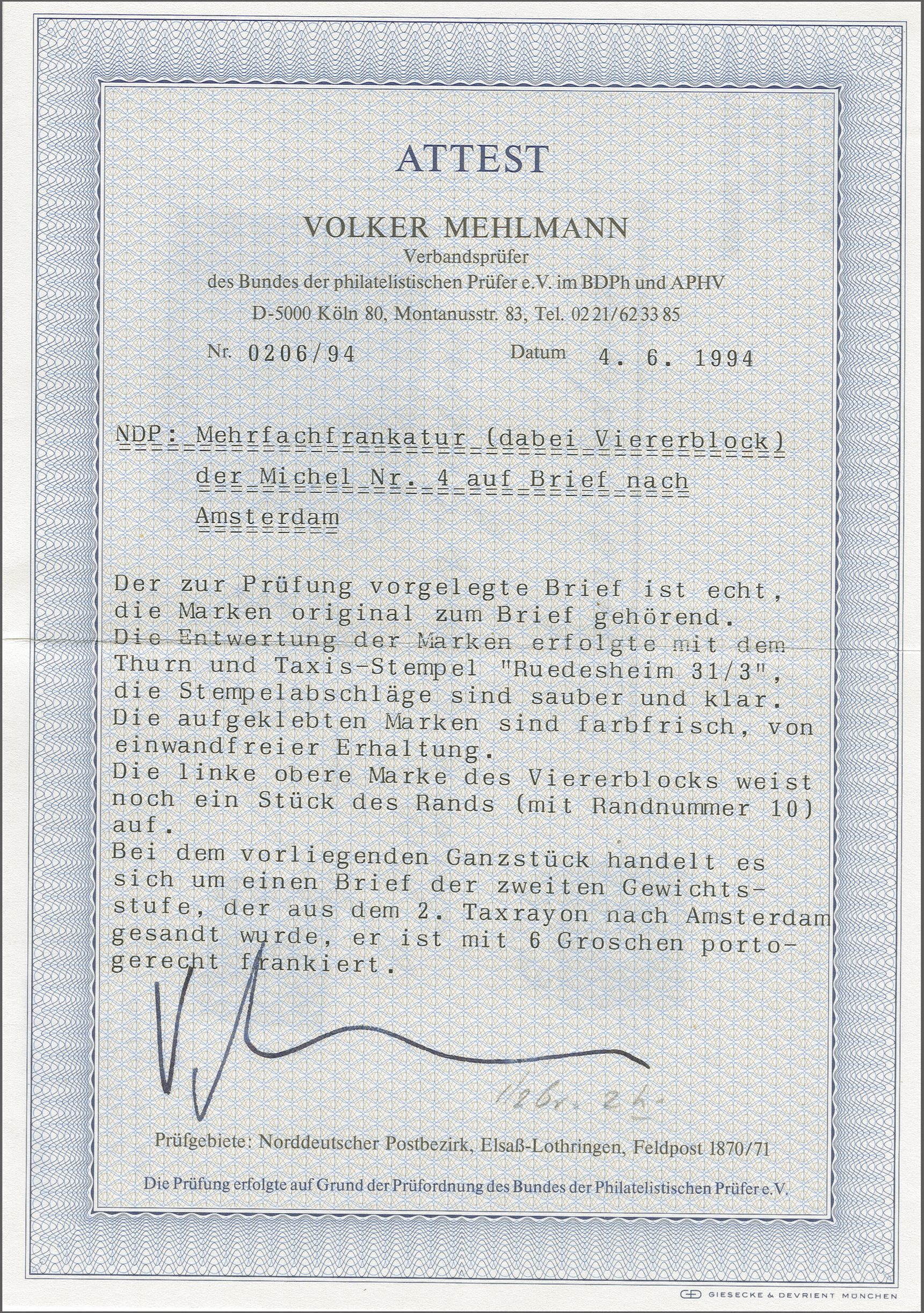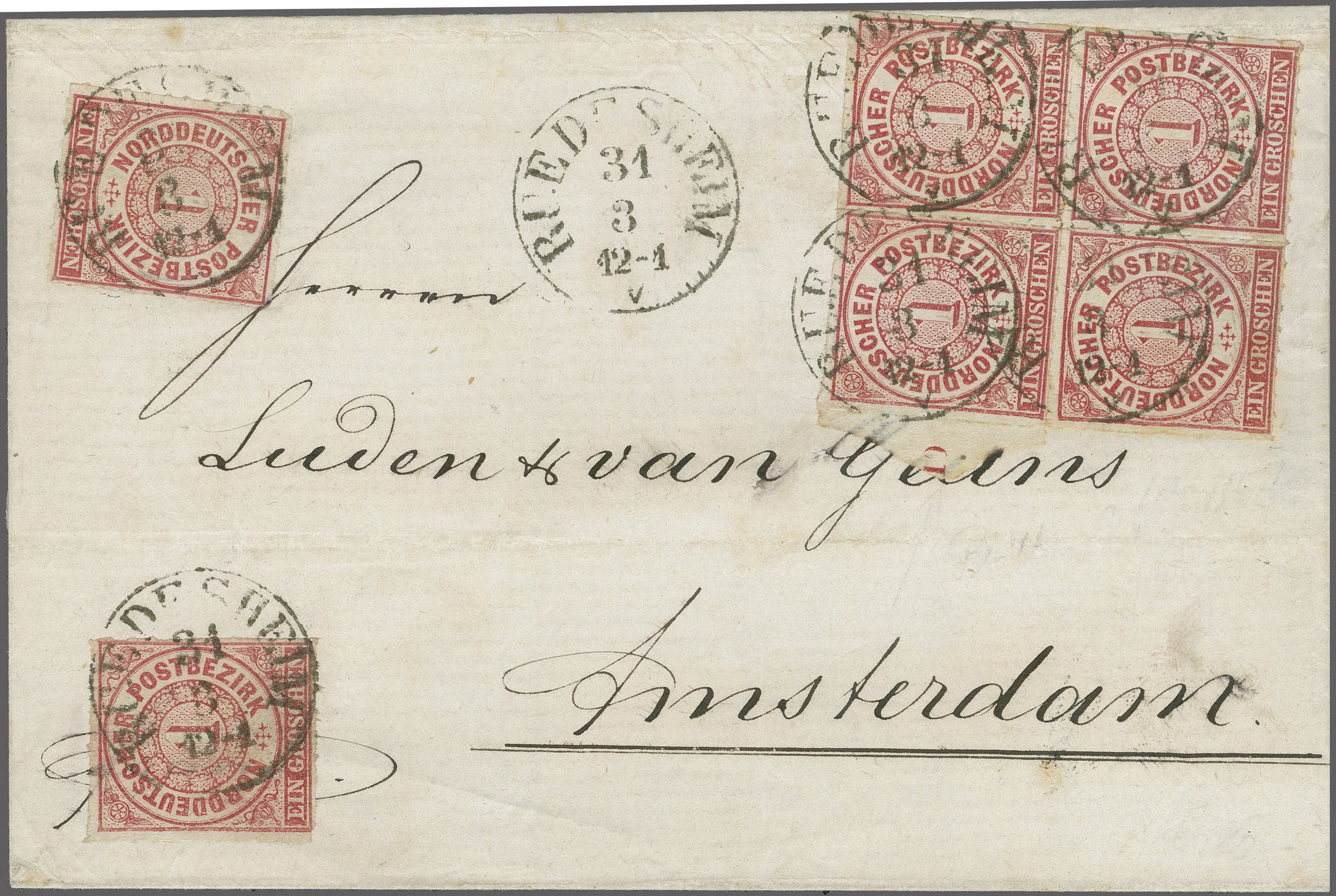 1692 cover imageNDP 1868, 1 Groschen karmin, Viererblock und 2 Einzelwerte, ein Wert des Viererblocks links mit Teil des Bogenrandes mit Reihenzähler "10", mit sauber auf- und nebengesetztem Taxis-EKr. "RÜDESHEIM 31 3" (1868) auf Briefhülle der 2.Gewichtsstufe nach Amsterdam. Schöne und einwandfreie Erhaltung. Eine attraktive und seltene Verwendung von Groschen-Marken im Kreuzerbezirk. Fotoattest Mehlmann BPP (1994) (Image 1) (Image 2) (Image 3)