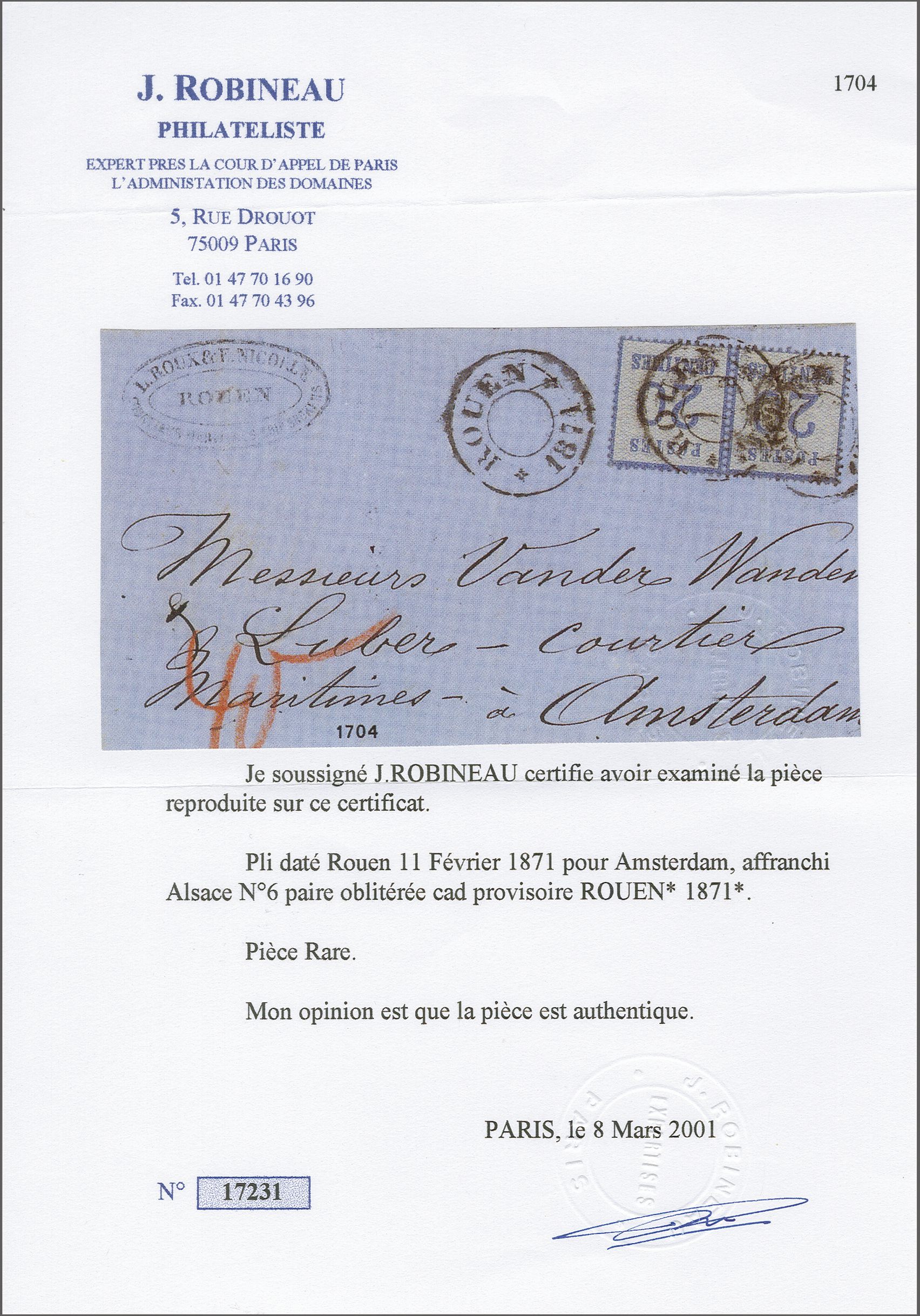 1693 cover image1870, 20 Centimes ultramarin im waagerechten Paar, mit provisorischem DKr. "ROUEN 1871" auf Briefhülle nach Amsterdam; korrekt frankiert nach dem Tarif mit Frankreich vom 1. April 1868. Attest Robineau (2001) (Image 1) (Image 2) (Image 3)