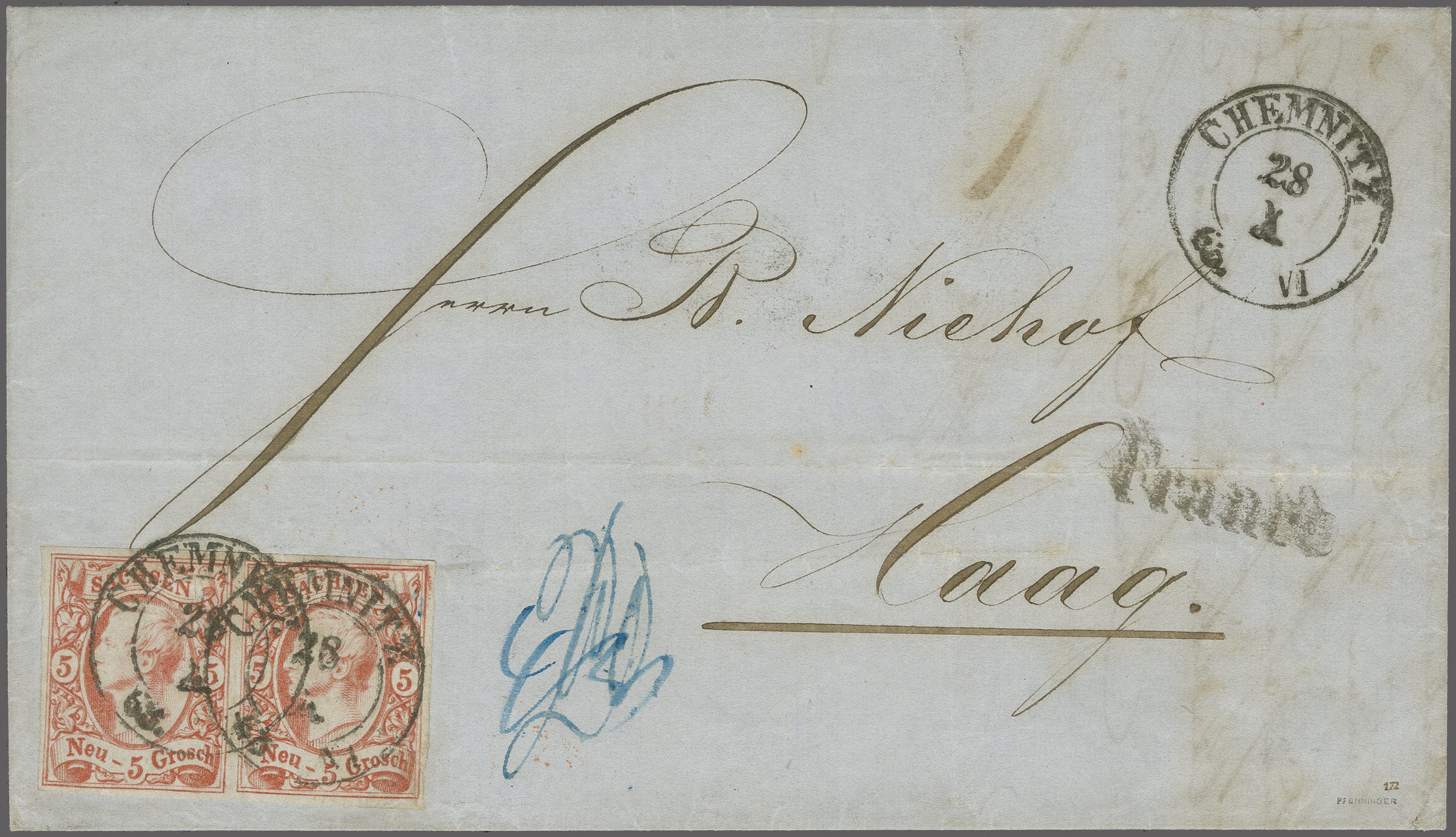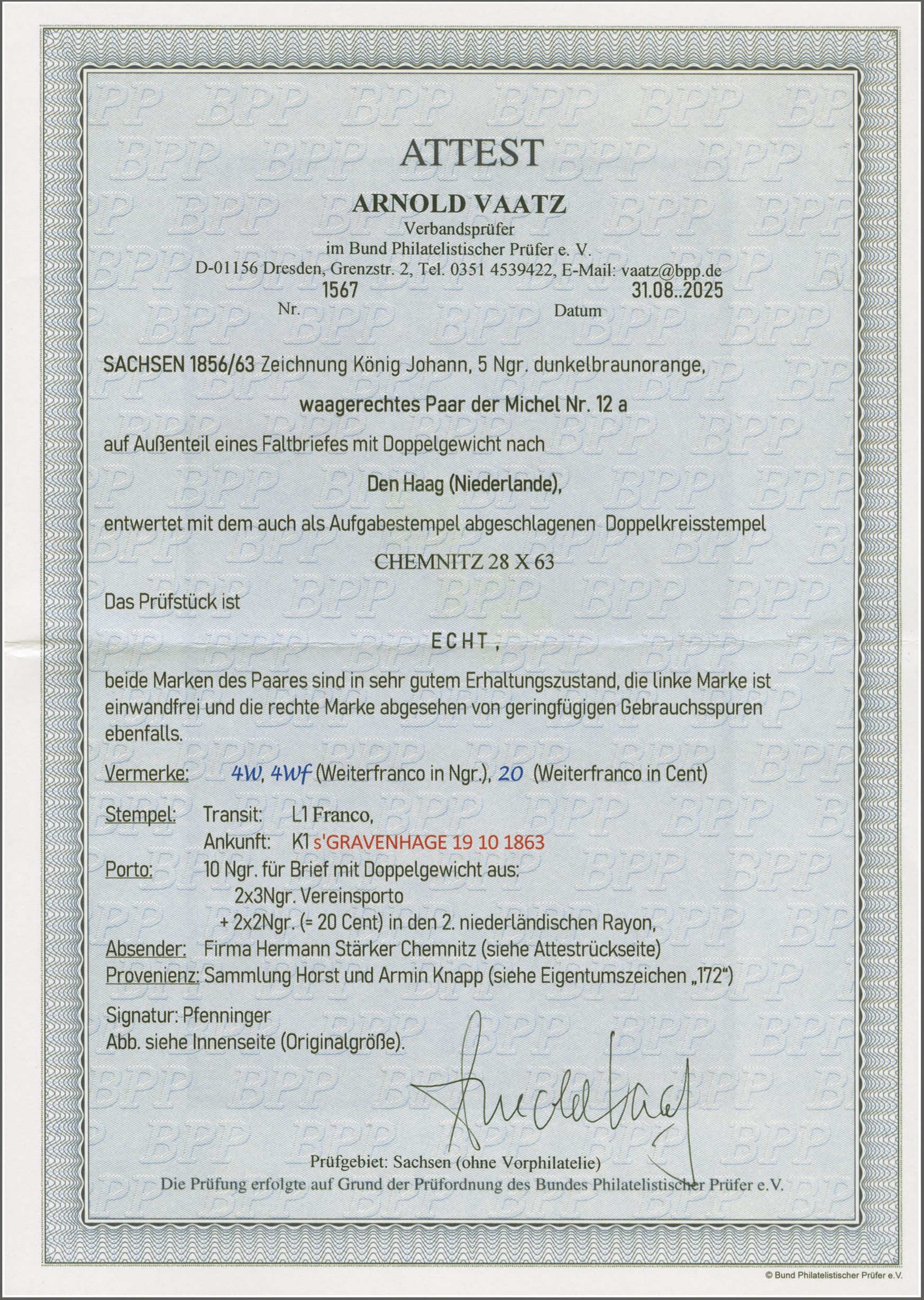 1685 cover image1856/63: Johann 5 Neugroschen dunkelbraunorange im waagerechten Paar, voll- bis breitrandig und farbfrisch, klar entw. mit Zweikreiser "CHEMNITZ 28 X 65" auf Briefhülle der 2. Gewichtsstufe nach Den Haag, mit Ankunftsstempel vom Folgetag. Die rechte Marke ganz schwache Knitterspur, sonst einwandfrei. Eine außerordentlich seltene Mehrfachfrankatur der 5 Neugroschen mit einem sehr schönen Paar. Signiert Pfenninger, Attest Vaatz (2025) Mi = € 1'500. Provenienz: Horst und Arnim Knapp, 344. Heinrich Köhler-Auktion (2011) (Image 1) (Image 2) (Image 3)