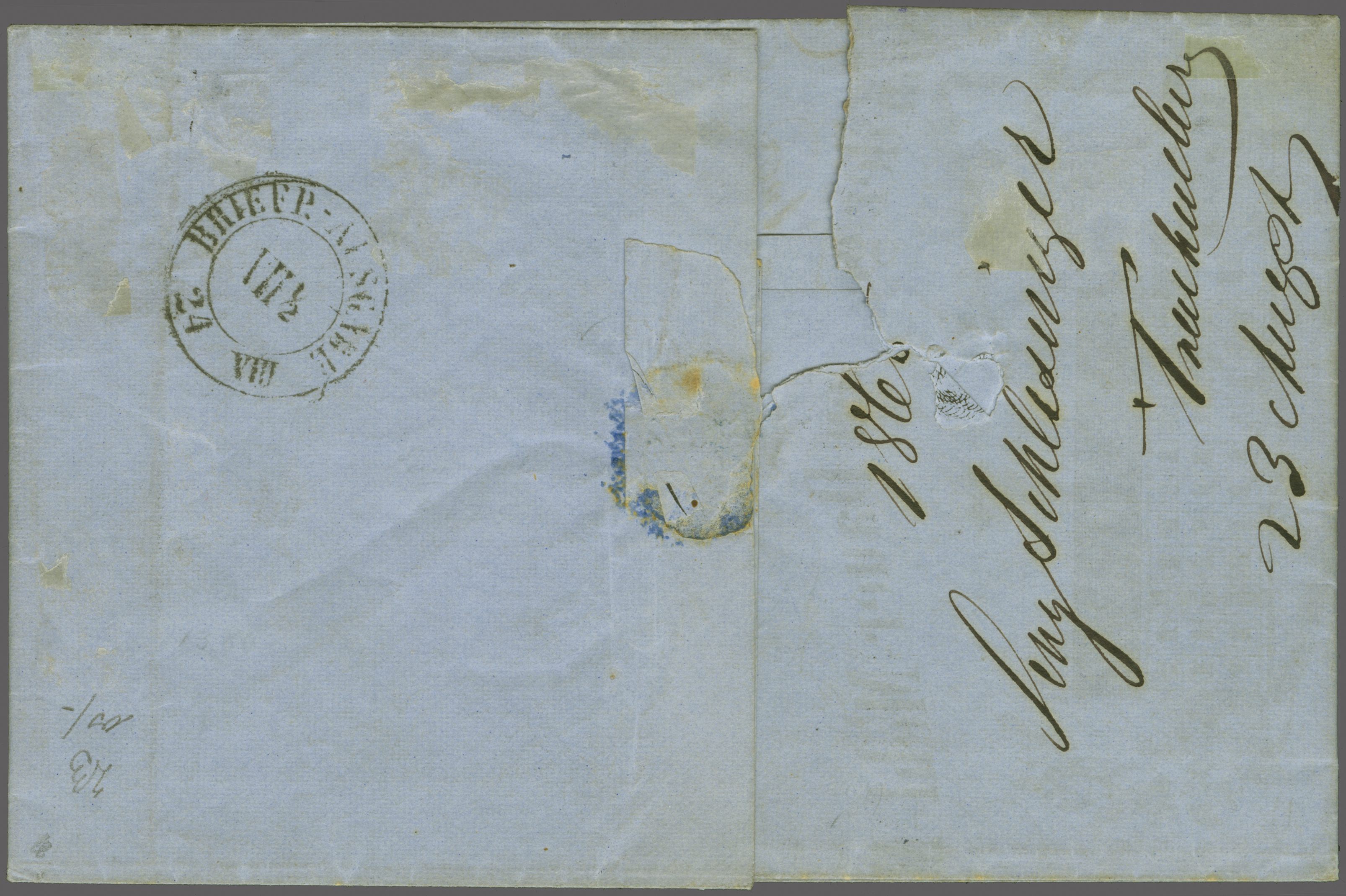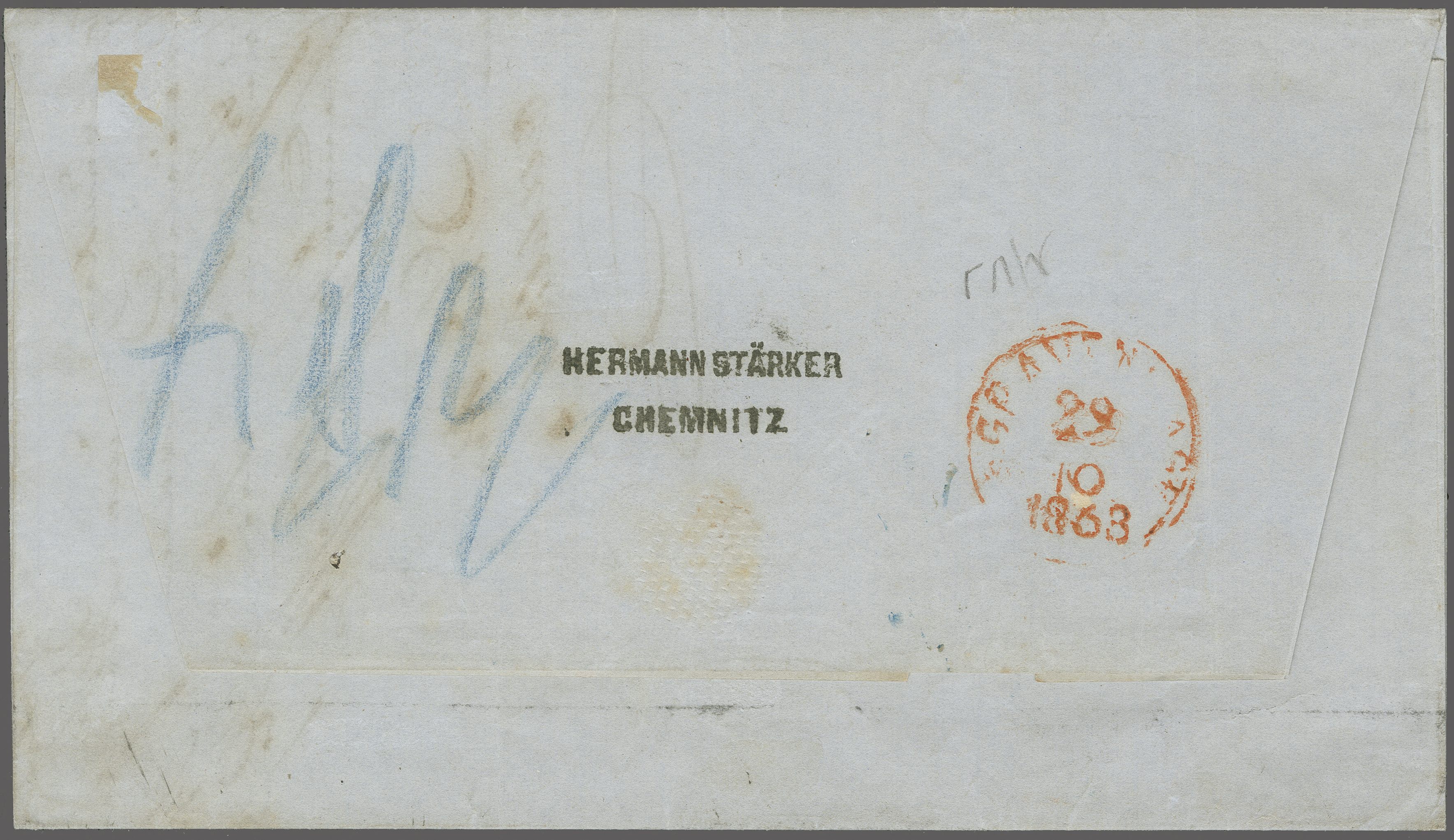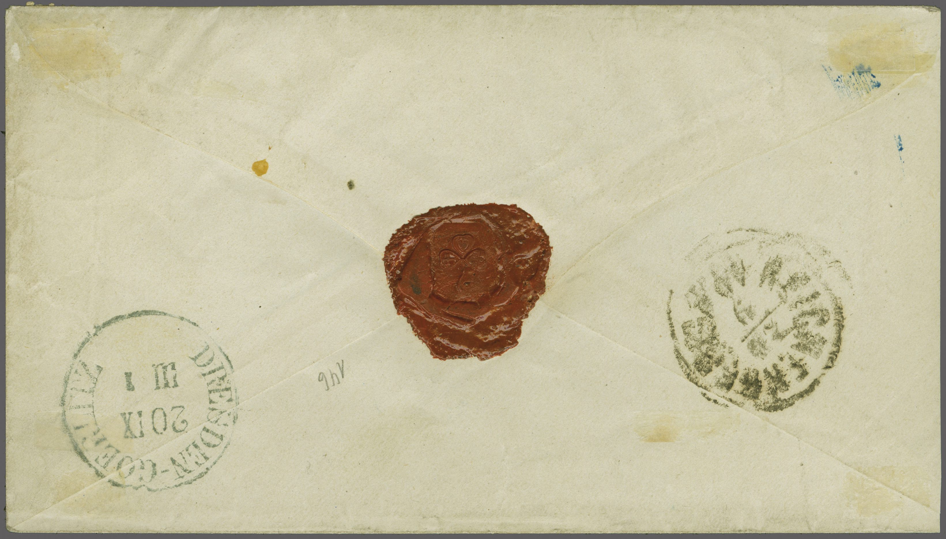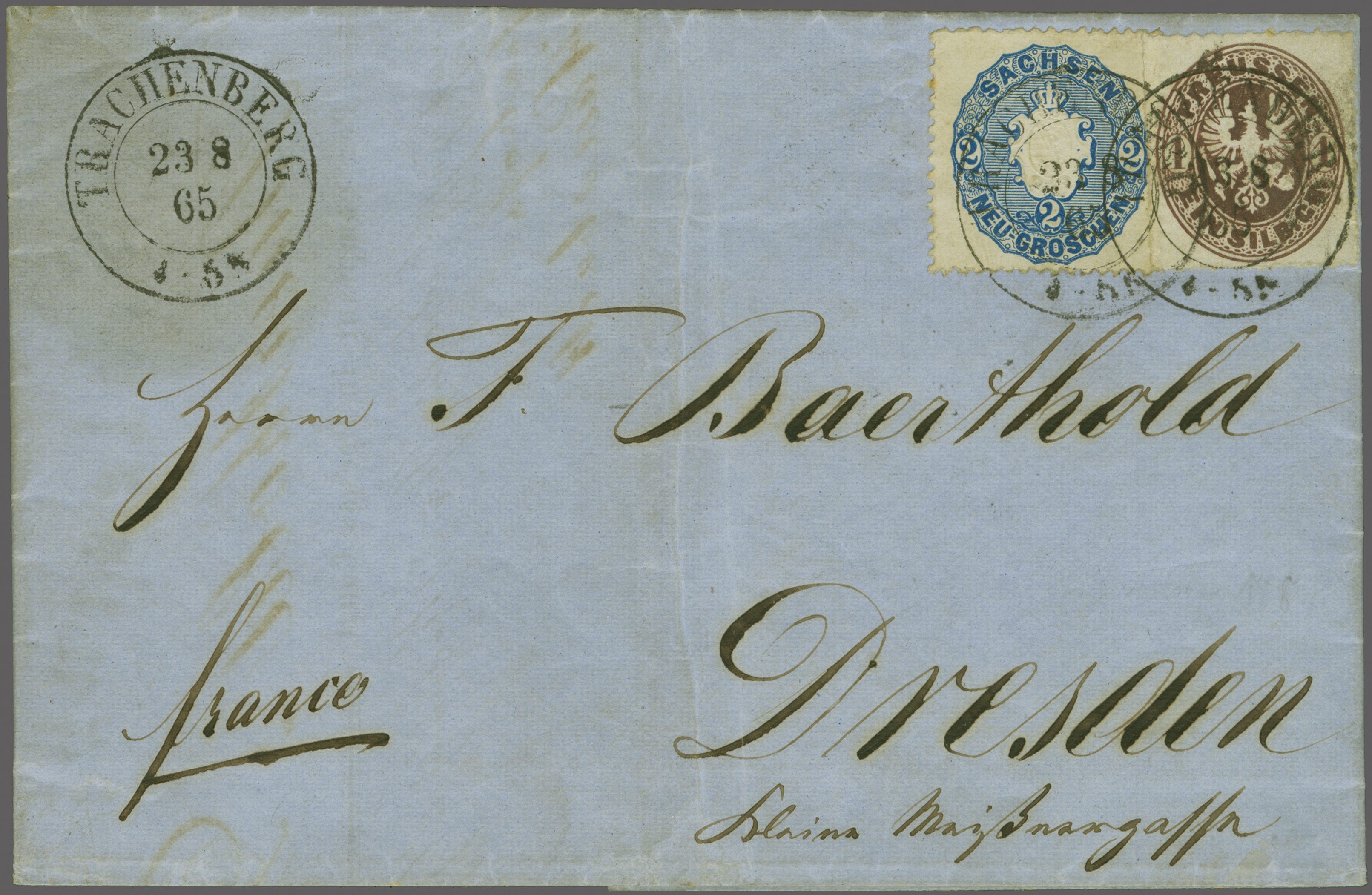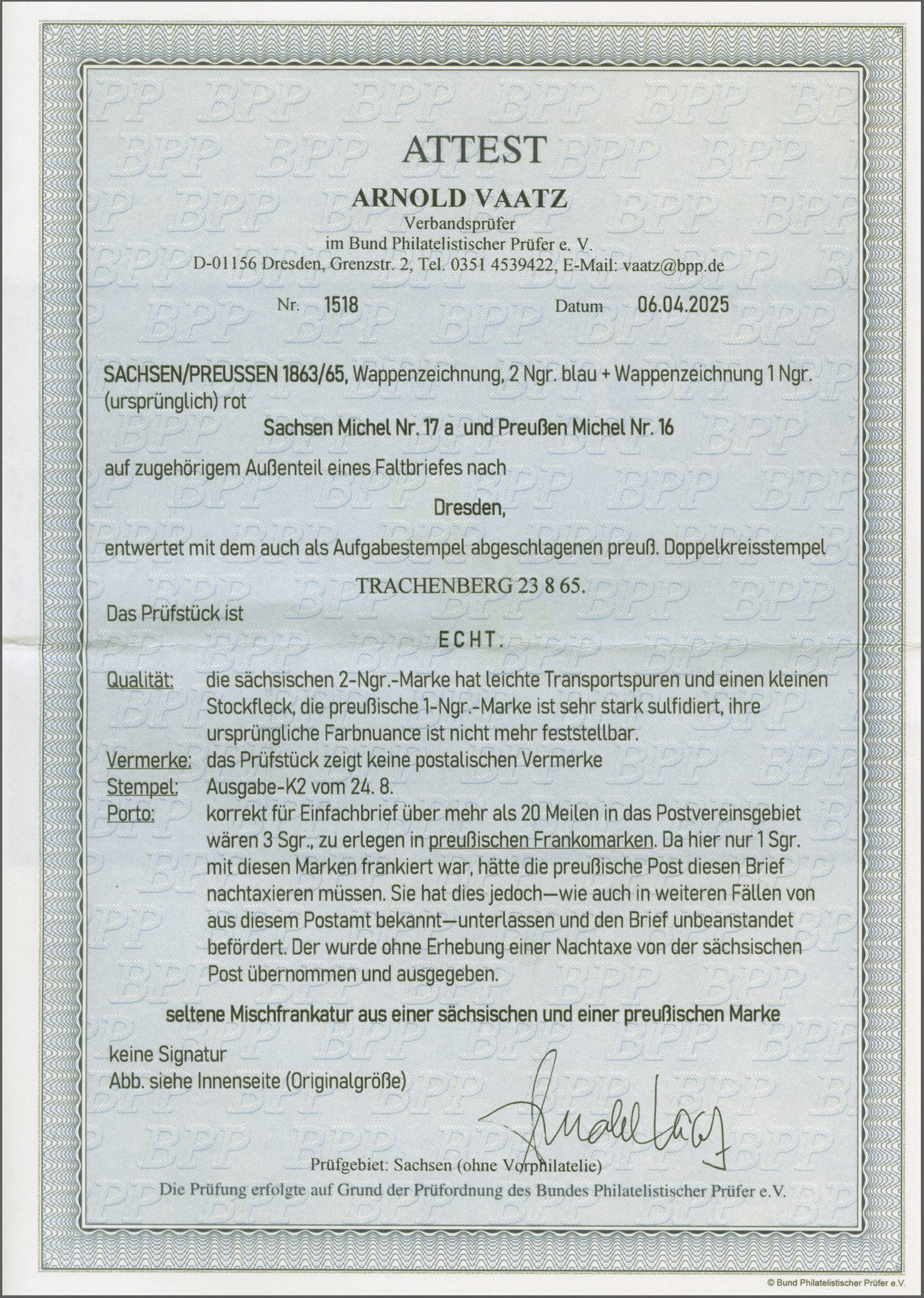 1687 cover imageMischfrankatur Sachsen / Preussen 1863/67: Wappen 2 Ngr. blau in Mischfrankatur mit Preussen 1861/65 1 Sgr. karmin, zwei farbfr. und gut gez. resp. durchstochene Einzelwerte, zartklar und übergehend entw. mit Zweikreisstp. "TRACHTENBERG 23 8 65", auf vollständigem Faltbrief nach Dresden mit rücks. Distributionsstp. der Briefausgabe vom Folgetag. 2 Ngr. mit leichten Transportspuren und winzigem Stockgleck, 1 Ngr. sehr stark sulfidiert. Eine aussergewöhnliche und seltene Frankatur aus Preussen heraus verwendet, die Mischfrankatur völlig unbeanstandet akzeptiert, ein Stück mit grosser Provenienz. Attest Vaatz (2025). Provenienz: Heinrich Köhler - Auktion 104 (Dezember 1939), Los 1481; Sammlung John R. Boker, Heinrich Köhler - Auktion 276 (März 1992), Los 398; Heinrich Köhler - Auktion 302 (Januar 1999), Los 547 (Image 1) (Image 2) (Image 3) (Image 4)