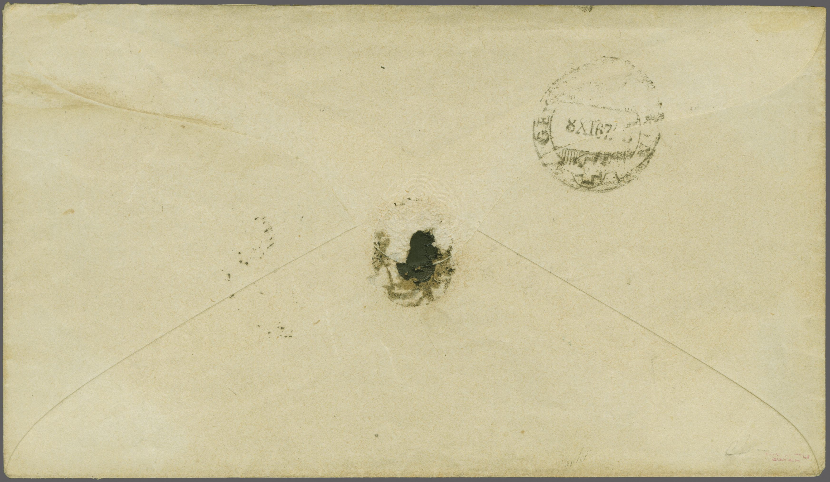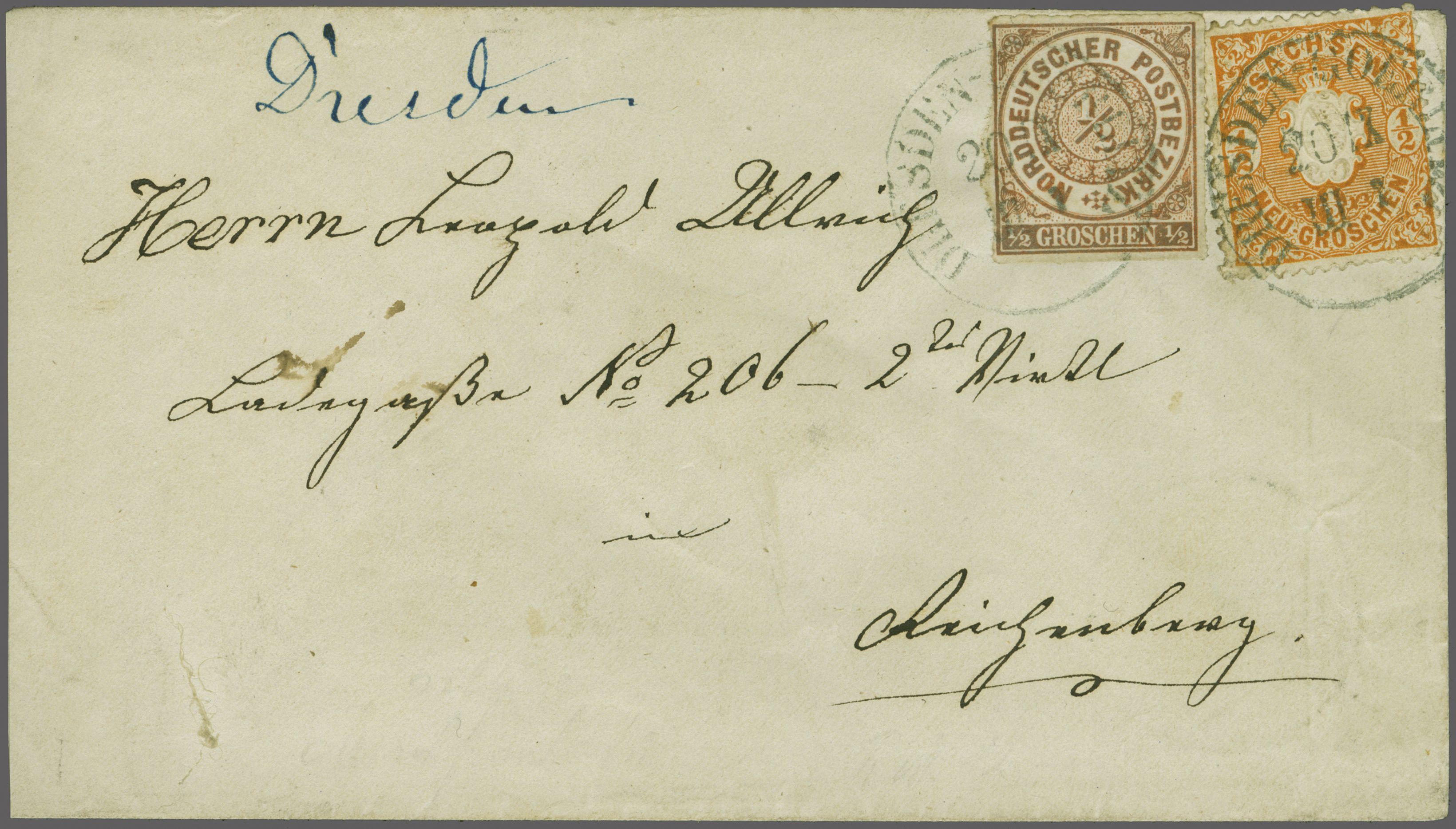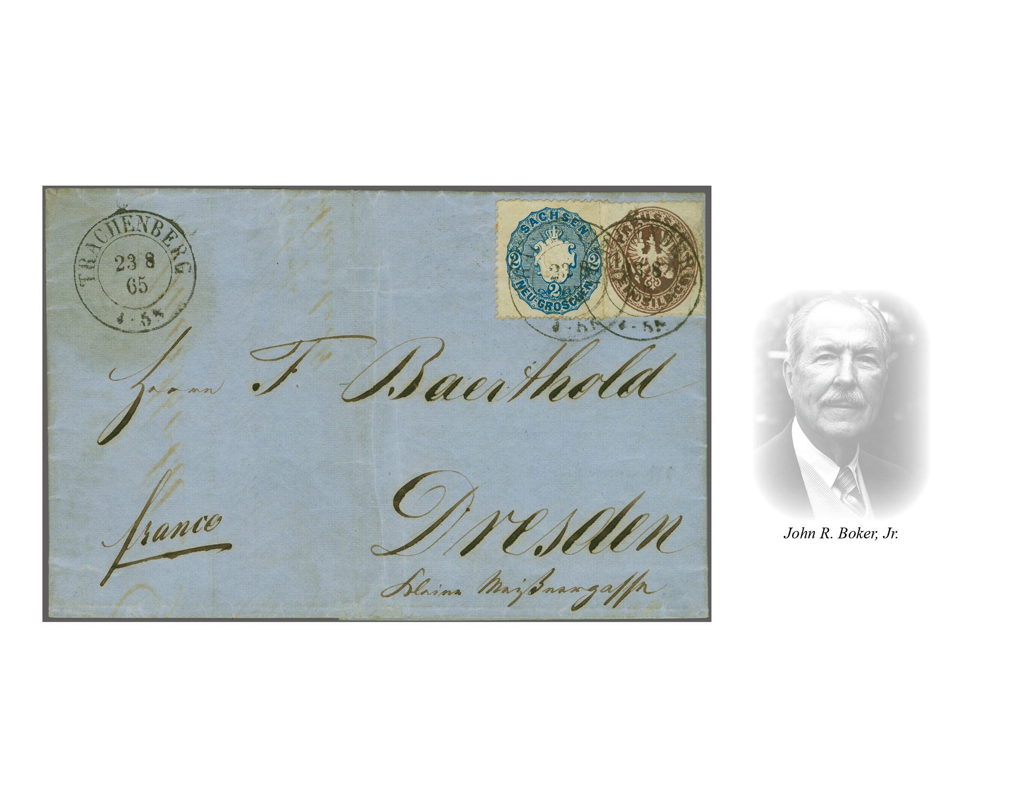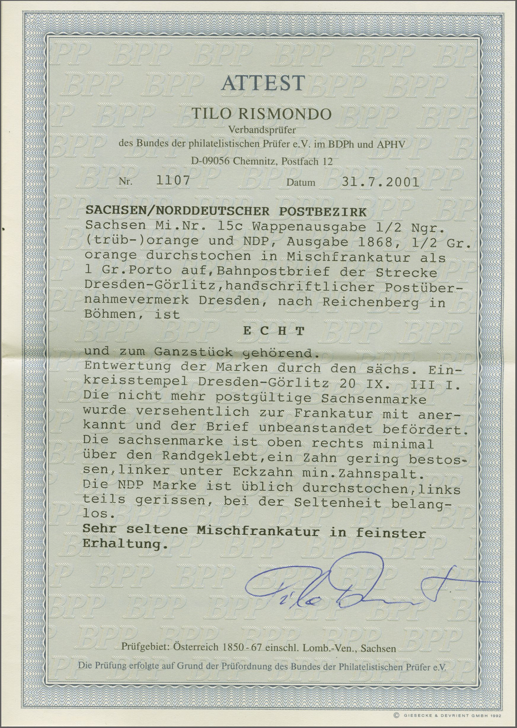 1686 cover imageMischfrankatur Sachsen / Norddeutscher Postbezirk 1863/67: Wappen ½ Ngr. orange in Mischfrankatur mit NDP 1868 ½ Sgr. orange, zwei vorab gut gez. resp. durchstochene Einzelwerte, zart und übergehend entw. mit Einkreisstp. "DRESDEN - GÖRLITZ 20 IX / III", handschriftlicher Aufgabevermerk "Dresden" auf Umschlag nach Reichenberg in Böhmen mit rücks. Ankunftsstp. vom gleichen Tag. Beide Marken mit minimen Einschränkungen, die Marke des NDP stark oxidiert, bei der Seltenheit der Frankatur belanglos. Aussergewöhnlich, da die nicht mehr gültige Sachsen-Marke durch ein Versehen zur Frankatur mit anerkannt wurde, die Mischfrankatur völlig unbeanstandet akzeptiert, ein Stück mit grosser Provenienz. Attest Rismondo (2001). Provenienz: Sammlung John R. Boker, Heinrich Köhler - Auktion 255 (März 1987), Los 245; Heinrich Köhler - Auktion 311 (Januar-Februar 2001), Los 263 (Image 1) (Image 2) (Image 3)