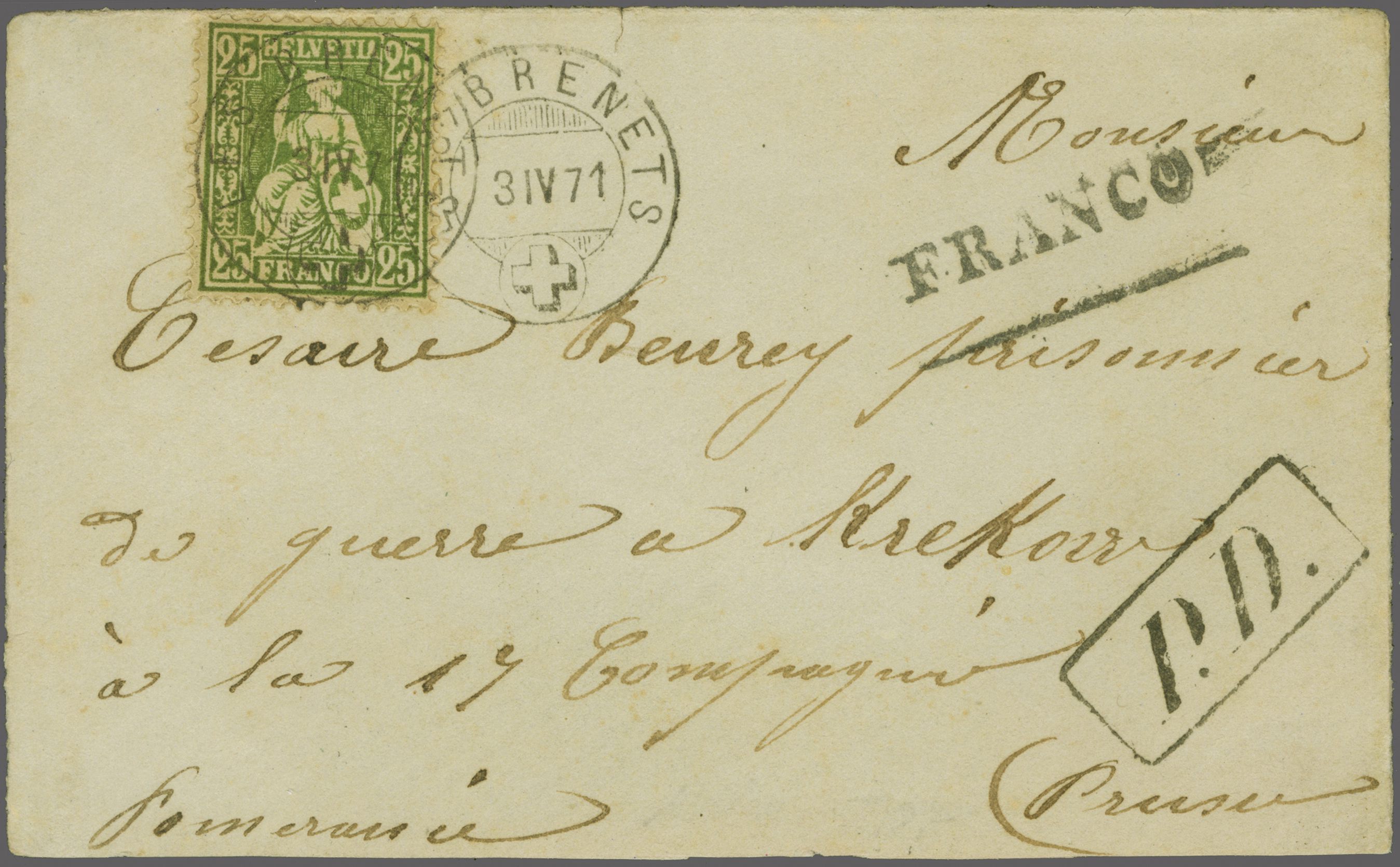 9039 cover imageDeutschland (Pommern/Preussen) 1871: 25 Rp. grün, farbfr. und gut gez., sauber und übergehend entw. "LES BRENETS 3.IV.71" mit nebenges. kursivem "P.D." im Kästchen des IV. Postkreises (AW 375) sowie einseitig gefasstem "FRANCO" deutscher Herkunft auf kleinformatigem Briefcouvert an einen französischen Kriegsgefangenen in Krekow, Pommern. Ab dem 1. September 1870 galt in Deutschland für Post an Kriegsgefangene grundsätzlich portofreiheit, womit der Brief um den vereinsländischen Anteil von 15 Rappen überfrankiert wäre. Ein seltener und interessanter Kriegsgefangenenbrief während des Deutsch-Französischen Krieges; Attest Eichele (2019). Provenienz: Sammlung "Bismarck", 263. Corinphila-Auktion, Zürich Januar 2021, Los 8520; Sammlung Raymond Pittier (Image 1) (Image 2)