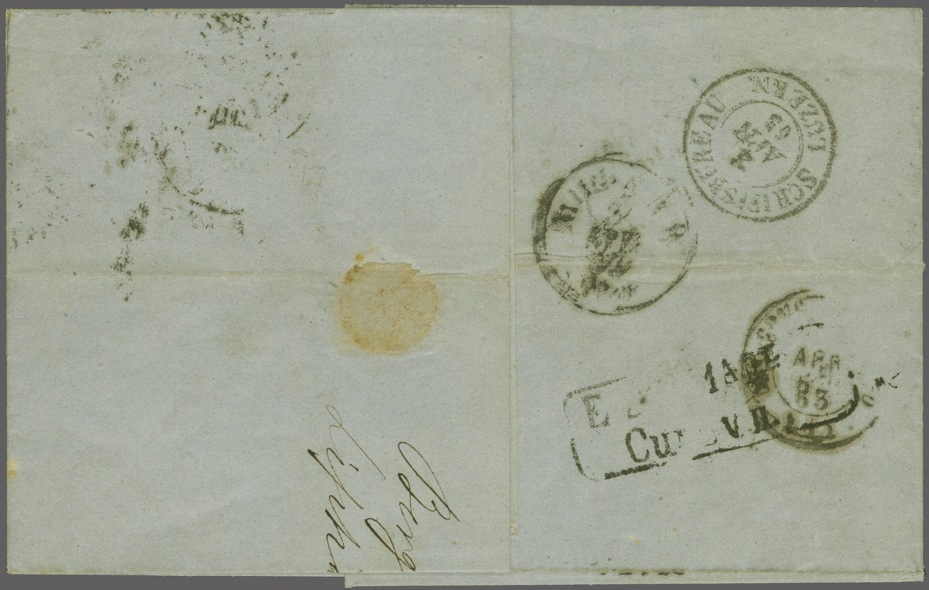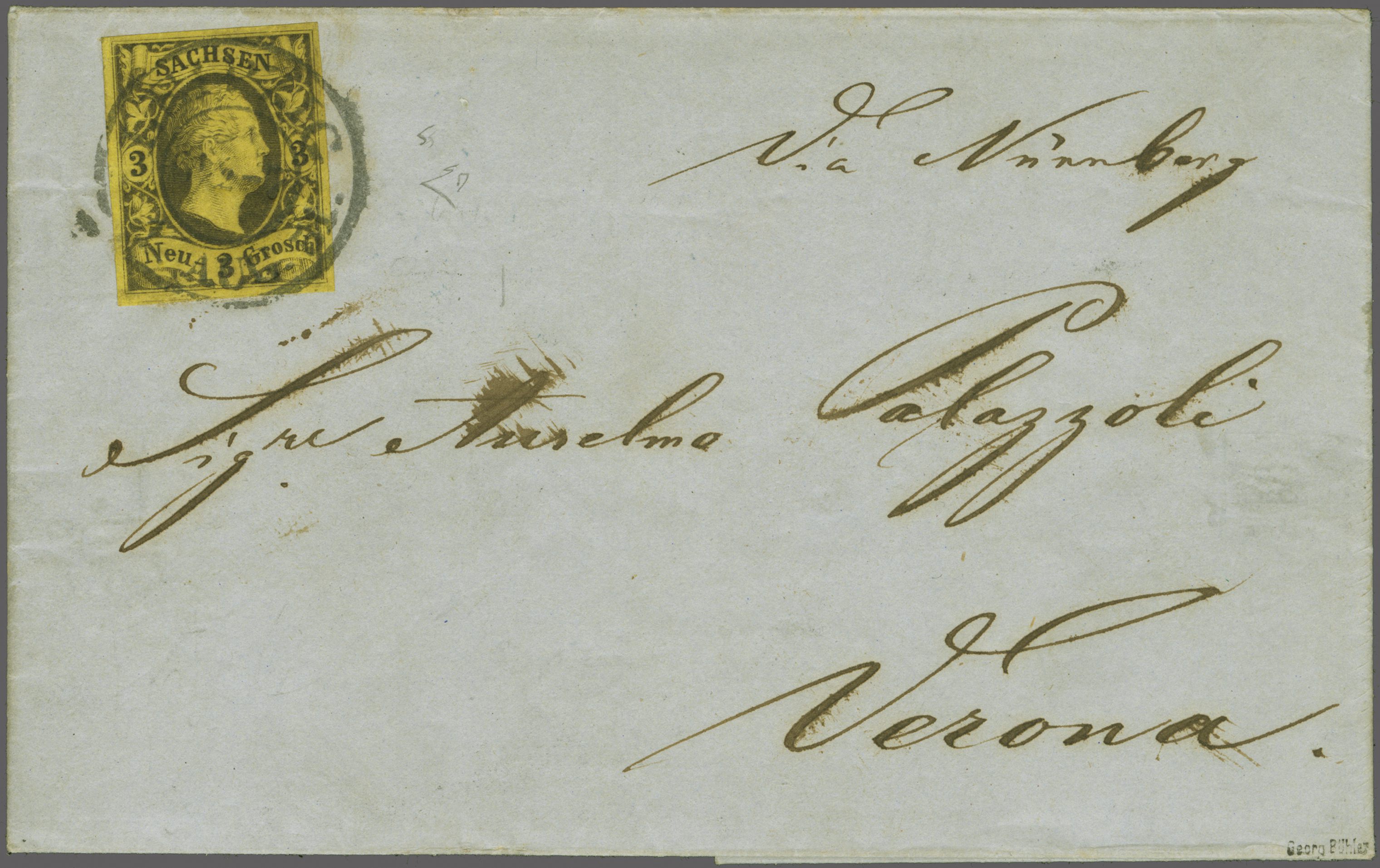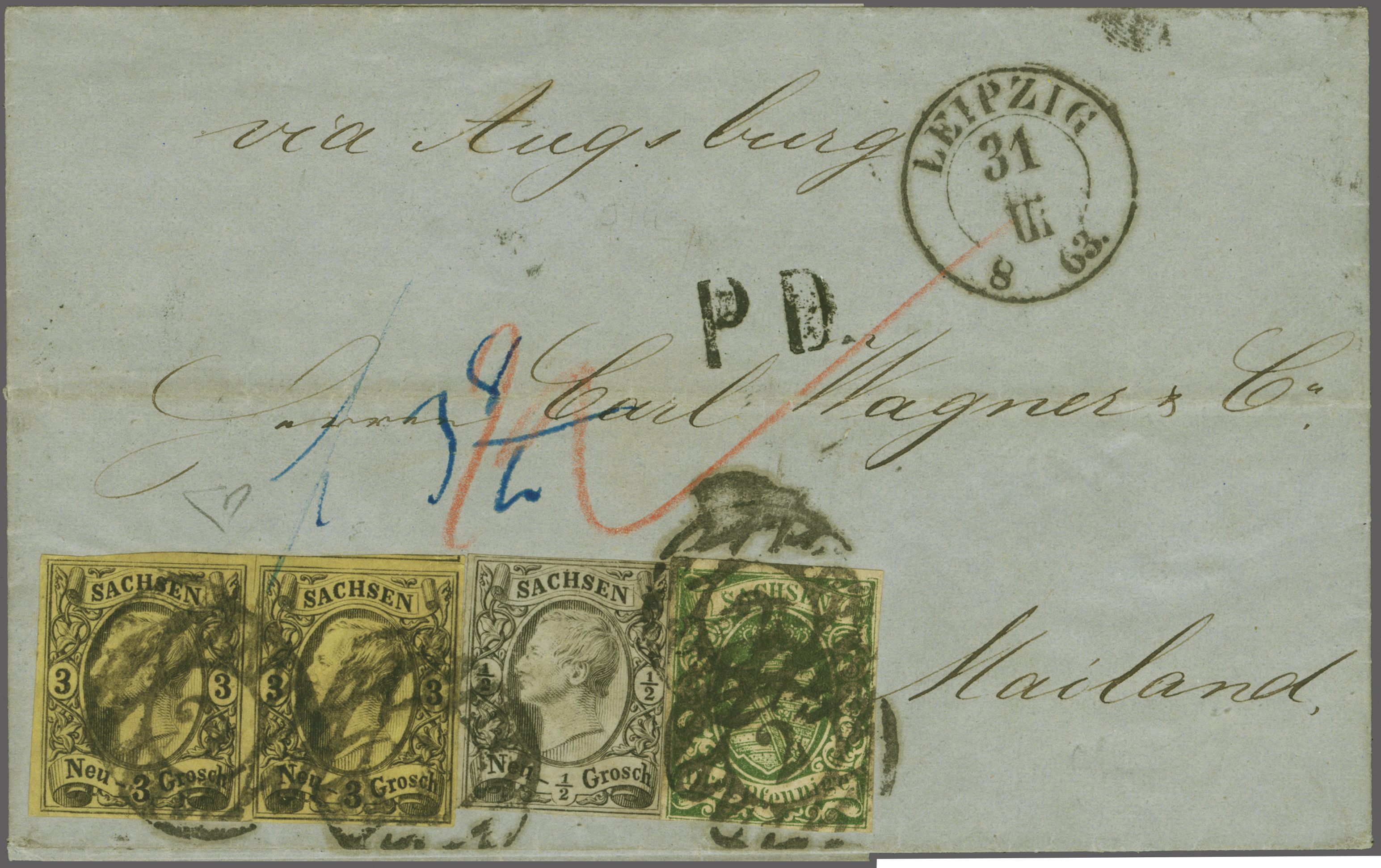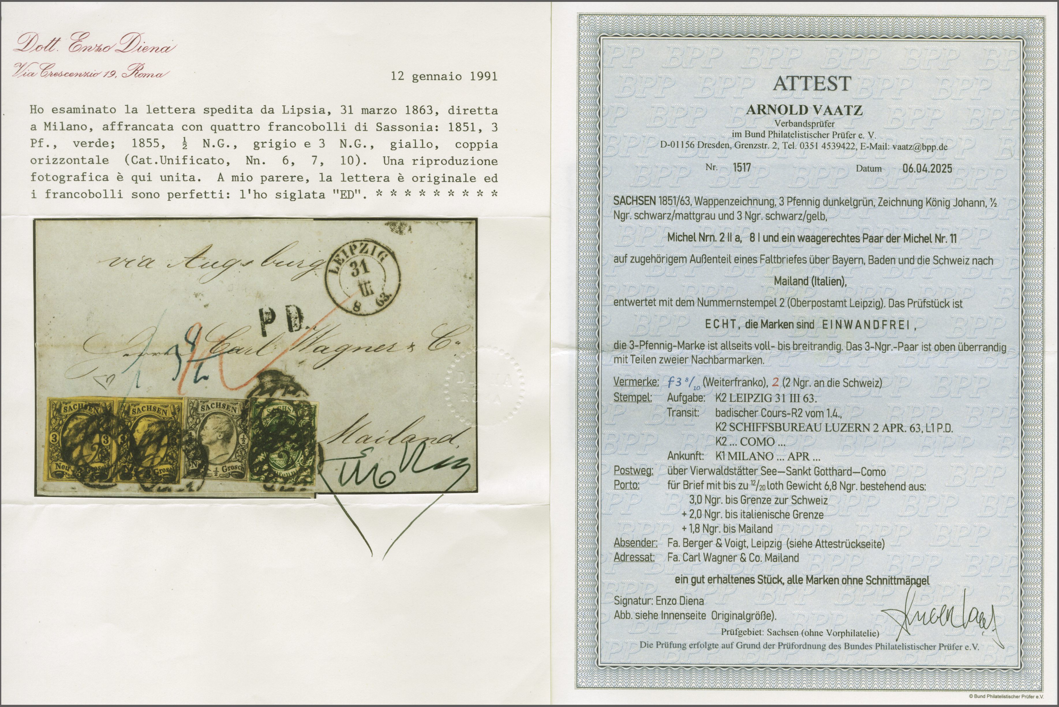 1682 cover image1851/63: Wappen 3 Pfg. dunkelgrün, spätere Auflagen in Mischfrankatur mit 1855/63 König Johann ½ Ngr. schwarz auf mattgrau und Paar 3 Ngr. schwarz auf gelb, alle farbfrisch und alle voll- bis überrandig, das Paar mit Teilen der oberen Nebenmarken, sauber und übergehend entw. mit Rostringstp. '2' von Leipzig mit nebenges. Zweikreisstp. "LEIPZIG 31 III 8 63" und "P.D." auf Faltbriefhülle nach Mailand im Königreich Italien, handschriftlicher Leitvermerk "via Augsburg", rücks. badischer Bahnoststp., Schiffspoststp. auf dem Vierwaldstätter See "SCHIFFSBUREAU LUZERN" und italienischer Bahnpoststp. von COMO. Attest E. Diena (1991), Attest Vaatz (2025) (Image 1) (Image 2) (Image 3)