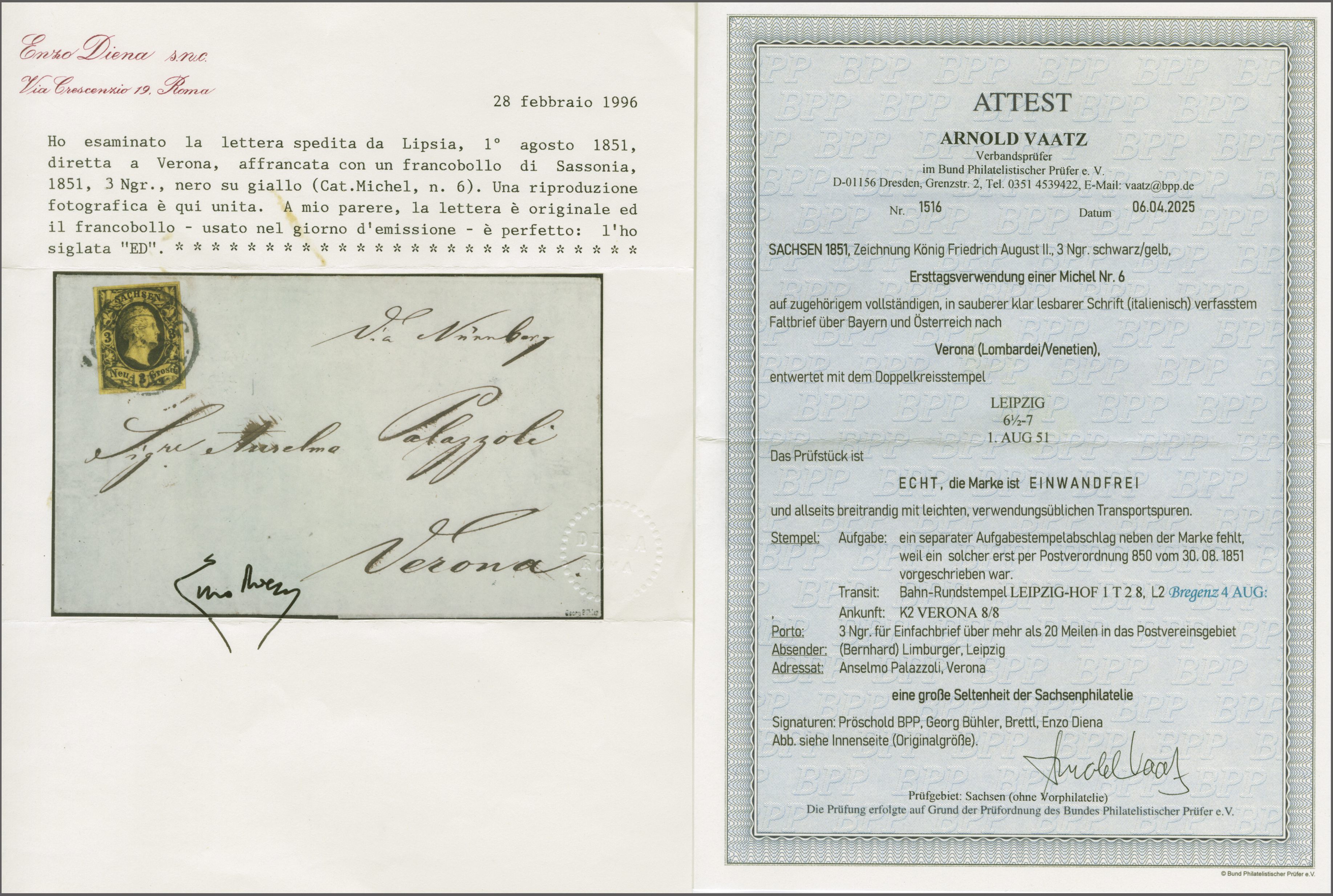 1683 cover imageErsttagsbrief 1851/55: König August 3 Ngr. schwarz auf gelb, ein fabfr. und regelmässig breitrandiger Prachtwert, klar, zentrisch und übergehend entw. mit Datumsstp. "LEIPZIG 1. AUG. 51" auf vollständigem Faltbrief nach Verona, Lombardo-Veneto mit Leitvermerk "via Nürnberg", rücks. Transitstp. "LEIPZIG-HOF" vom gleichen Tag und Bregenz sowie Ankunftsstp. "VERONA 8/8". Ein attraktiver Ersttagsbrief dieser Ausgabe, besonders selten auf einem Italienbrief, das Datum inwendig und im Archivvermerk wiederholt. Eine grosse Seltenheit der Sachsenphilatelie, signiert Bühler, Pröschold & Brettl, Attest Enzo Diena (1996) und Attest Vaatz (2025) (Image 1) (Image 2) (Image 3)