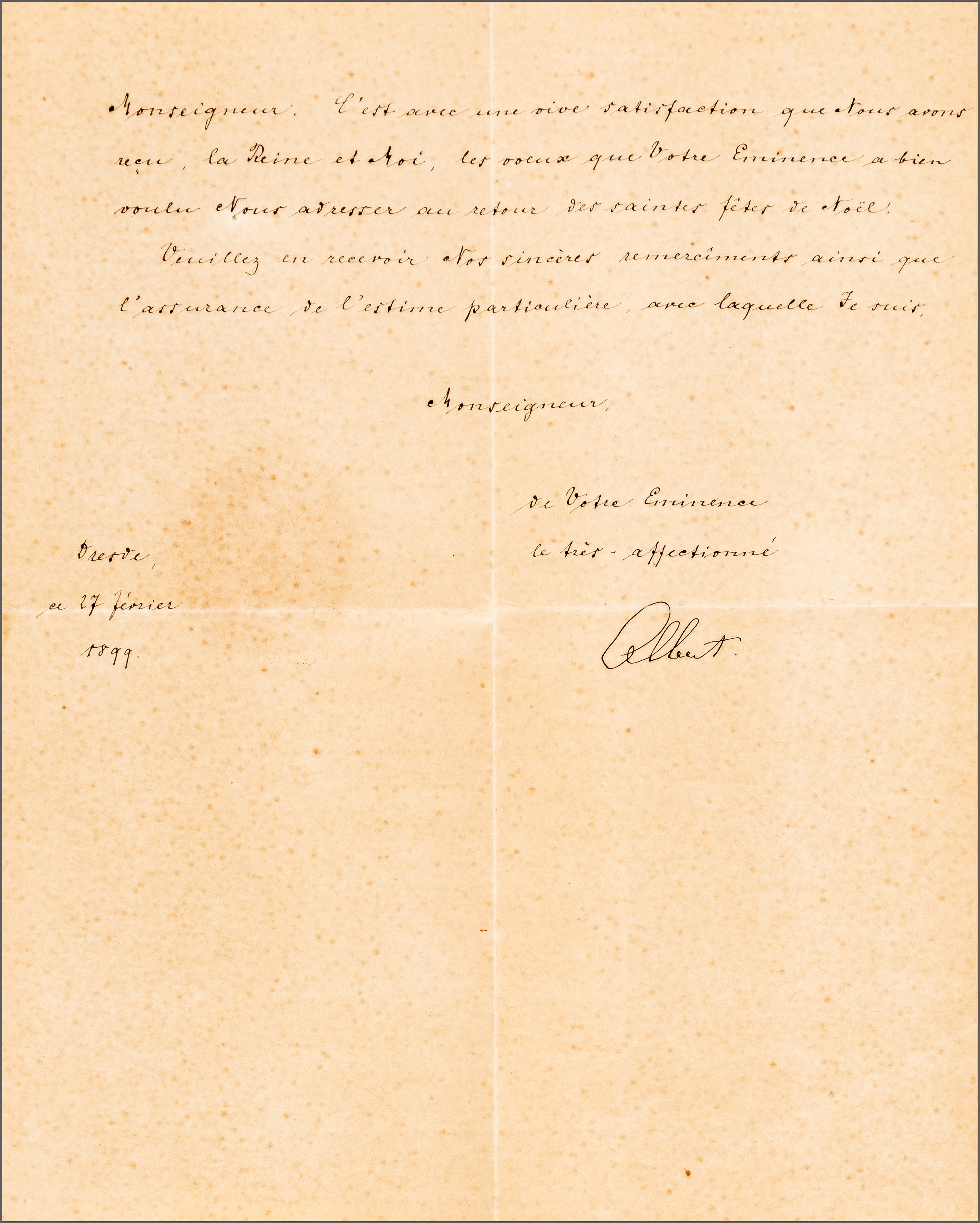 1688 cover image1899 (Feb 27), Dresden: Eigenhändiger Brief in französischer Sprache, unterzeichnet von König Albert von Sachsen (1828–1902), Oberhaupt des Hauses Wettin und regierender Monarch von 1873 bis 1902. Der König bringt darin seinen Dank für die freundlichen Wünsche von Kardinal Svampa anlässlich der Weihnachtsfeiertage zum Ausdruck und übermittelt zugleich seine herzlichen Grüsse im Namen sowohl seiner selbst als auch der Königin. Der Brief ist an Kardinal Domenico Svampa (1851–1907), Erzbischof von Bologna, adressiert und wird mit dem originalen frankierten Umschlag, versehen mit Postmarken, Stempeln sowie dem unversehrten Wachssiegel auf der Rückseite. Ein schönes und seltenes Stück königlicher Korrespondenz. Provenance: Collection of Pope Pius XII, Vatican, Italy & Ars Sacra, GM 2025 (Image 1)