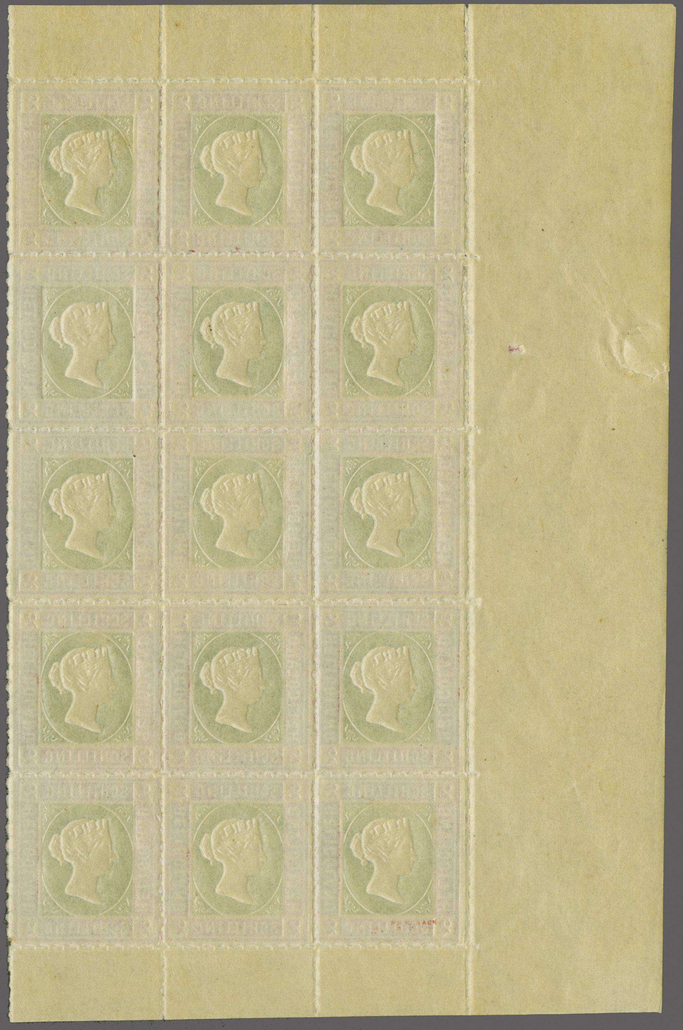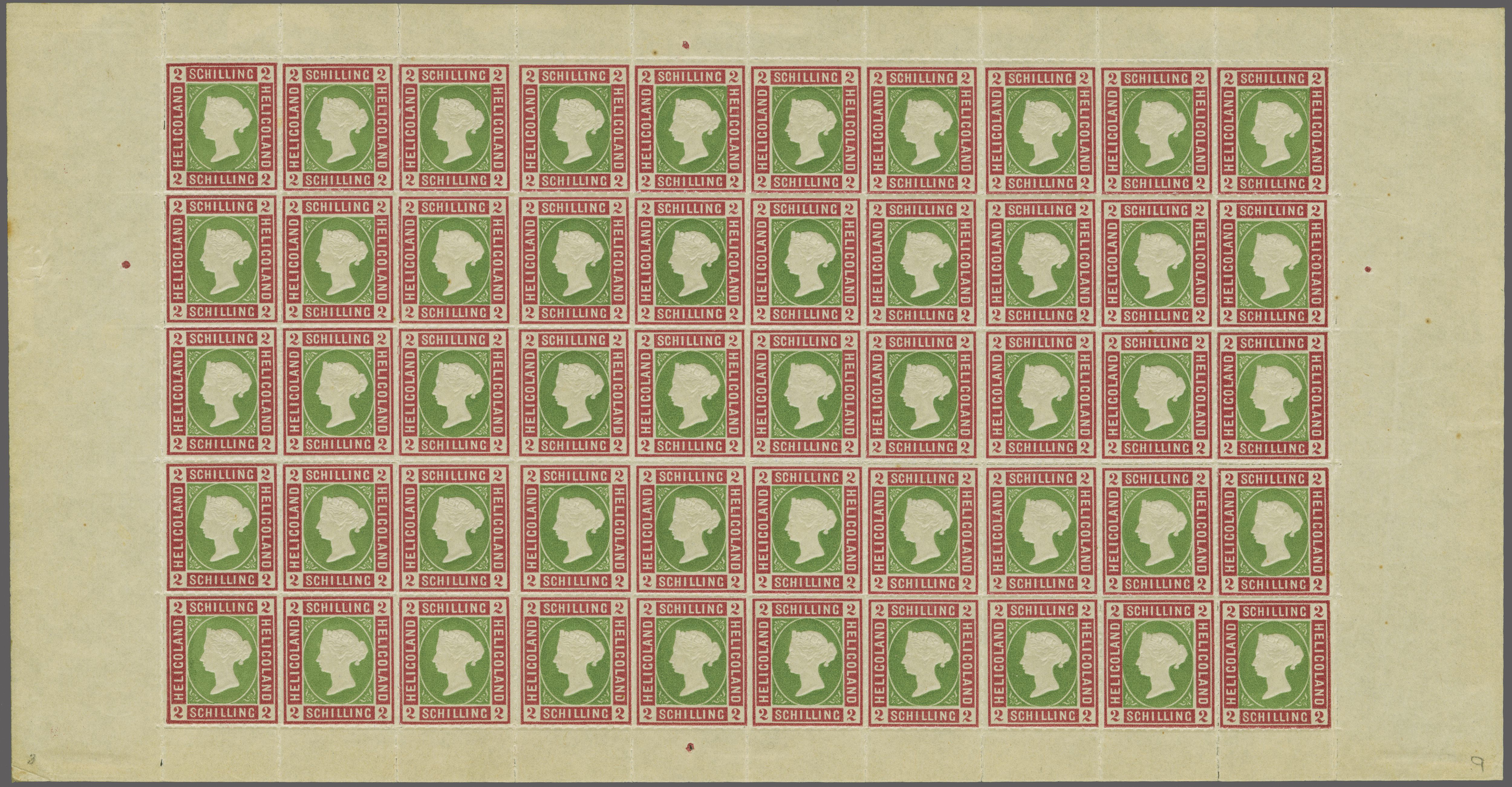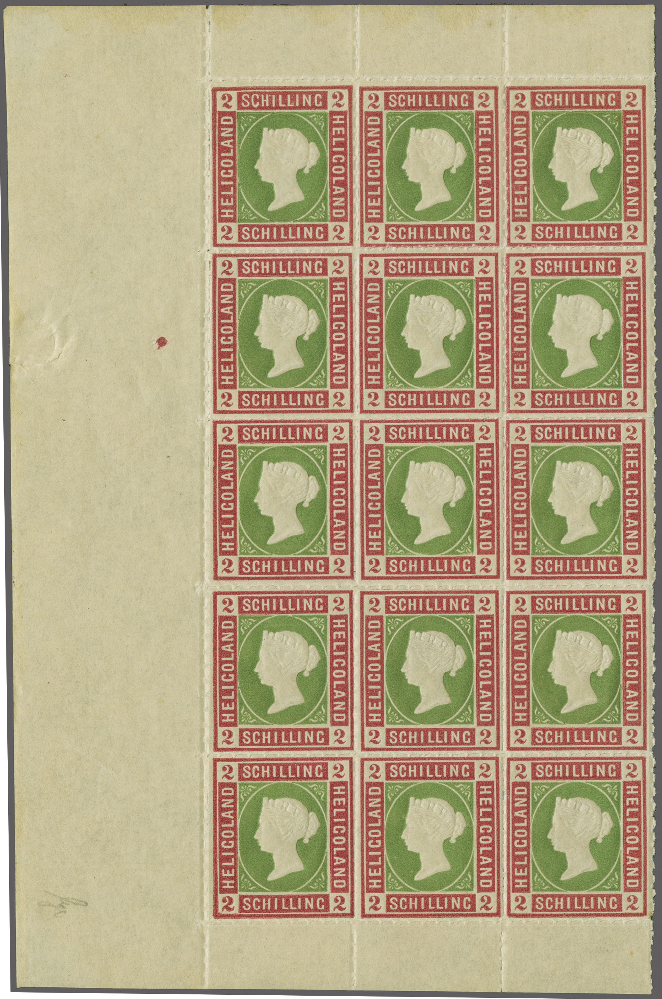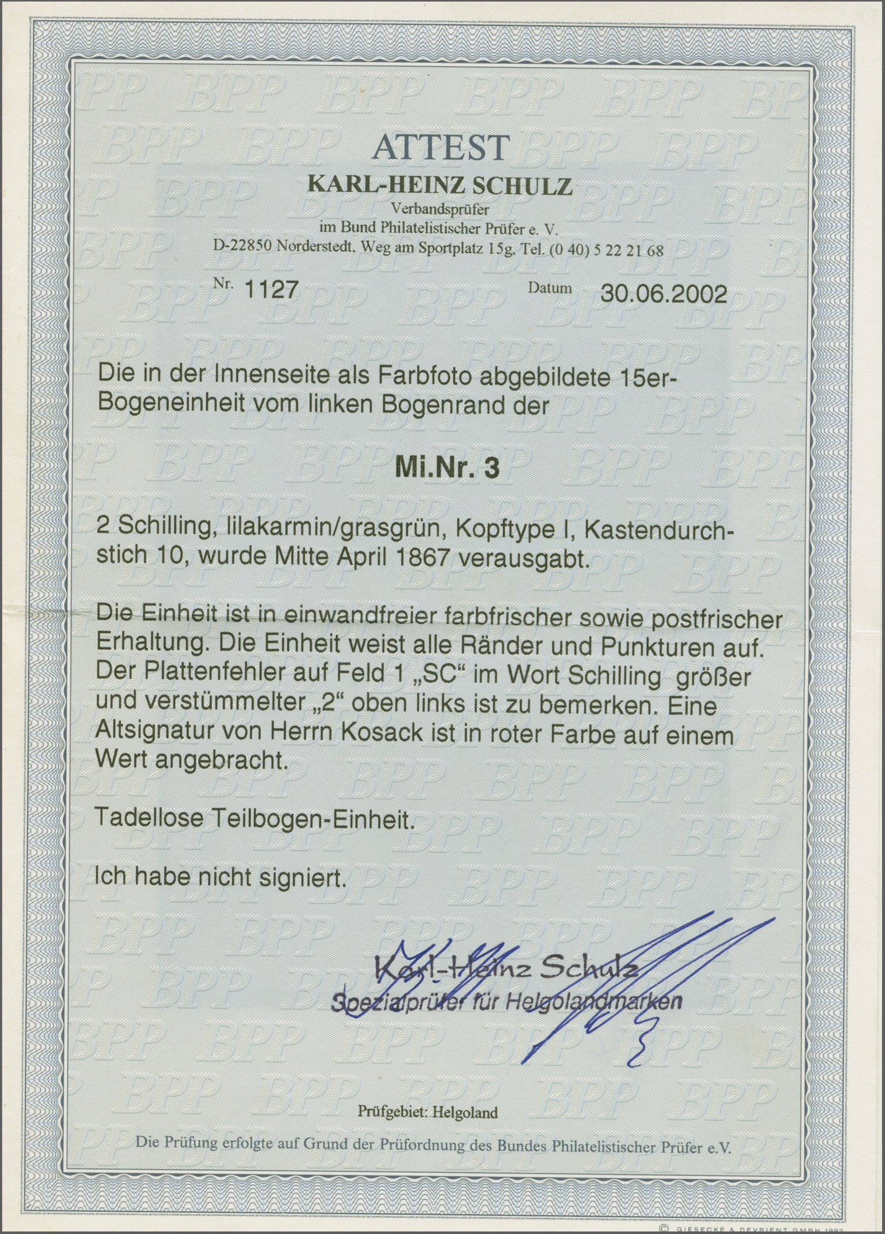 1675 ** imageHelgoland 1867: 2 S. lilakarmin/grasgrün durchstochen im 15er-Block mit Bogenrändern an drei Seiten, in Feld 1 Plattenfehler 'verkürzte 2', farbfrisch, postfrisch in einwandfreier Erhaltung, seltene Einheit, Signatur Ph. Kosack; Attest Schulz BPP (2002) Mi = € 380+. 1867 (March): 2 sch. rose & grass-green, rouletted, an unused block of fifteen (3 x 5) from the sheet of 50 subjects, plate flaw 'shortened 2' in field pos. 1, of vibrant fresh colour, superb, unmounted og. A most attractive multiple. Signed Ph. Kosack; cert. K-H. Schulz (2002) Gi 3 = £ 380+ (Image 1) (Image 2) (Image 3)