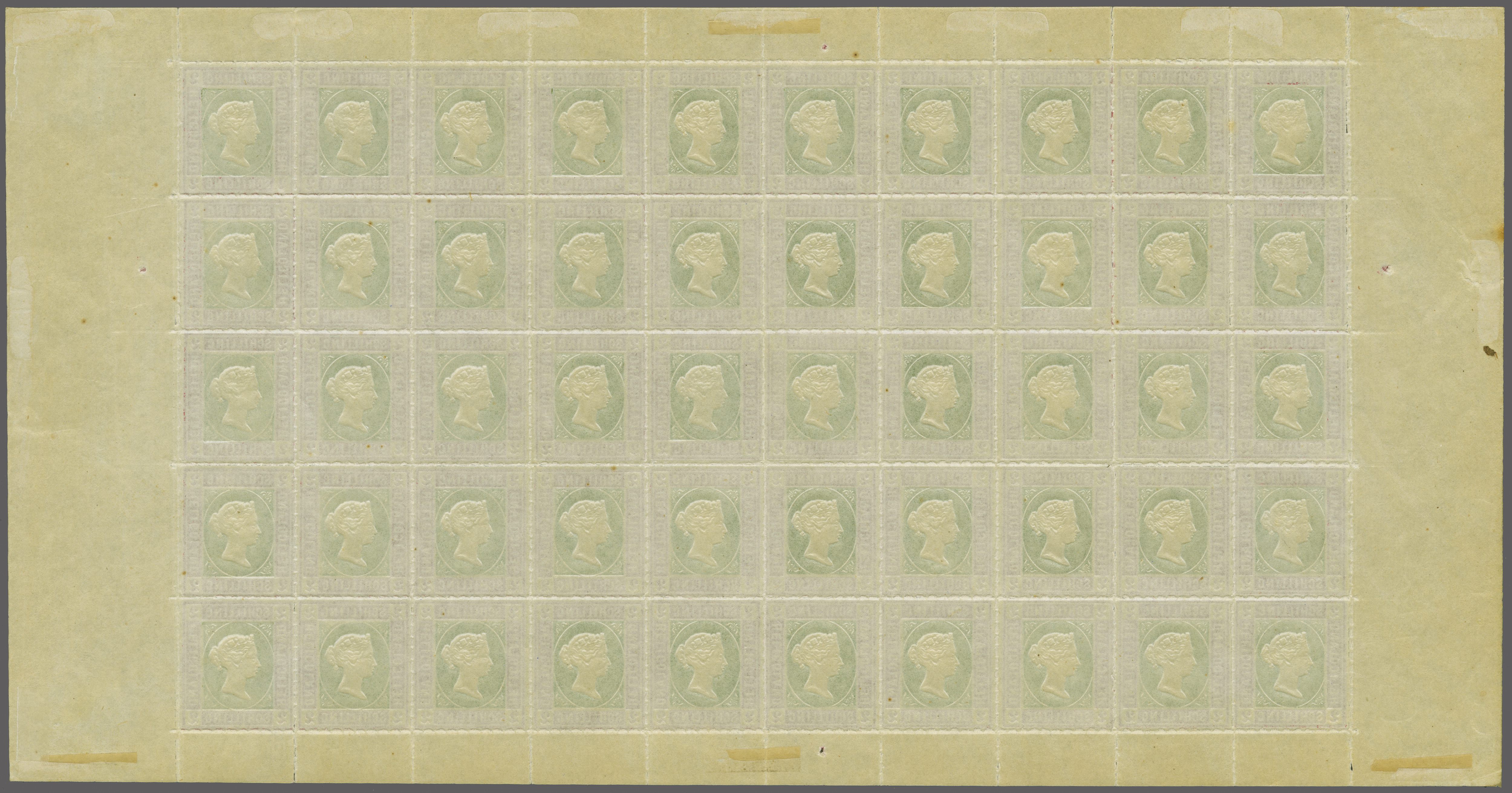 1676 ** image1867: Königin Victoria 2 S. lilakarmin & grasgrün, vollständiger postfrischer Originalbogen zu 50 Werten inkl. Plattenfehler II "kurze 2" in Position 1, Falzreste im Rand. Mi = € 1'100 für die Einzelmarken. 1867 (March): 2 sch. rose & grass-green, rouletted, an unused sheet of 50 subjects, plate flaw 'shortened 2' in field pos. 1, of vibrant fresh colour, unmounted og. Some marginal hinge remnants, nevertheless a most attractive multiple. Gi 3 = £ 1'000+ (Image 1) (Image 2)