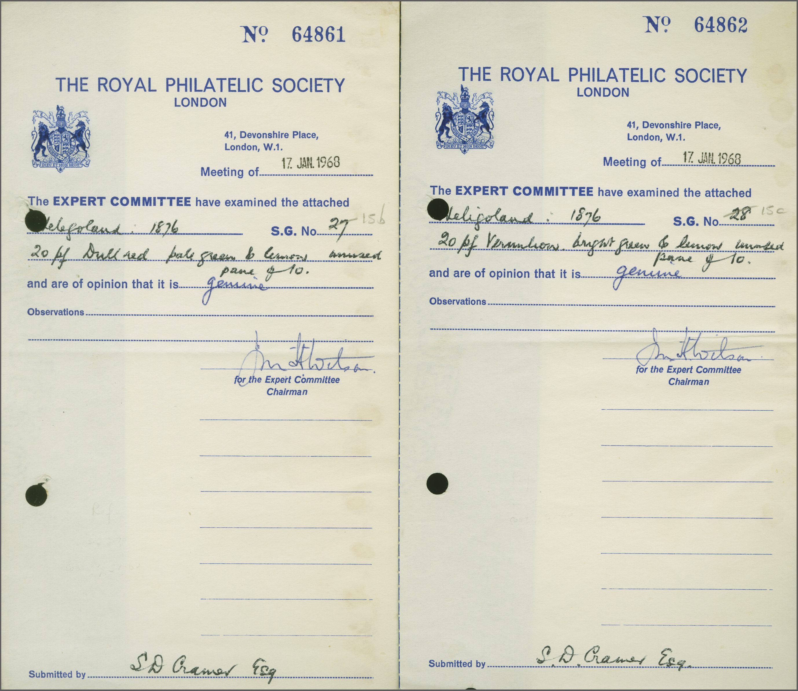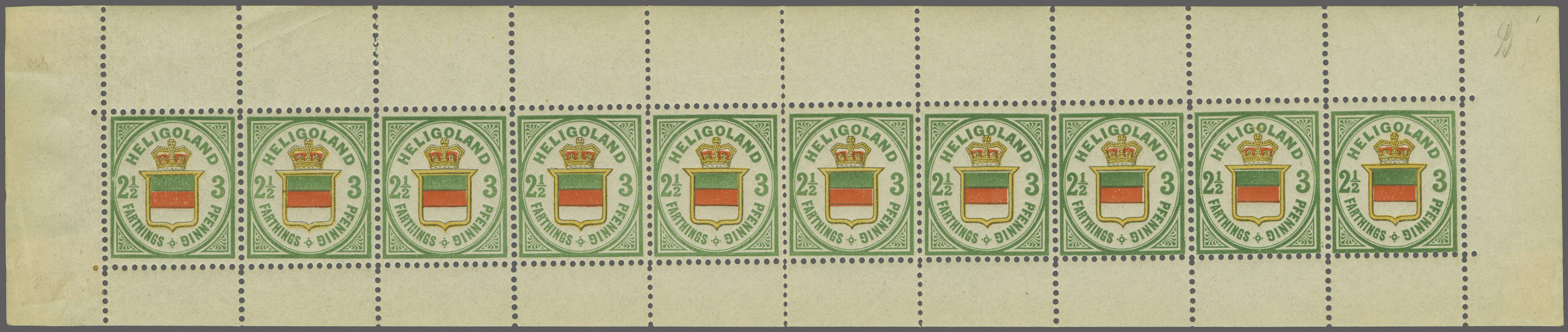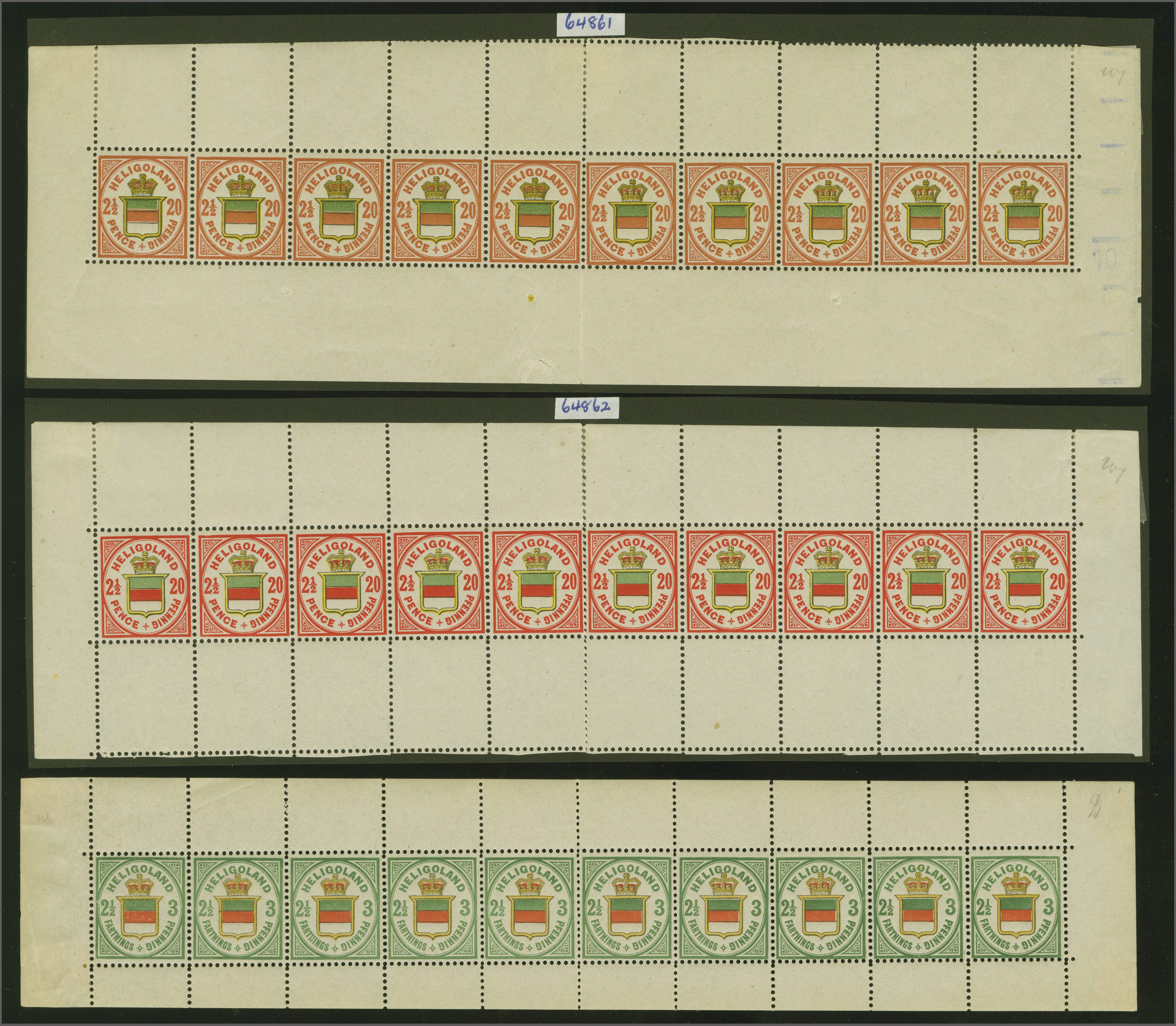 1678 ** image1876: 2½ F. / 3 Pf grün, gelb & zinnoberrot, auch 2½ P. / 20 Pf. in den Nuancen rötlichorange und graurot. je als kompletter Streifen zu zehn Werten in intensiver Farbe und postfrischer Erhaltung. Falzreste im Rand, eine Perforation beim Streifen der 3 Pf. minim angetrennt, ein attraktives Stück. Mi = € 7'500+. 1876 (June): 3 pf. pale green, red & yellow, also 20 pf. in the two shades dull red, pale green & lemon as well as aniline vermillion, all three in complete unused panes of ten examples of vibrant fresh colour, unmounted og. Some marginal hinge remnants, the 3 pf. with light separation of one perf, nevertheless a most attractive group. Gi 12, 15b & 15c = £ 3'110+ (Image 1) (Image 2) (Image 3)