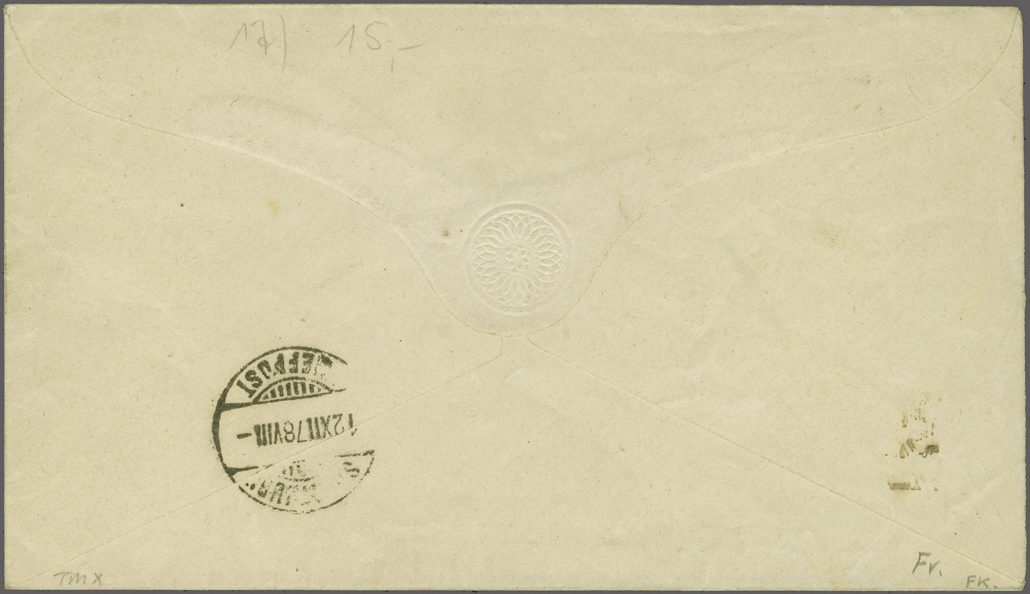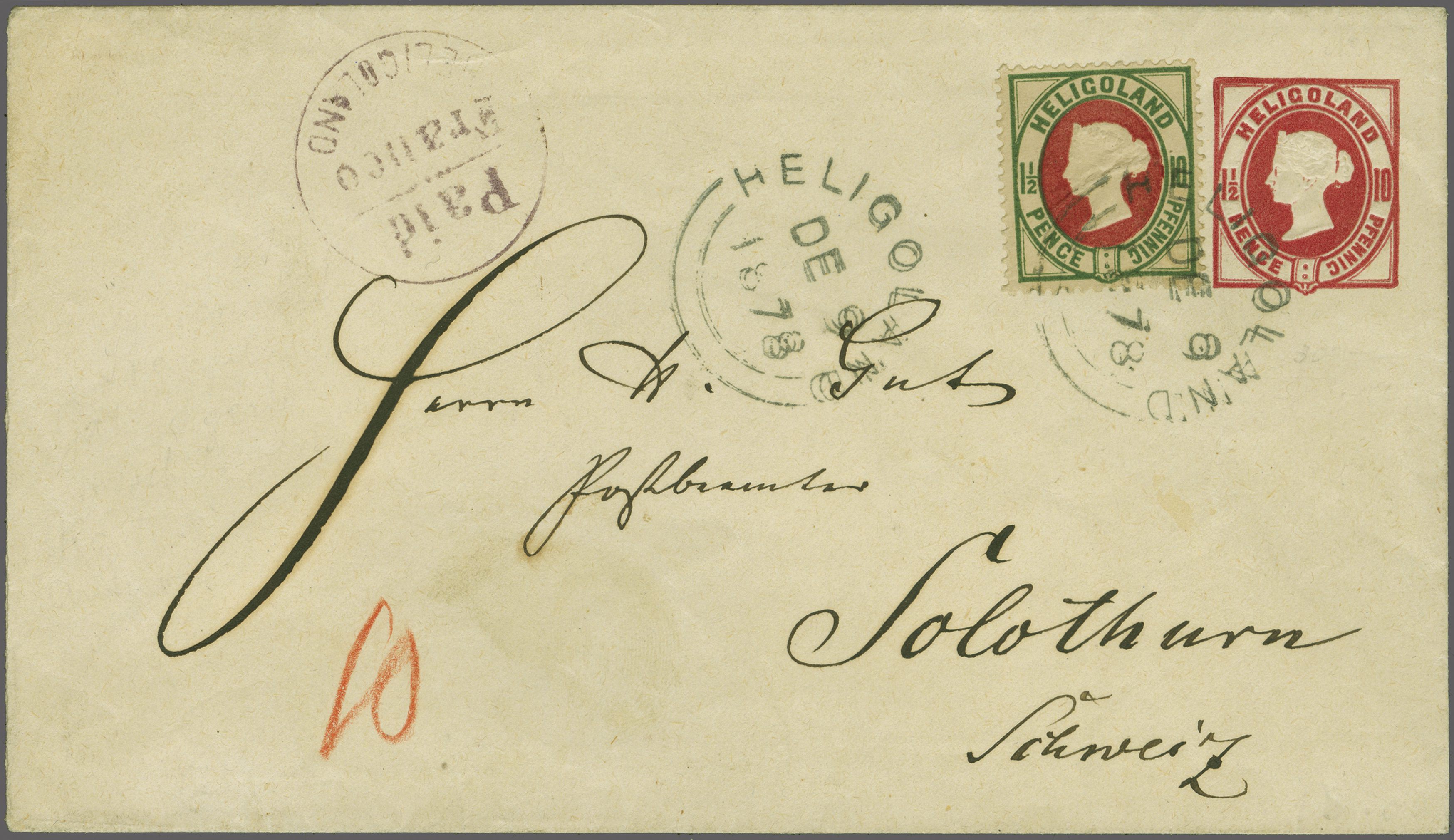 1677 cover image1875: 10 Pfg. dunkelgrün/dunkellilakarmin als Zufrankatur auf Ganzsachenumschlag 10 Pfg., entw. mit klarem "HELIGOLAND DE 9 1878" sowie nebengesetztem "Paid Franco Heligoland" nach Solothurn mit rücks. Ankunftsstempel, selten. 1875 (Feb): 10 pf. dark green & dark carmine on stationery envelope 10 pf., cancelled bye "HELIGOLAND DE 9 1878" cds, "Paid Franco Heligoland" handstamp alongside, directed to Solothurn, Switzerland, corresponding arrival backstamp. A rare destination, an appealing cover (Image 1) (Image 2)