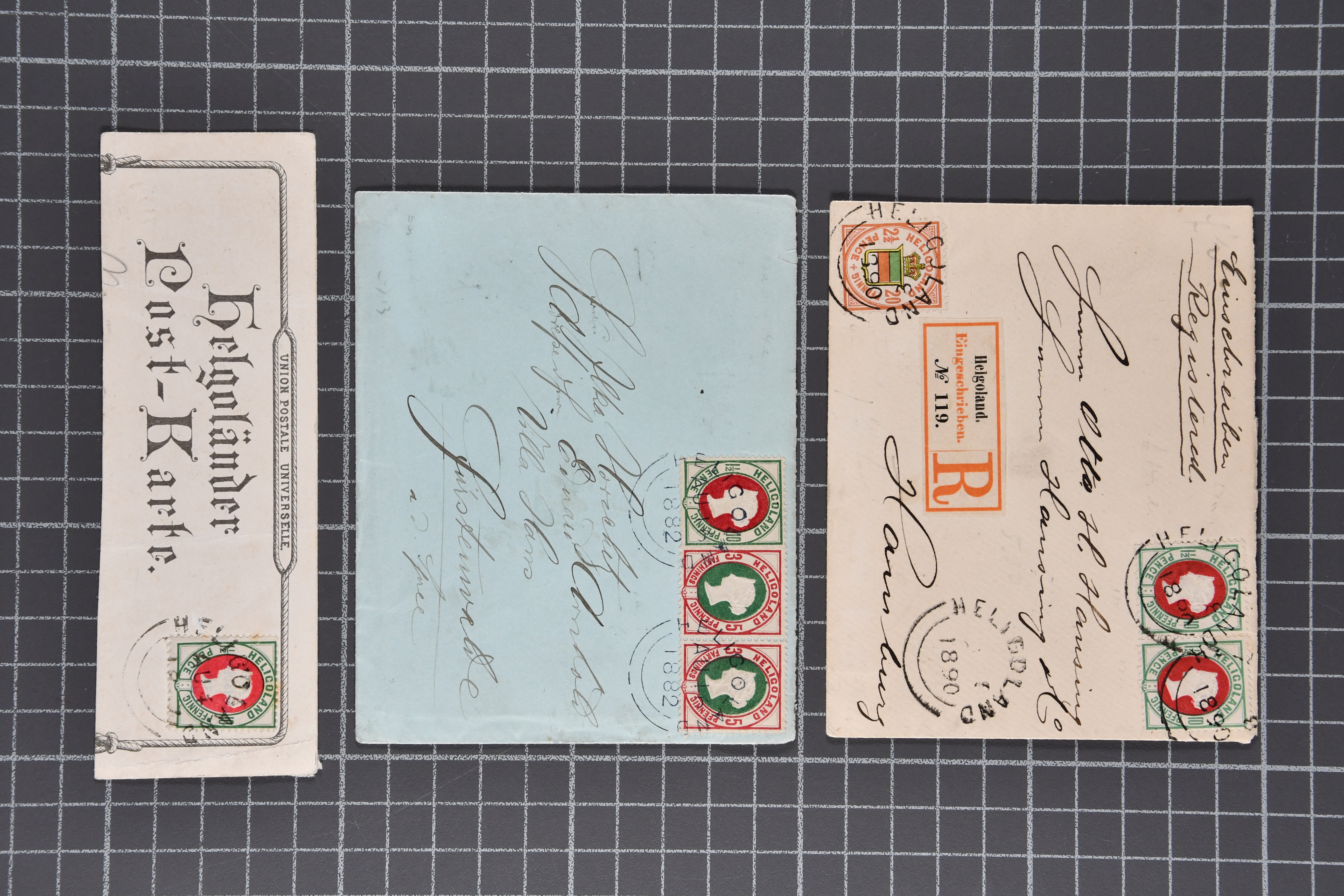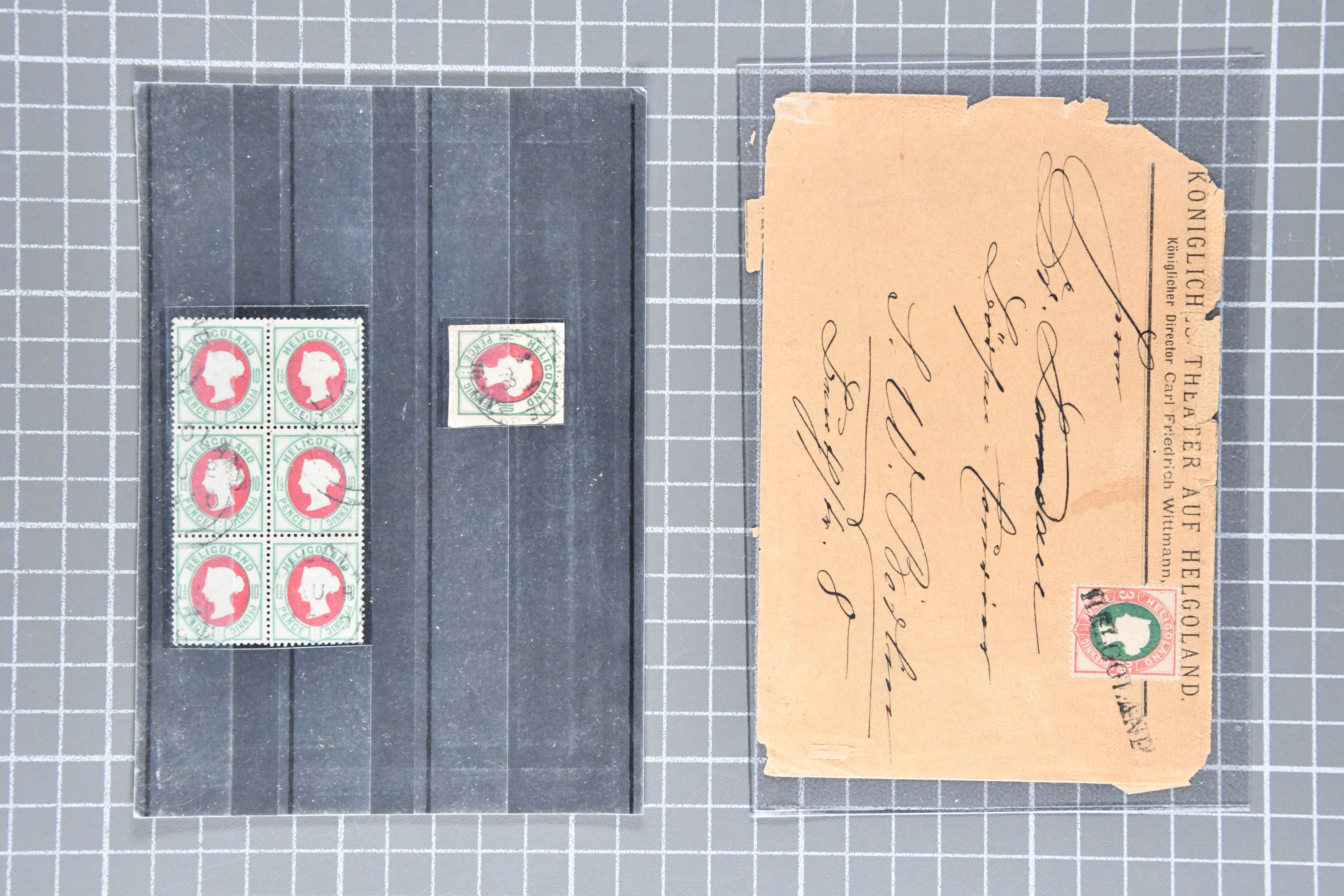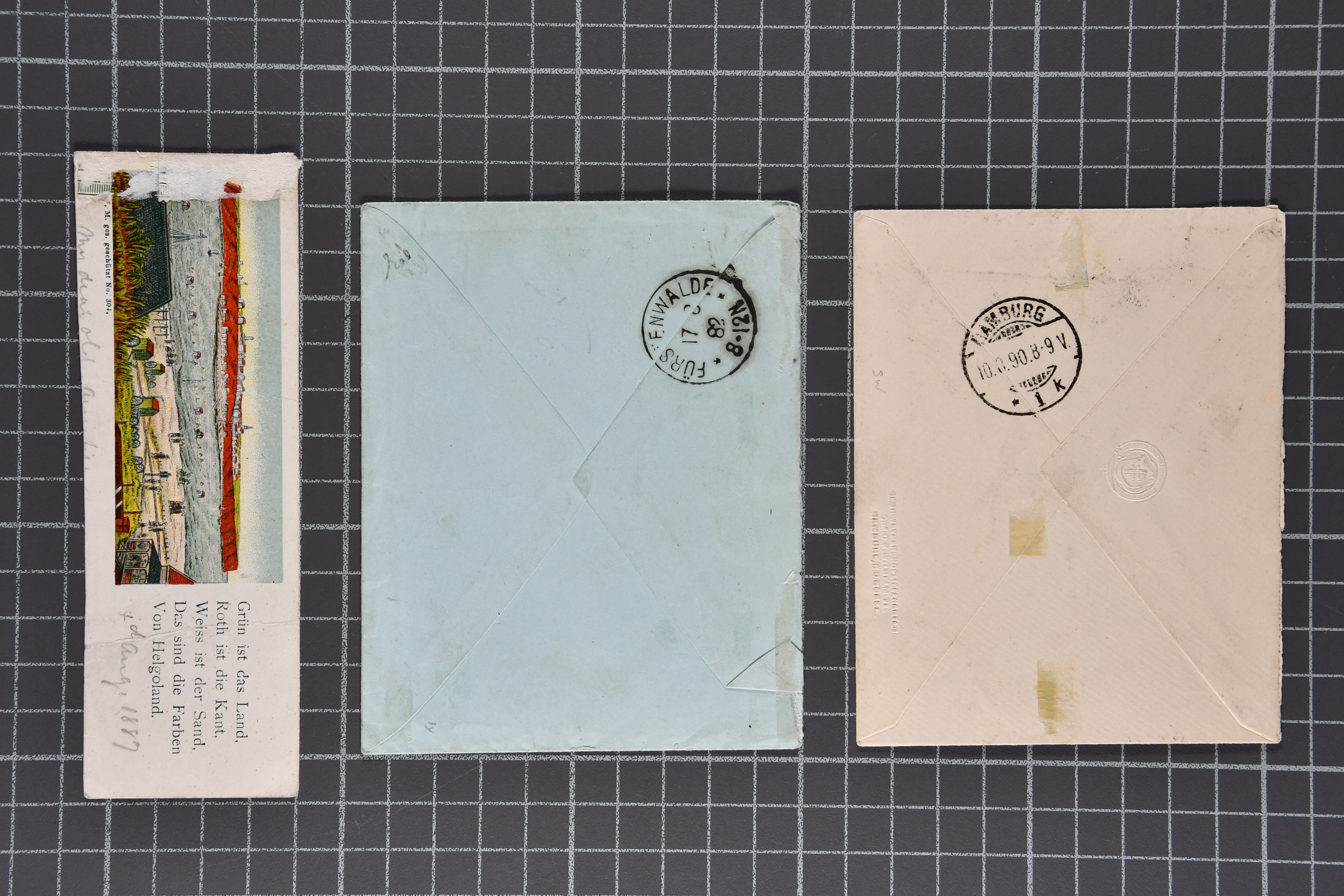 1679 cover image1875/90: Lot drei Briefe, dabei Umschlag des königlichen Theaters auf Helgoland nach Berlin mit 25 Pf., übergehend entw. mit Stabstp. HELGOLAND, 1882 Brief nach Fürstenwalde mit Paar 5 Pf. & Einzelner 10 Pf., Einschreiben 1890 mit Paar 10 Pf. in Mischfrankatur mit 1890 Wappen 20 Pf.; weiterhin oberer Teil einer Ansichtskarte 1877 mit 1875 10 Pf. und der gleiche Werte einzeln auf kleinem Briefstück und im Sechserblock. Interessantes Lot (Image 1) (Image 2) (Image 3)