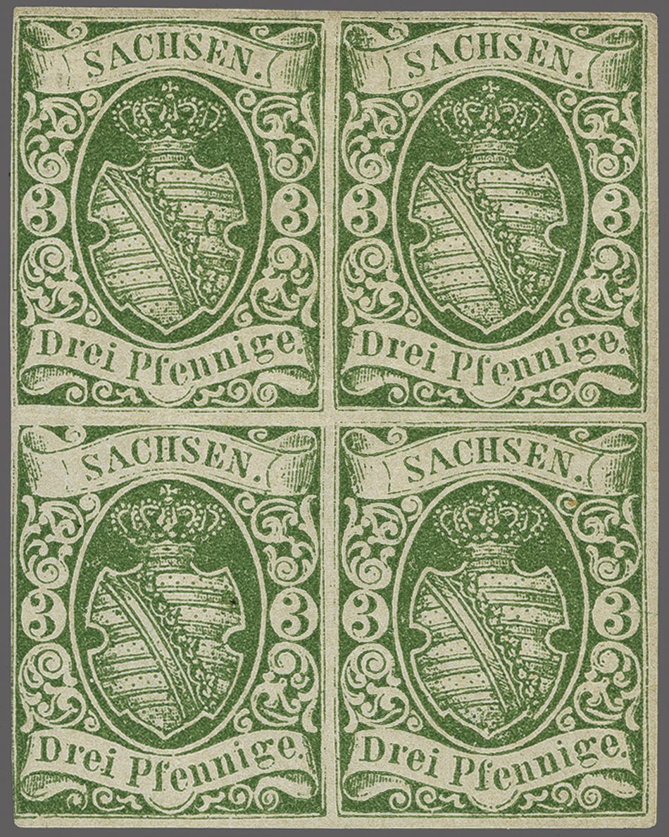 1681 */bof imageSachsen 1851/63: 3 Pfennig saftiggrün, spätere Auflage, ungebrauchter Viererblock mit vollem Originalgummi, voll- bis meist breitrandig und in sehr frischer Erhaltung. Eine seltene Einheit Mi = € 2'200 für den häufigeren Viererstreifen (Image 1) (Image 2)