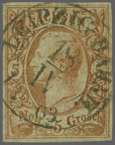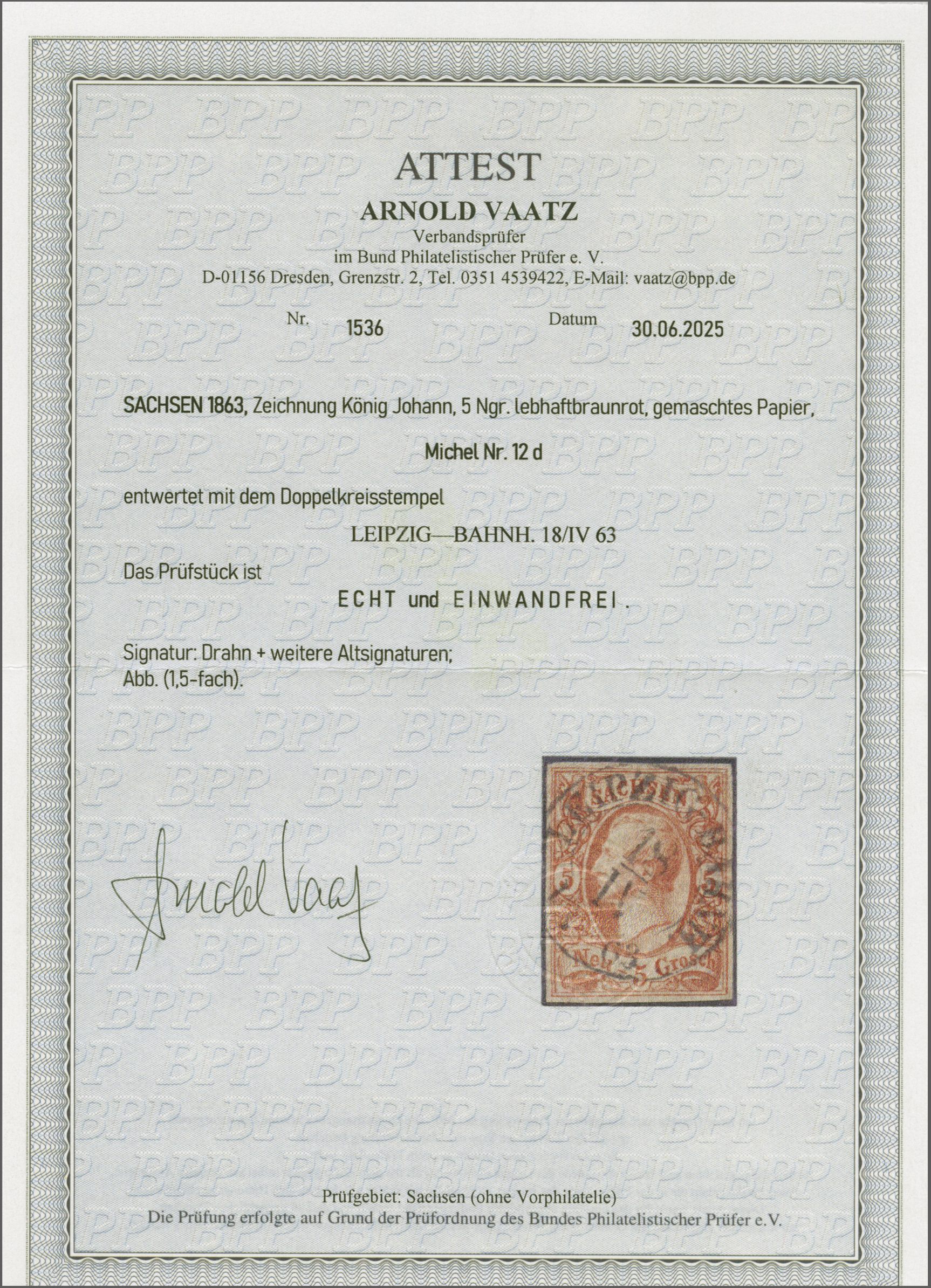 1684 image1863: König Johann 5 Ngr. lebhaftbraunrot, lebhaft breit gerandet.. entw. mit Zweiklreiser "LEIPZIG BAHNH. 18/IV 63". Signiert Drahn; Attest Vaatz (2025) Mi = € 750 (Image 1) (Image 2) (Image 3)