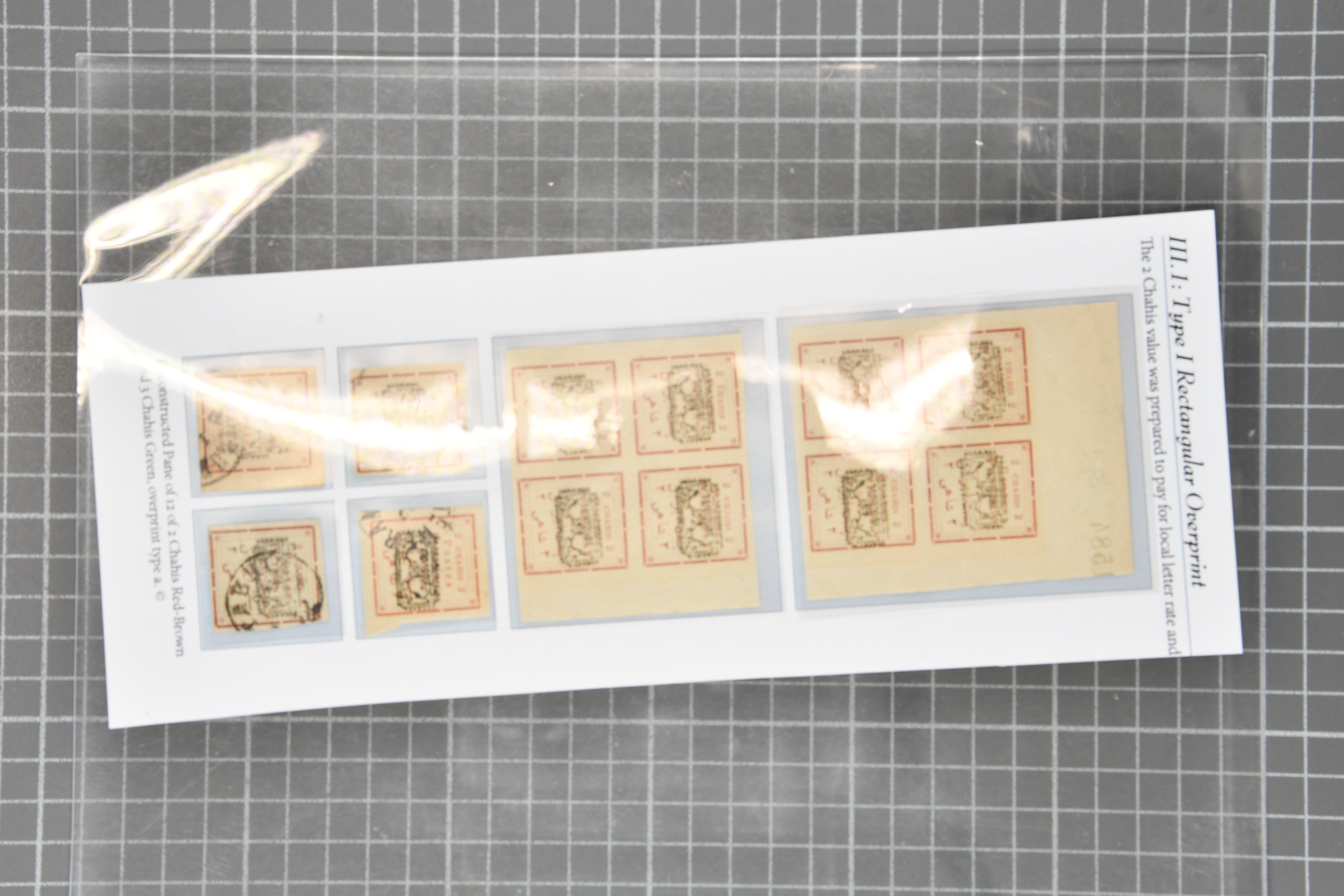 1902 (March): Rosette overprint in red on Typeset provisionals, 1st. printing, 1 ch. grey & buff imperforate (positions 1 and 3), 2 ch. brown & buff (pos. 9), 3 ch. deep green & buff (pos. 2), 5 ch. red & buff