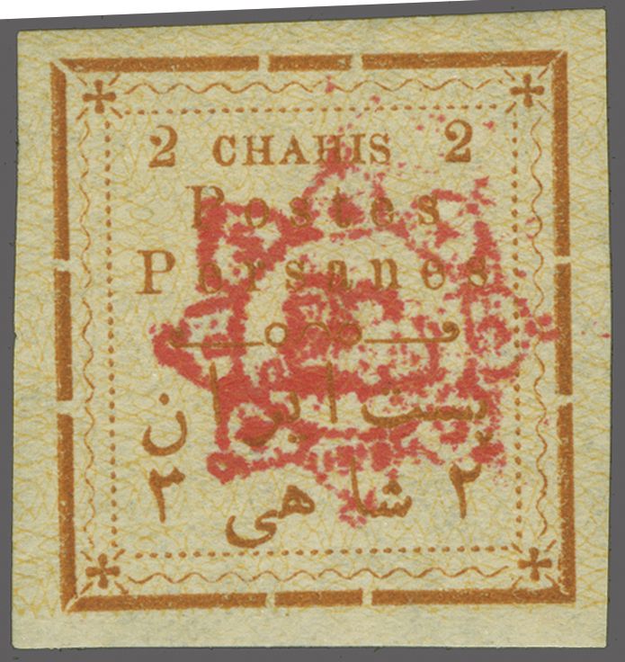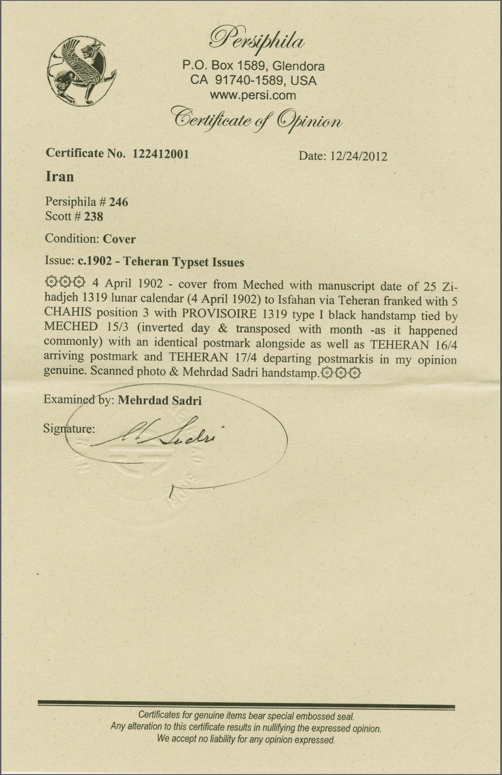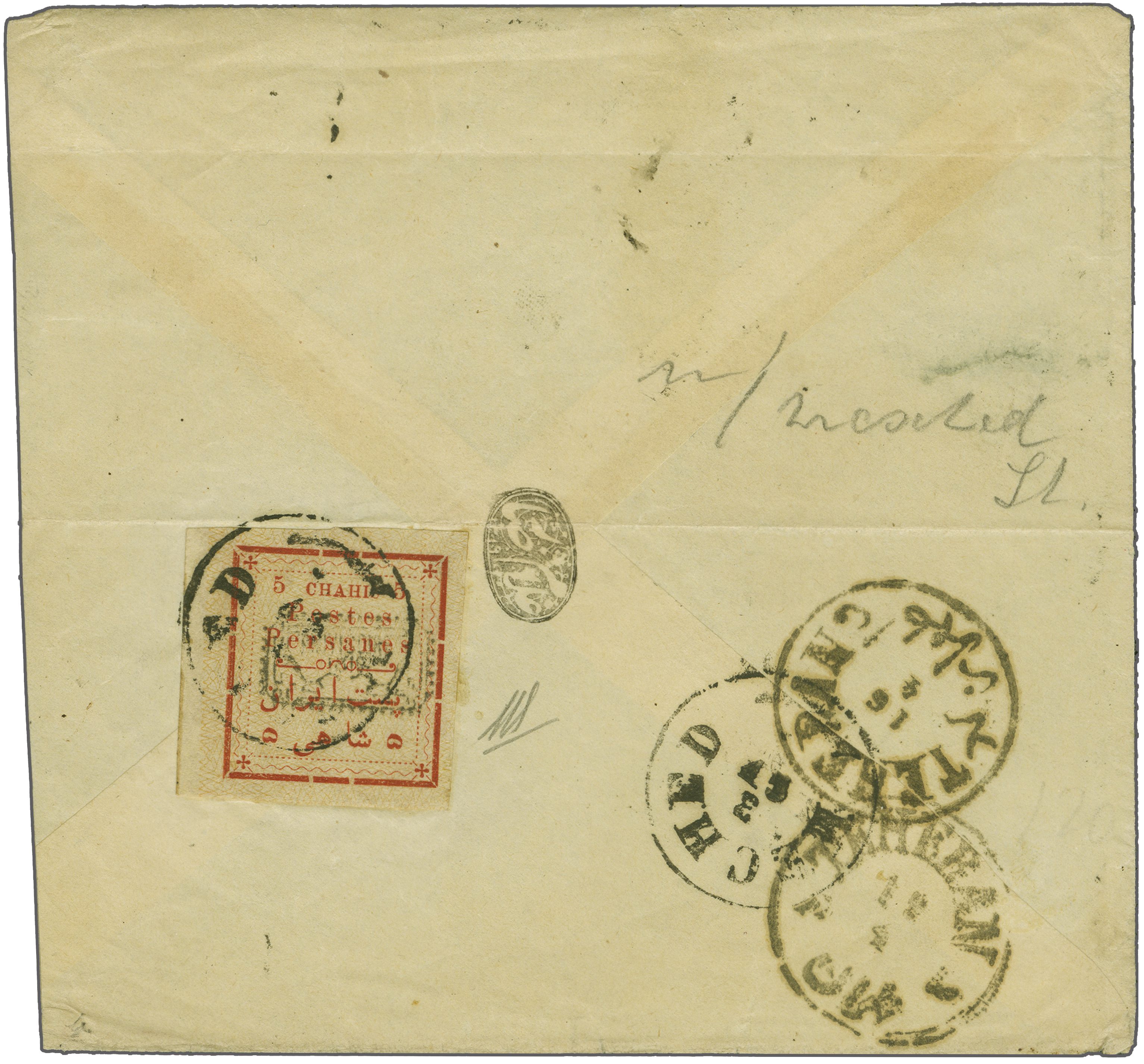 chahis from Hamadan to Sanandaj / Kurdistan tied by HAMADAN circular datestamp (Dec 20) in black with information strike at right. Just four known examples of this franking are known from Hamadan. Cert. Sadri (2005). Note: The normal single rate was