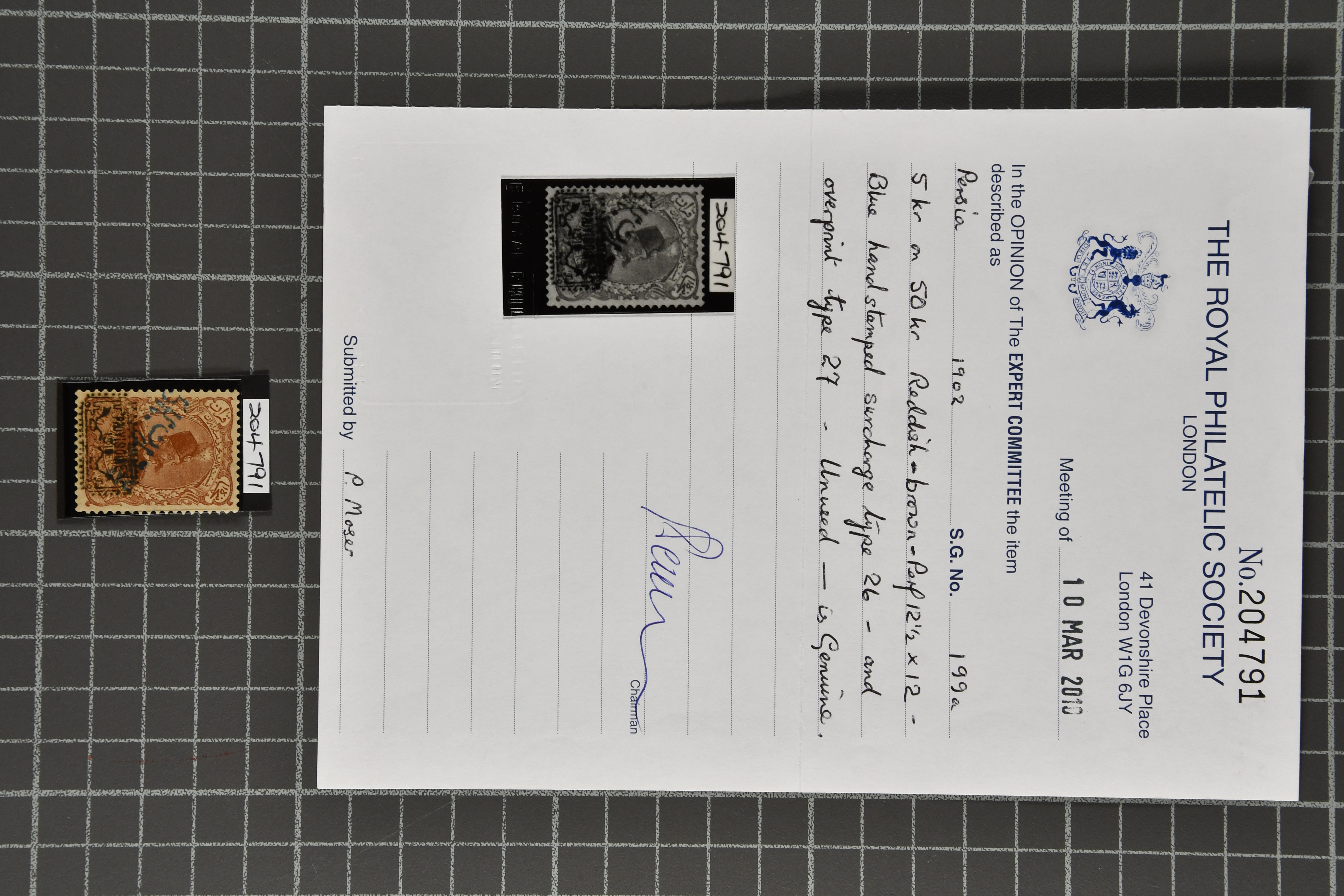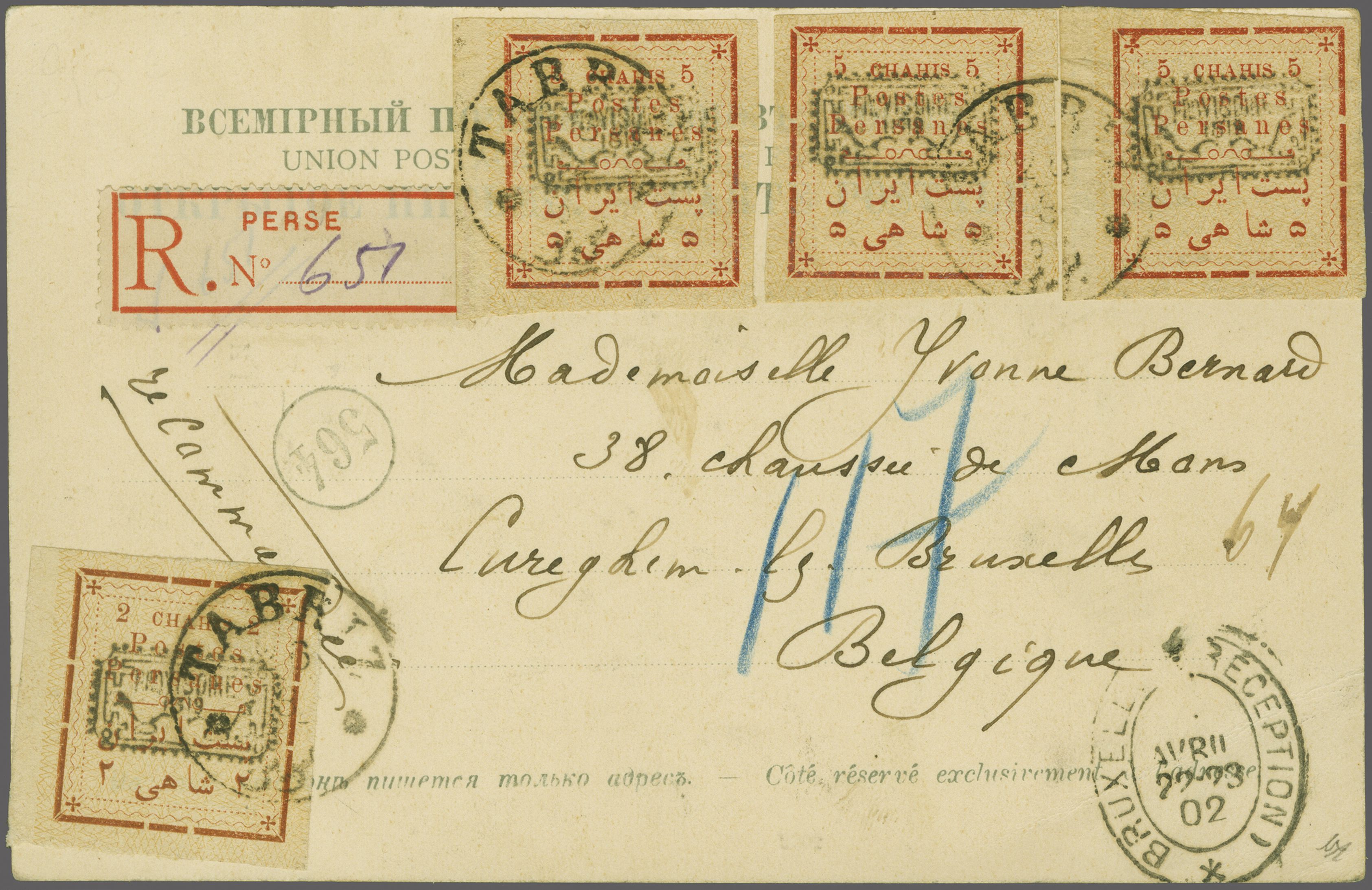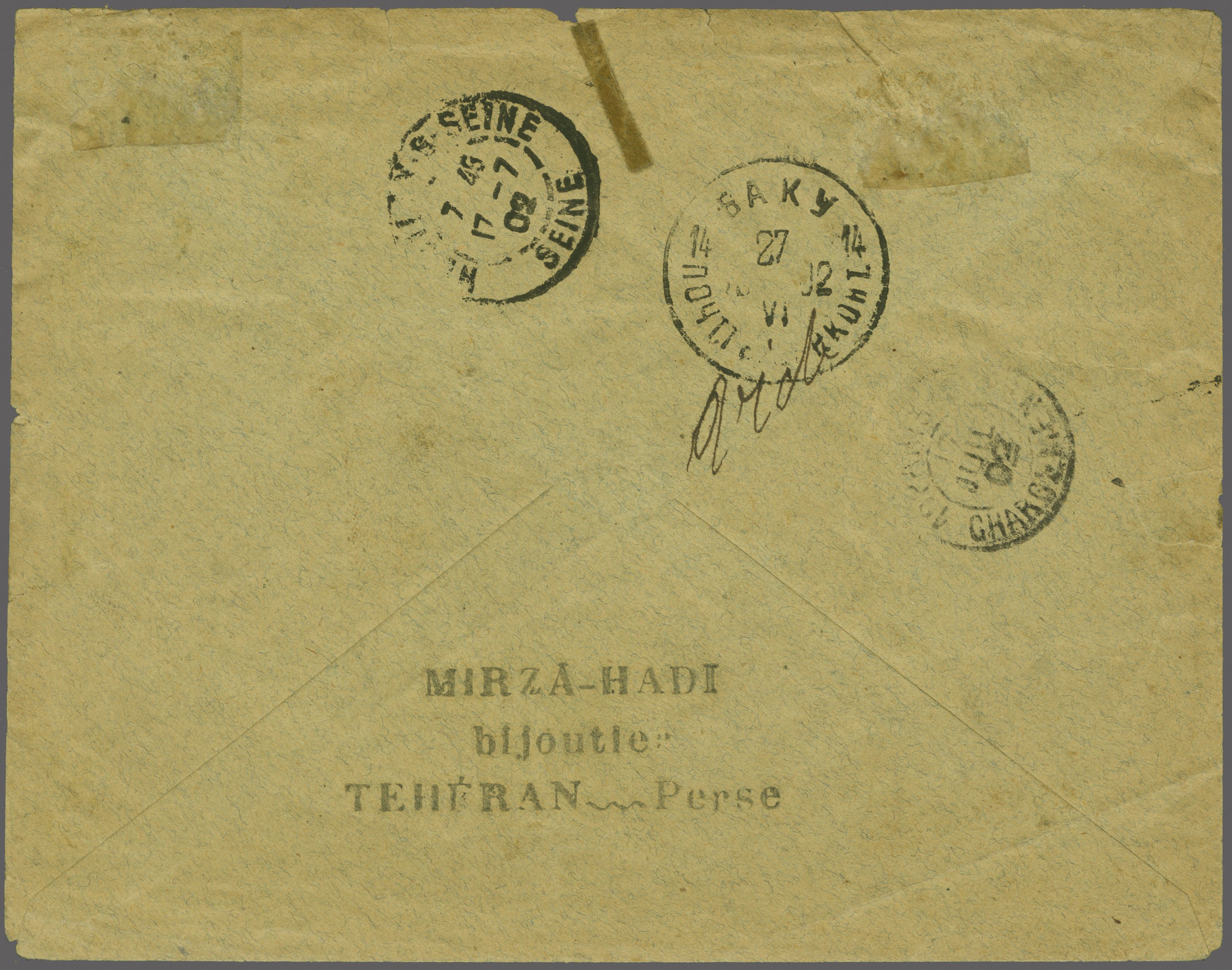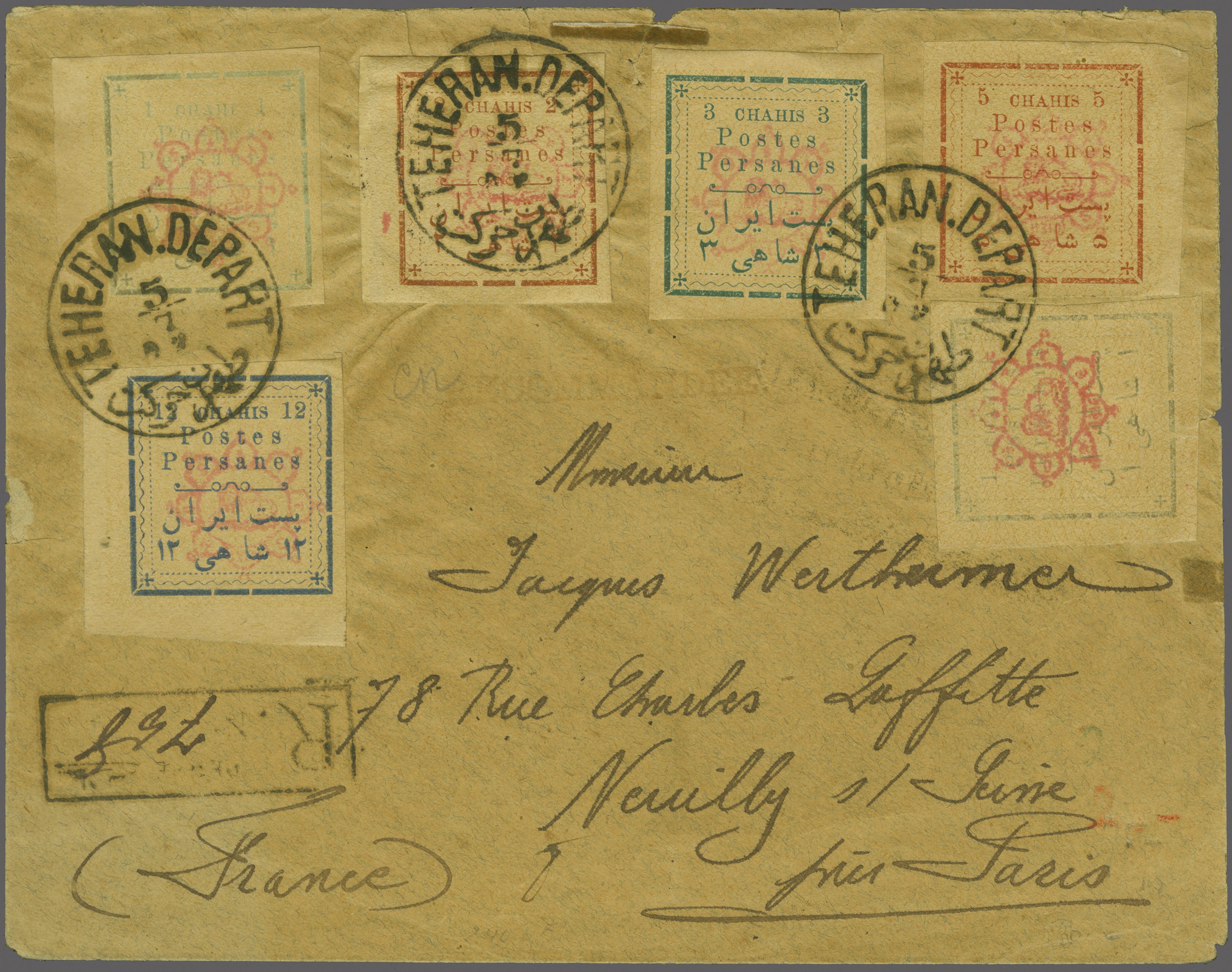(pos. 10) and 12 ch. ultramarine & buff (pos. 12) all used on 1902 registered cover to Jacques Wertheimer in Neuilly sur Seine, tied by TEHERAN DEPART datestamps (July 5) in black. Reverse with Baku transit cds (June 27j), Paris and Neuilly cds
