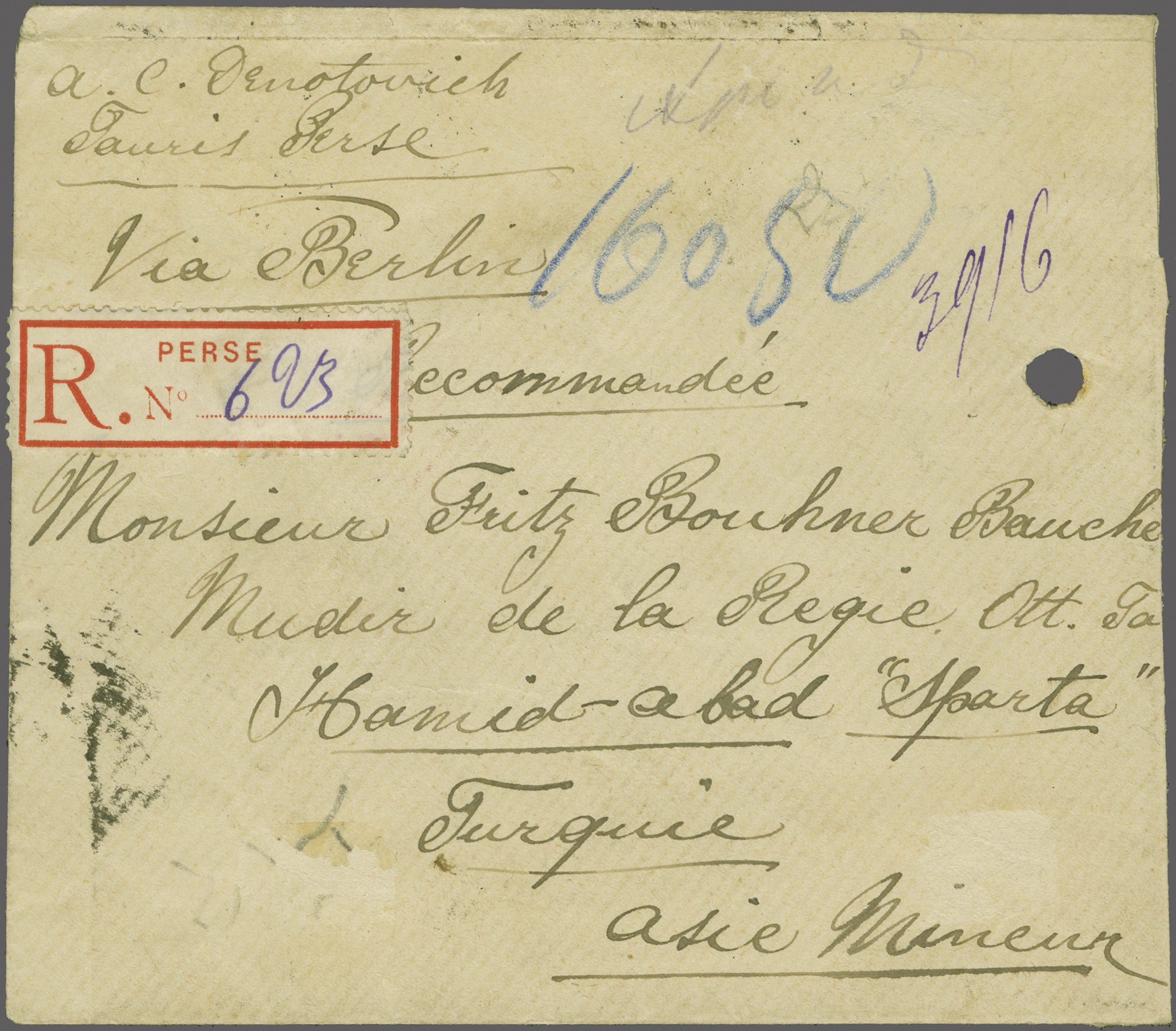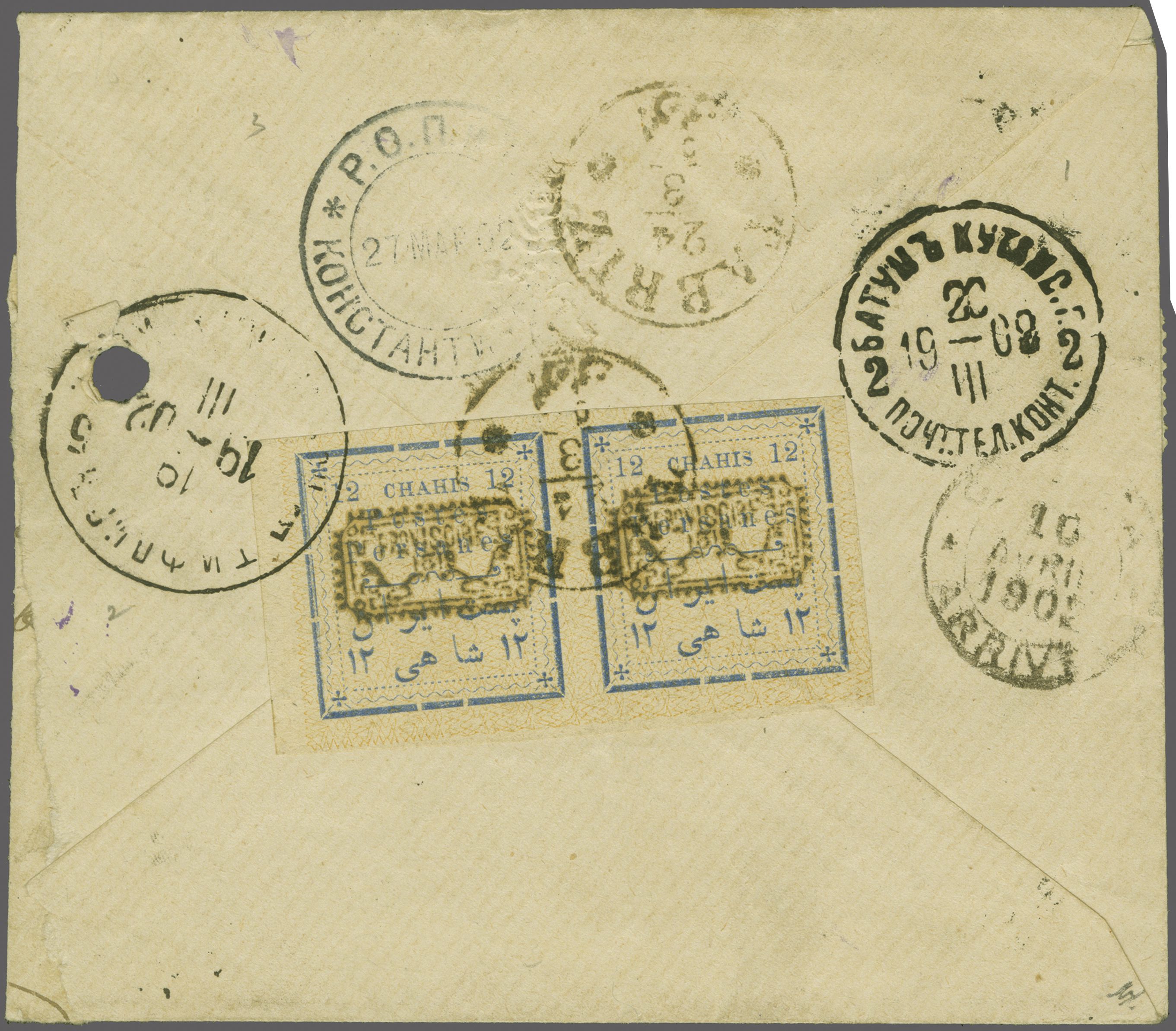 registered single rate cover from Kermanshah to Hamidabad, Turkey, tied by TABRIZ cds (March 24) in black. Information strike above, TIFLIS cds (March 19j) cds, BATUM cds (March 20j), Russian P.O. in Constantinople cds (March 27j) and Galata transit