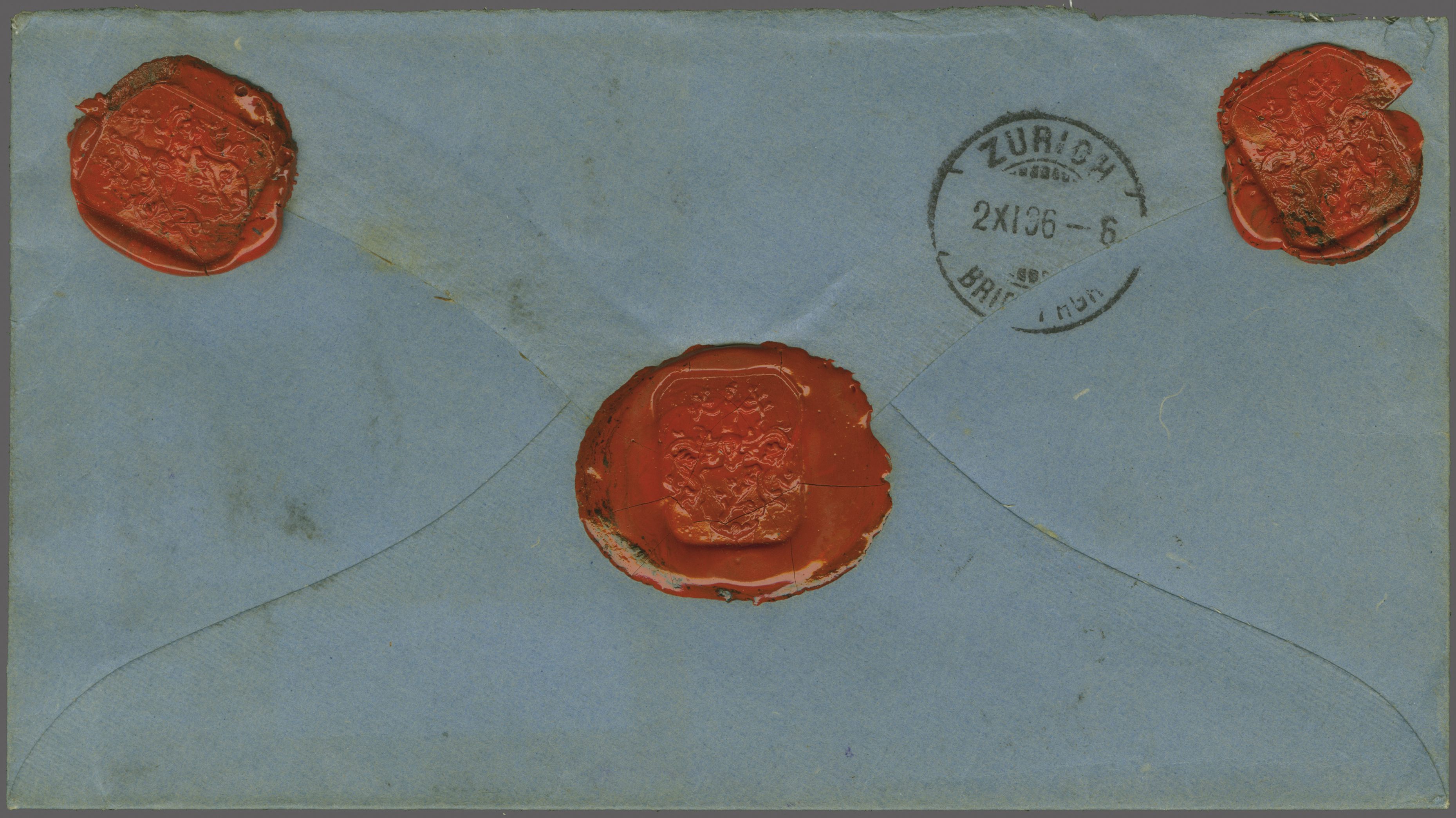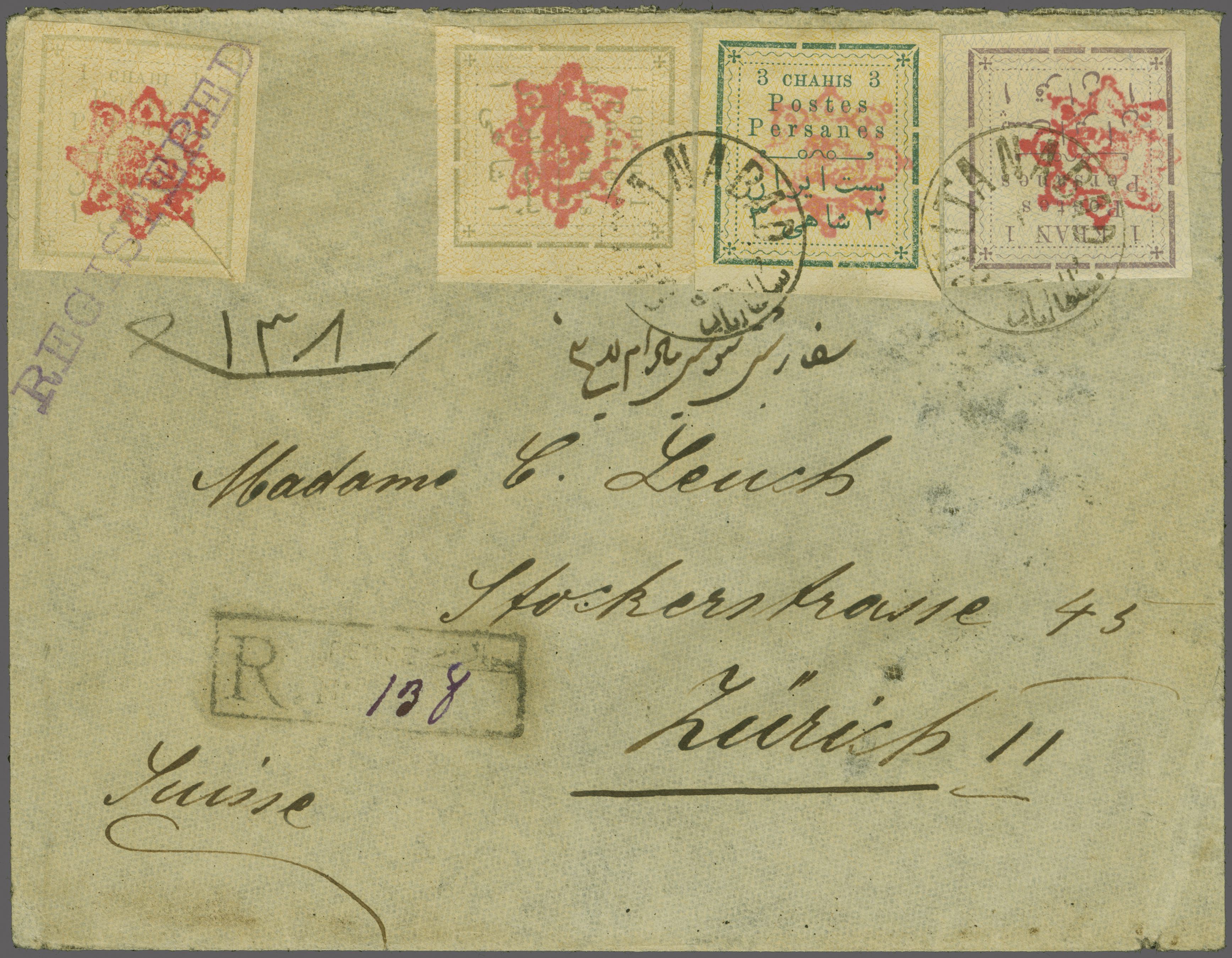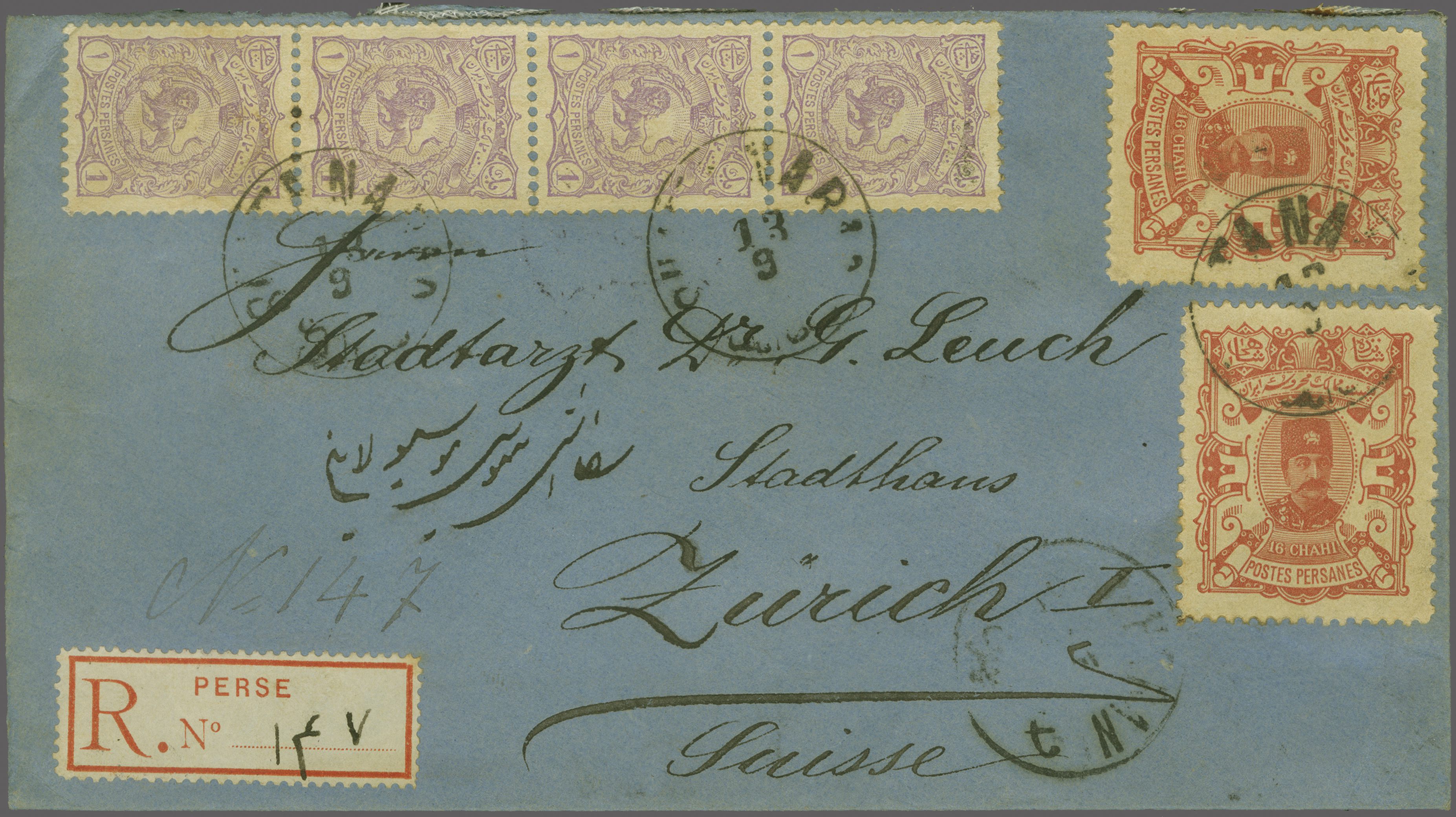 1896 (Sept 13): Registered envelope to Switzerland franked 1894 1 ch. mauve vertical strip of four and 16 ch. rose (2) tied by SULTANABAD cds, with registration PERSE label alongside and ZÜRICH arrival (Image 1)
