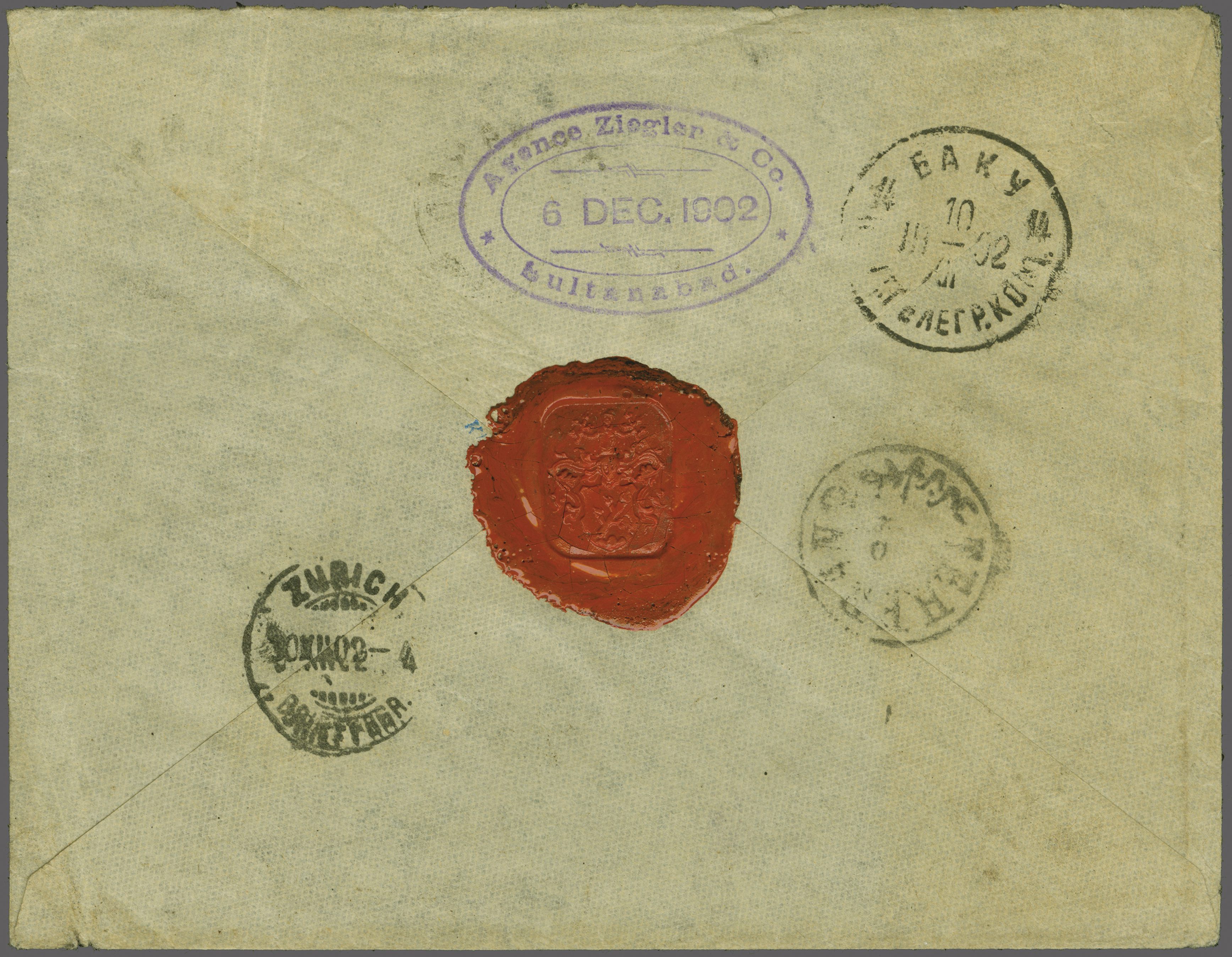 manuscript number '138' below. Reverse with Teheran cds (Dec 20), Baku cds (Dec 10j) and Zurich arrival (Dec 30). Just ten covers are recorded with the 1 chahi acting as a registration label; all except one are mailed from Sultanabad. An attractive
