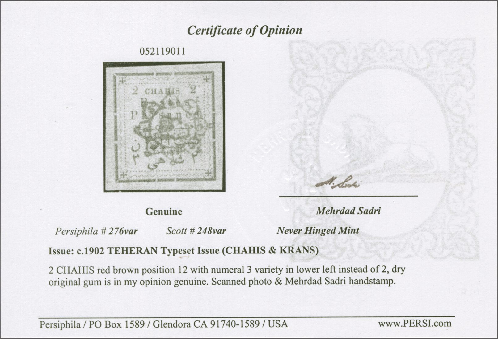 1902 (March): Rosette overprint in red on Typeset provisionals, 2nd. printing, 2 ch. brown & buff, an unused example with good even margins, variety "Farsi ۳ for ۲" error (3 for 2), from position 12, large part og. Scarce