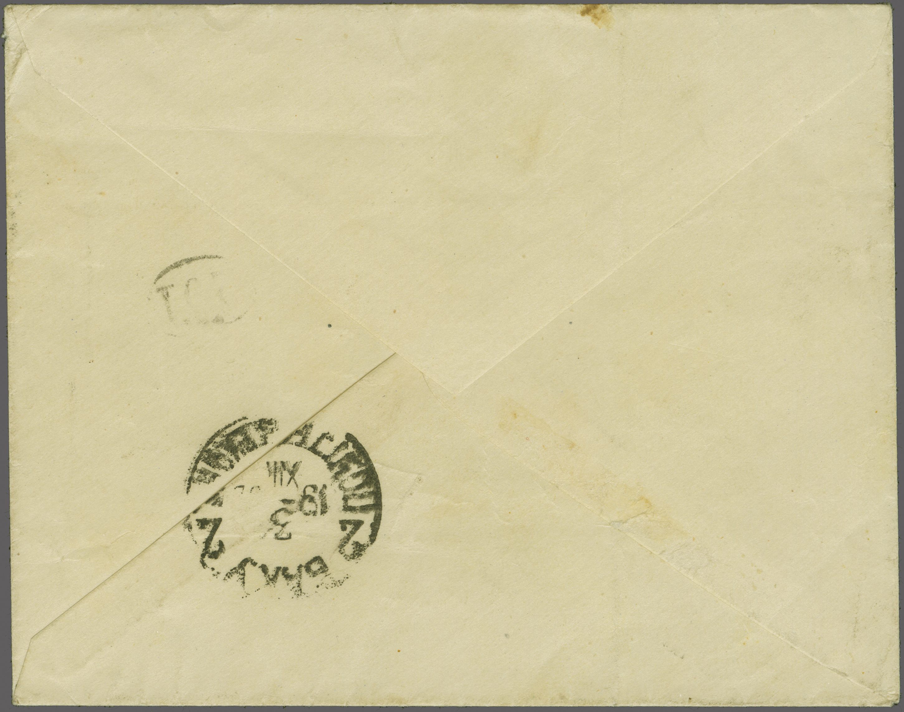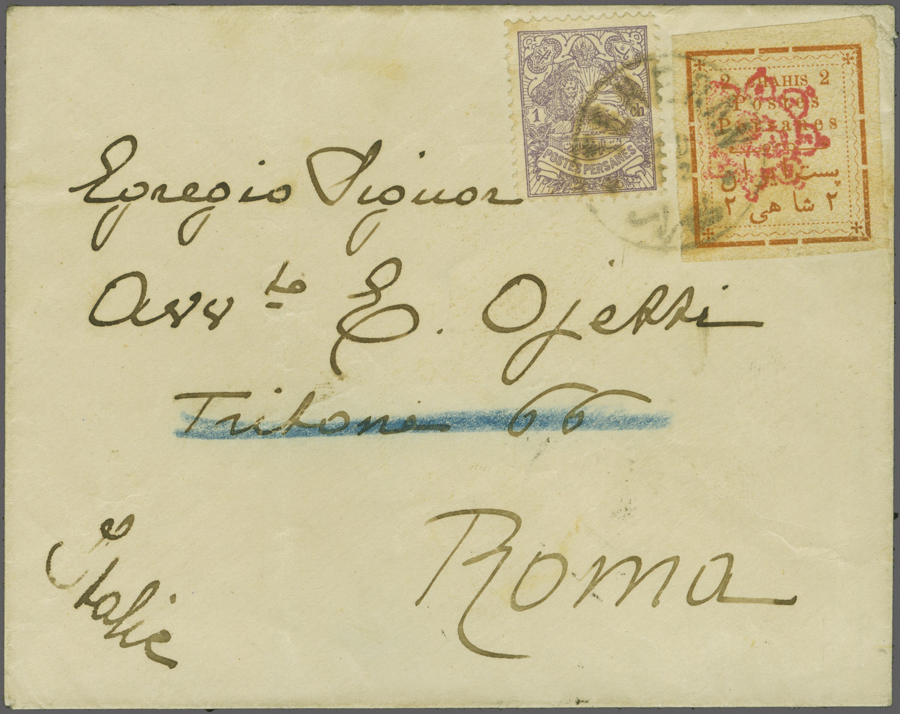 Matter rate cover to Rome, Italy tied by TEHERAN circular datestamp (Dec 10) in black. Reverse with Baku (Dec 3j) transit cds. A rare rate and a fine cover, also showing a very early usage of the typographed Arms issue (Image 1)