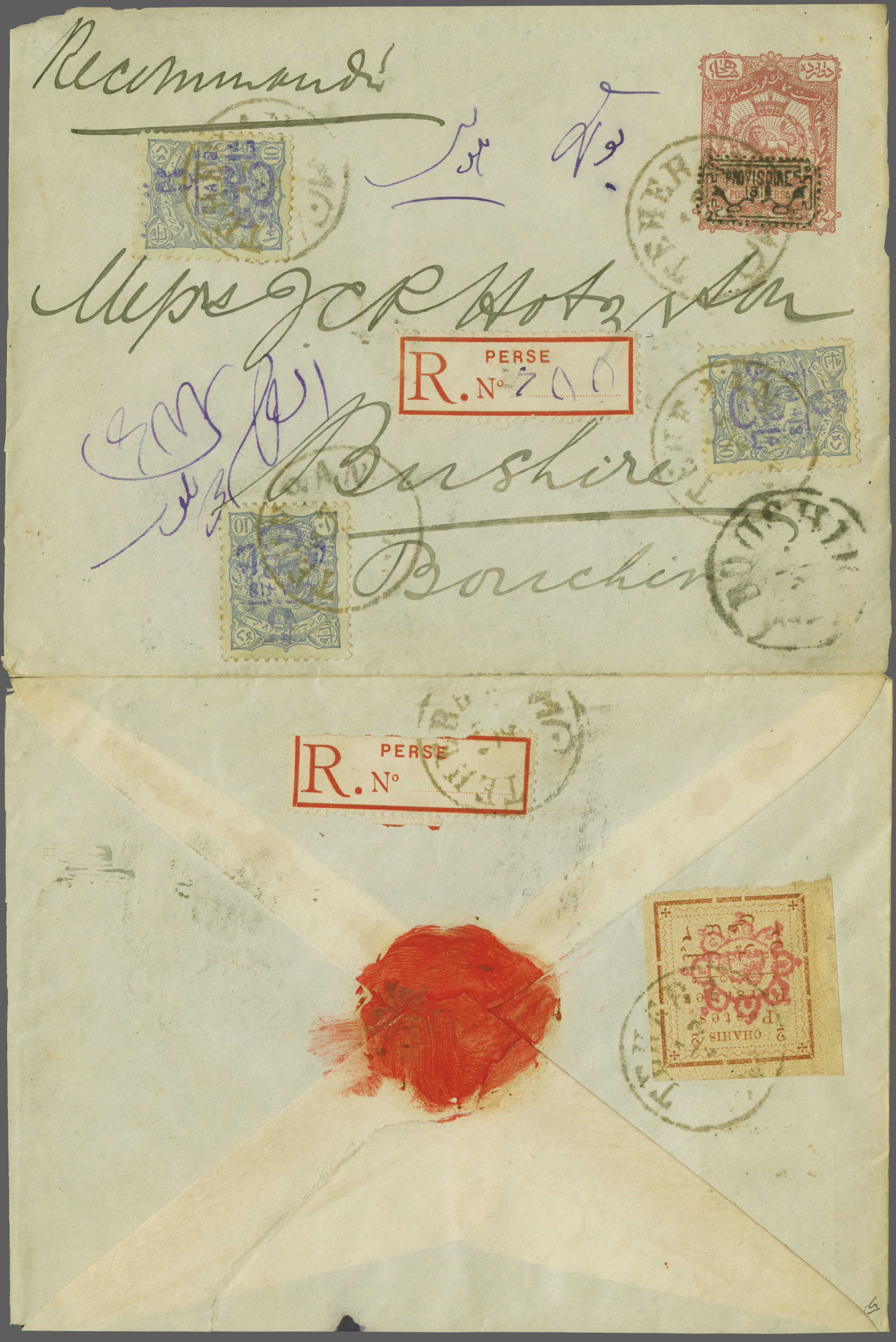 envelope sent registered to Bushire further up-rated with 1902 5 ch. on 10 ch. pale blue on greenish (3) and a blank registration label used to make up the 1 chahi required for the 30 chahi rate; all tied by TEHERAN cds's (April 17) and Bouchir