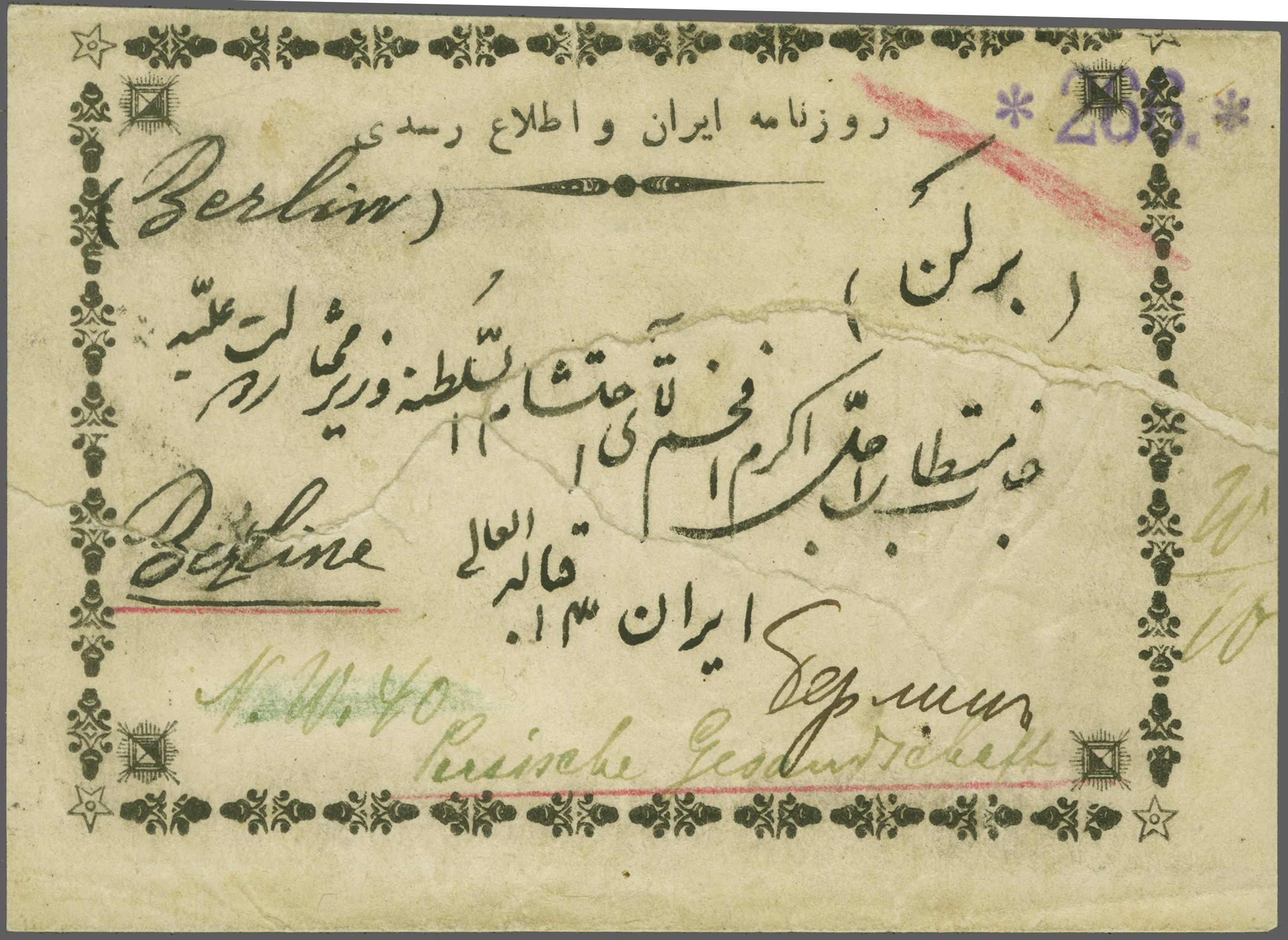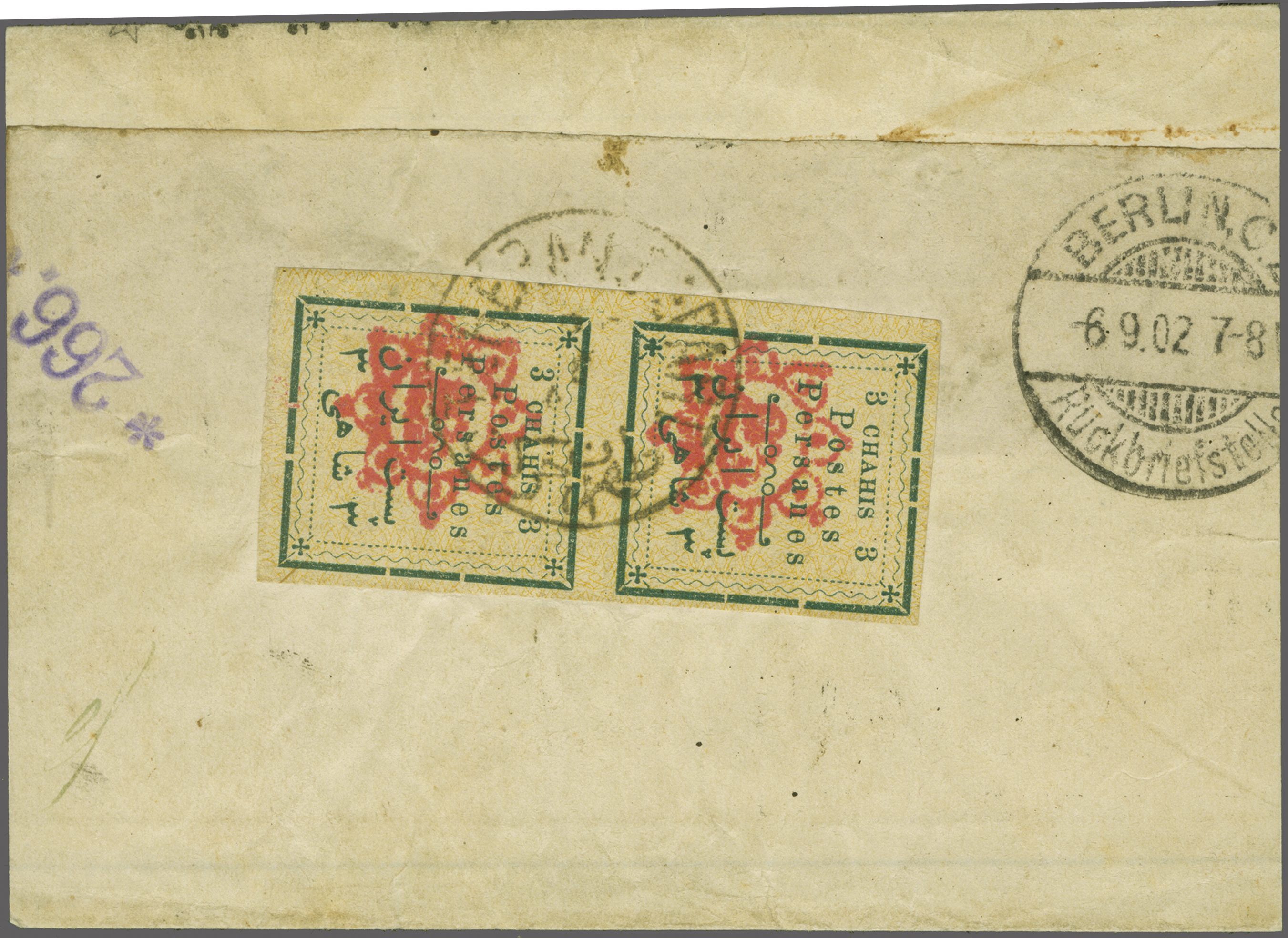 1902 (March): Rosette overprint in red on Typeset provisionals, 2nd. printing, 3 ch. deep green & buff imperforate in a vertical pair (positions 1/3), used on 1902 Newspaper wrapper from Teheran to Berlin tied by TEHERAN