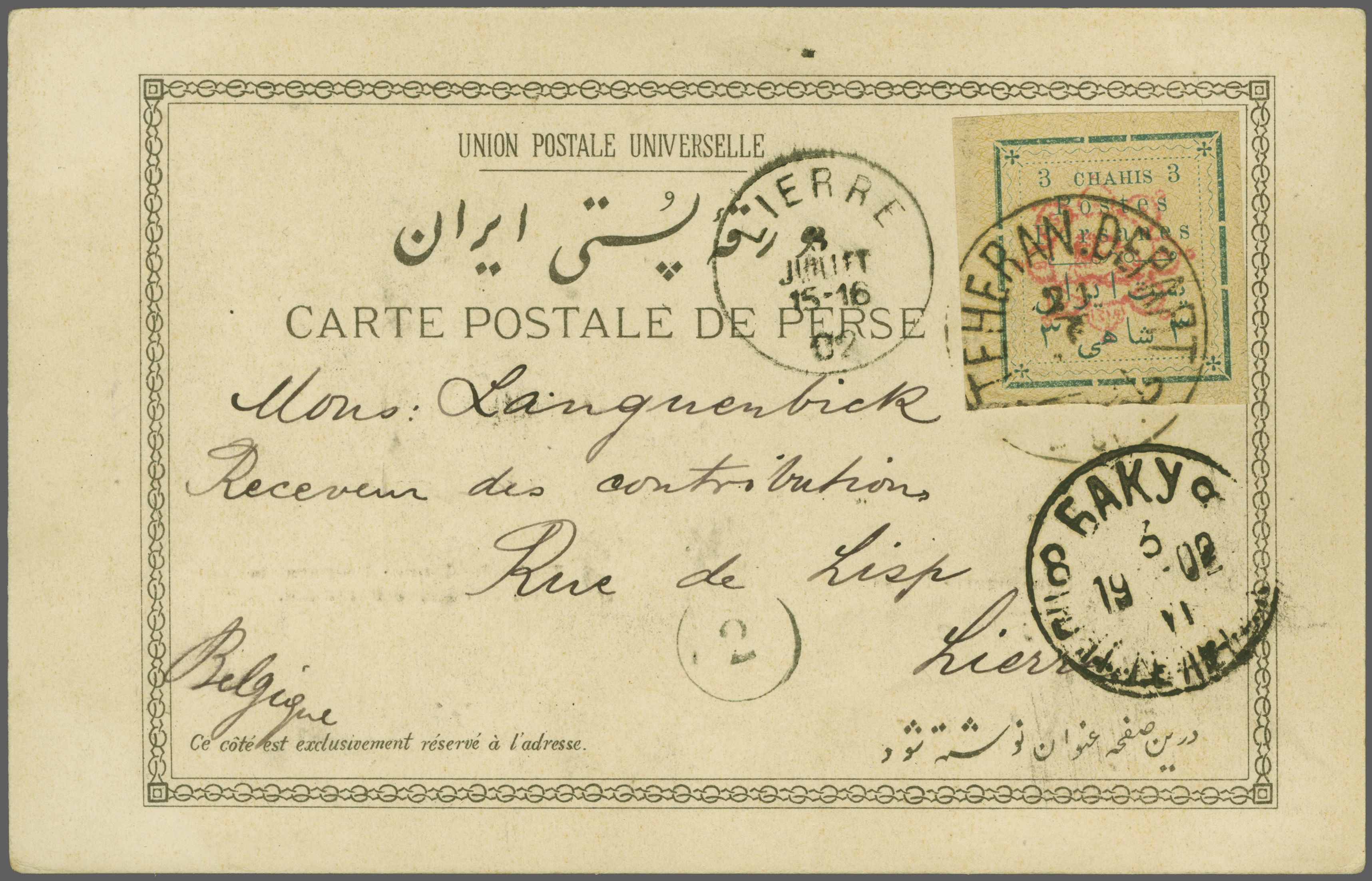 illustrated postcard from Tabriz to Brussels, Belgium at single rate (5 chahis + 12 chahis registration), all fine large margined examples, tied by TABRIZ circular datestamps in black (March 26). Belgian Postman's delivery number and Brussels arrival