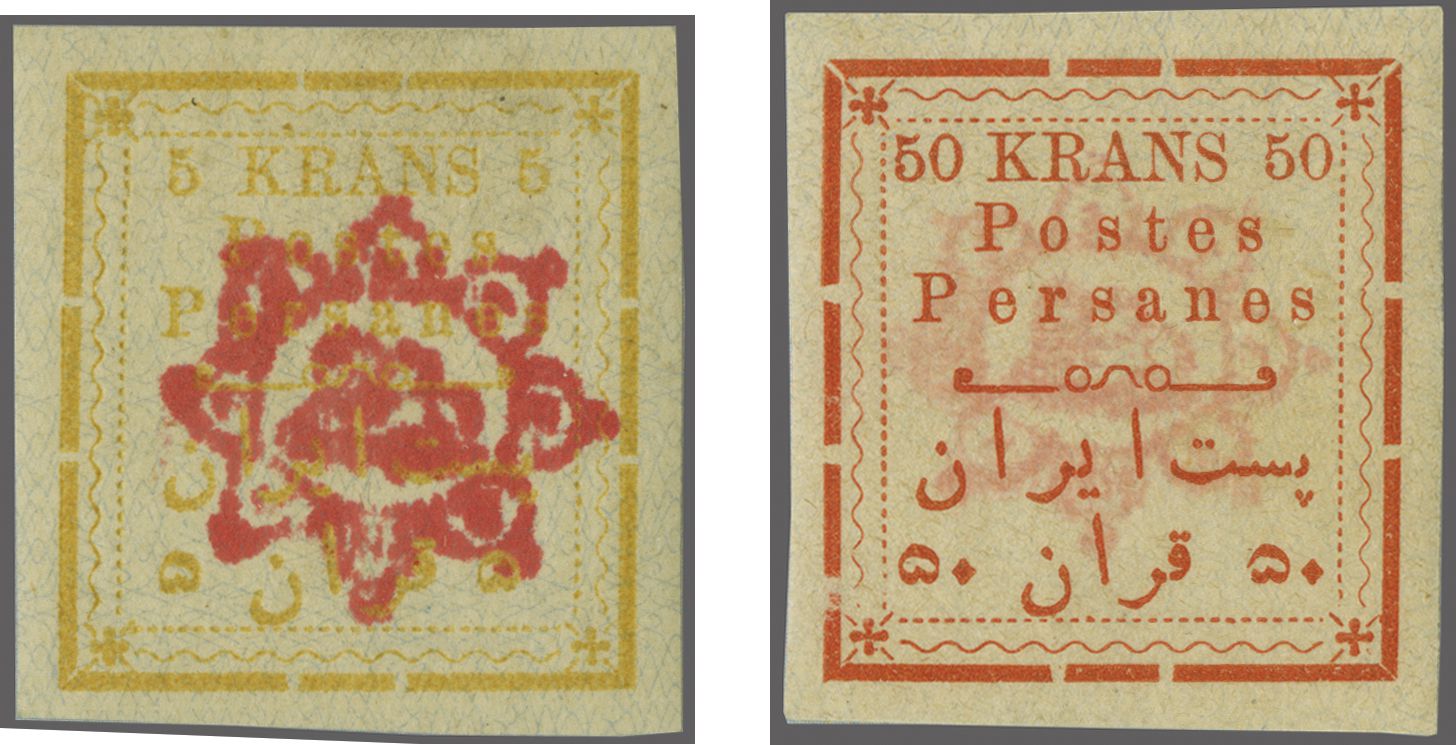 10 kr. dark blue & blue and very rare 50 kr. red & pale blue (position 9);together with the equally rare 5 kr. yellow-ochre & blue - unissued due to a probable clash between the 10 chahi and the 5 krans in close to the same colours; an