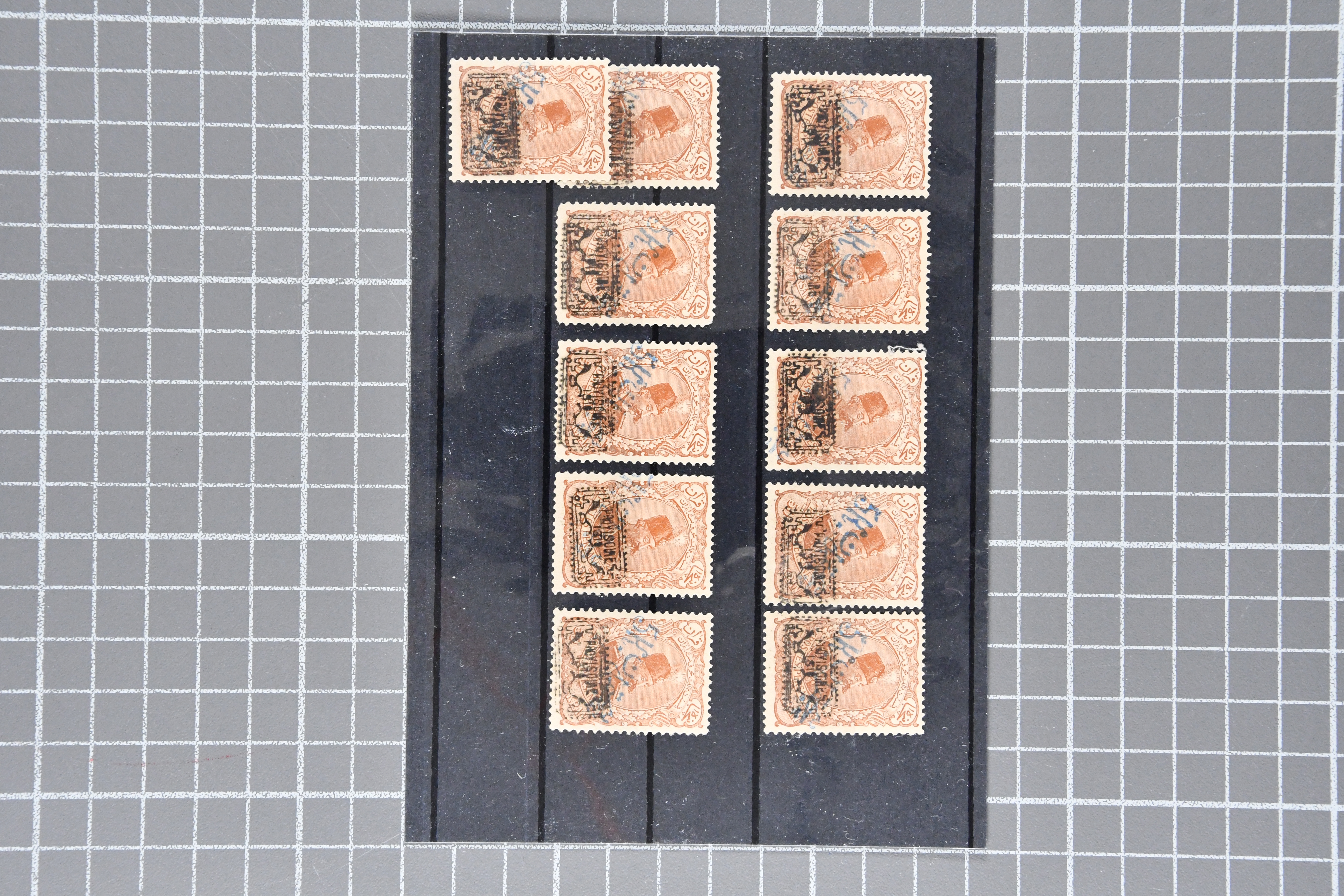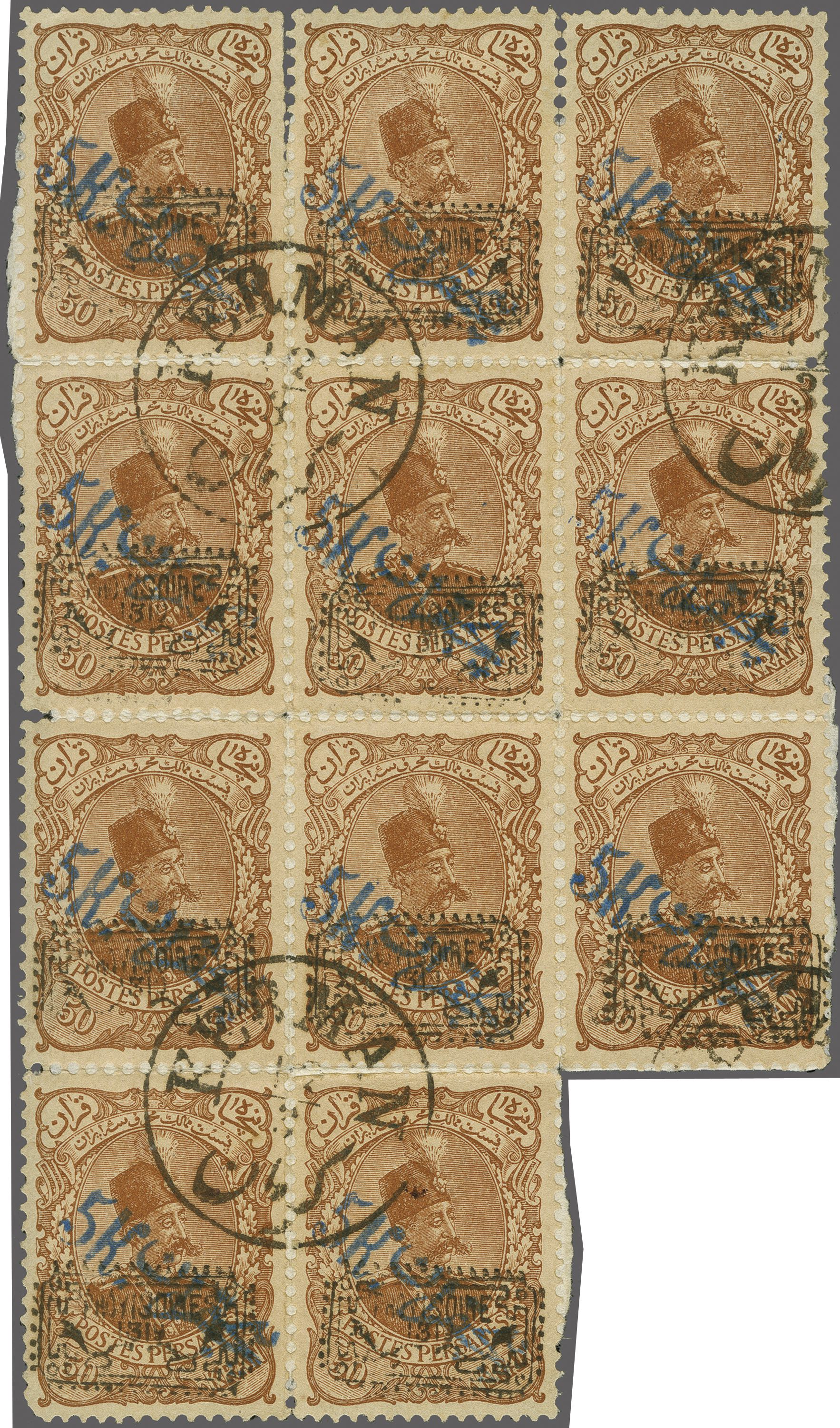 1902: 5 kr. diagonally overprinted in blue on 50 kr. brown optd. 'Provisoire' in black, a used irregular block of eleven on part piece, all cancelled by "KERMAN" circular datestamps (March 12) in black. Minor splitting between