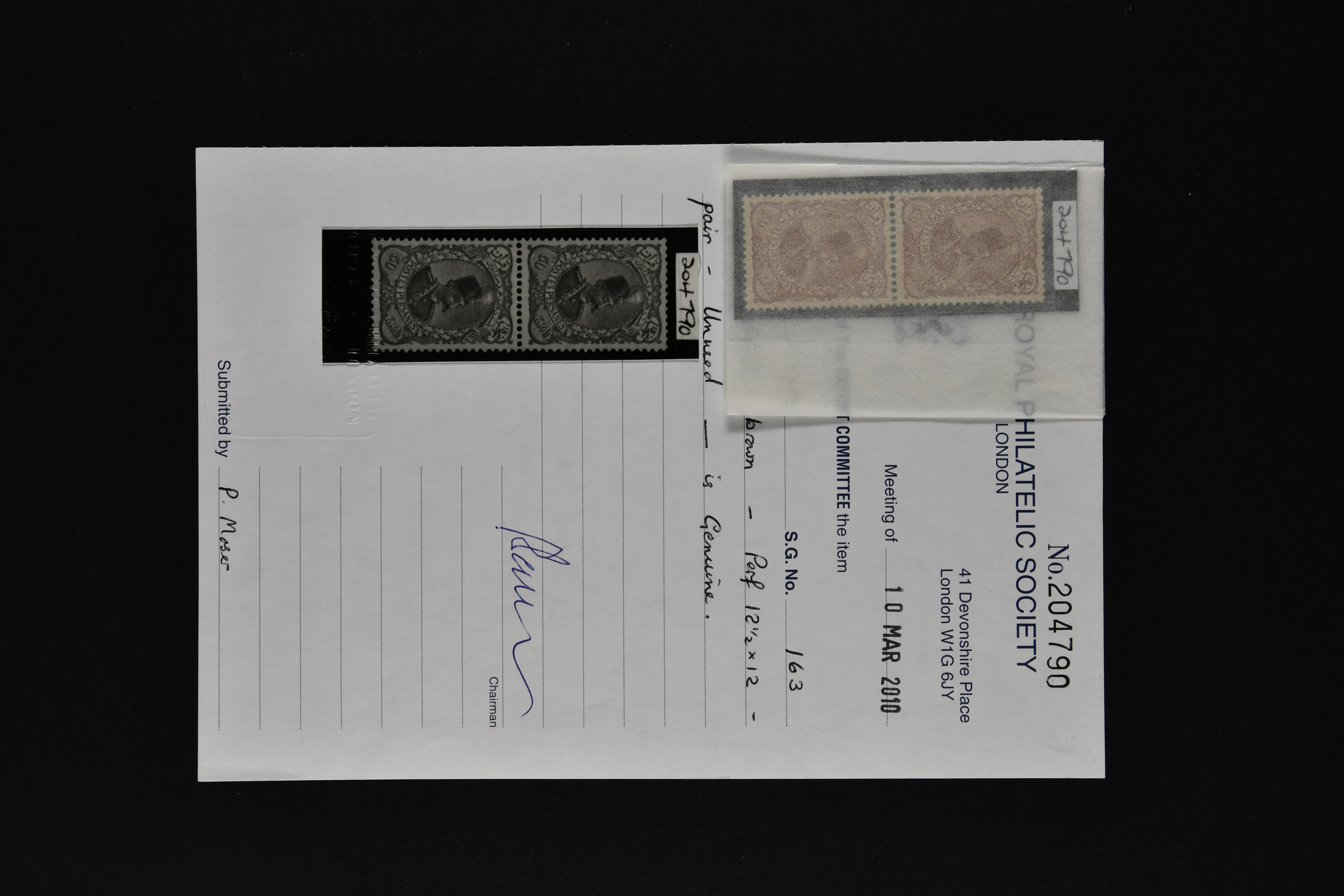 1902 (March): Rosette overprint in red on Typeset provisionals, 2nd. printing, 2 ch. brown & buff, a used example (position 2) with large margins all round, in combination with December 1902 1 ch. violet on 1902 Printed