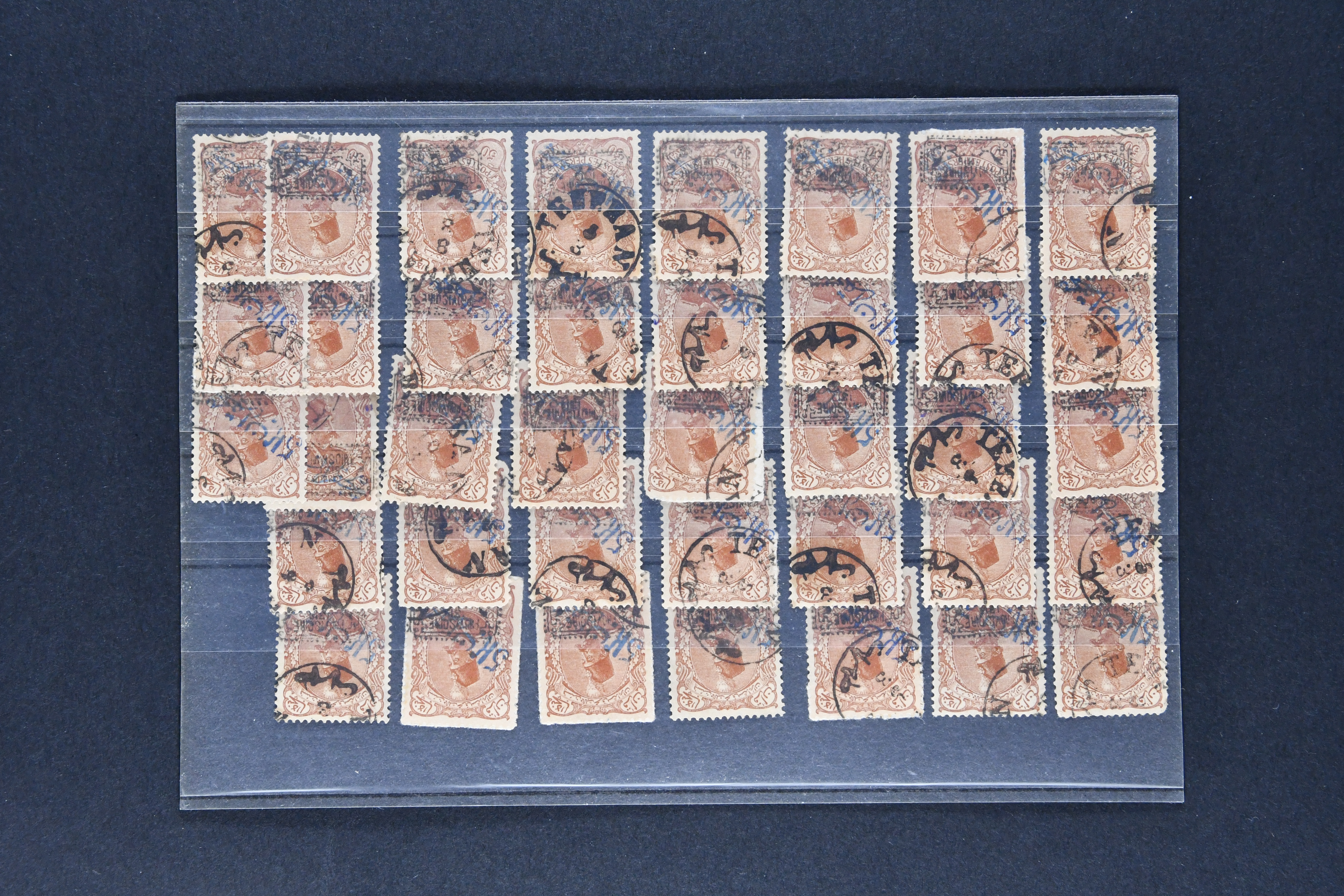 1902: 5 kr. diagonally overprinted in blue (type 26) on 50 kr. reddisch brown perf. 12 ½ x 12, with 'Provisoire' overprint Type 27 in black, group of 39 used single values, all cancelled by clear "Teheran"