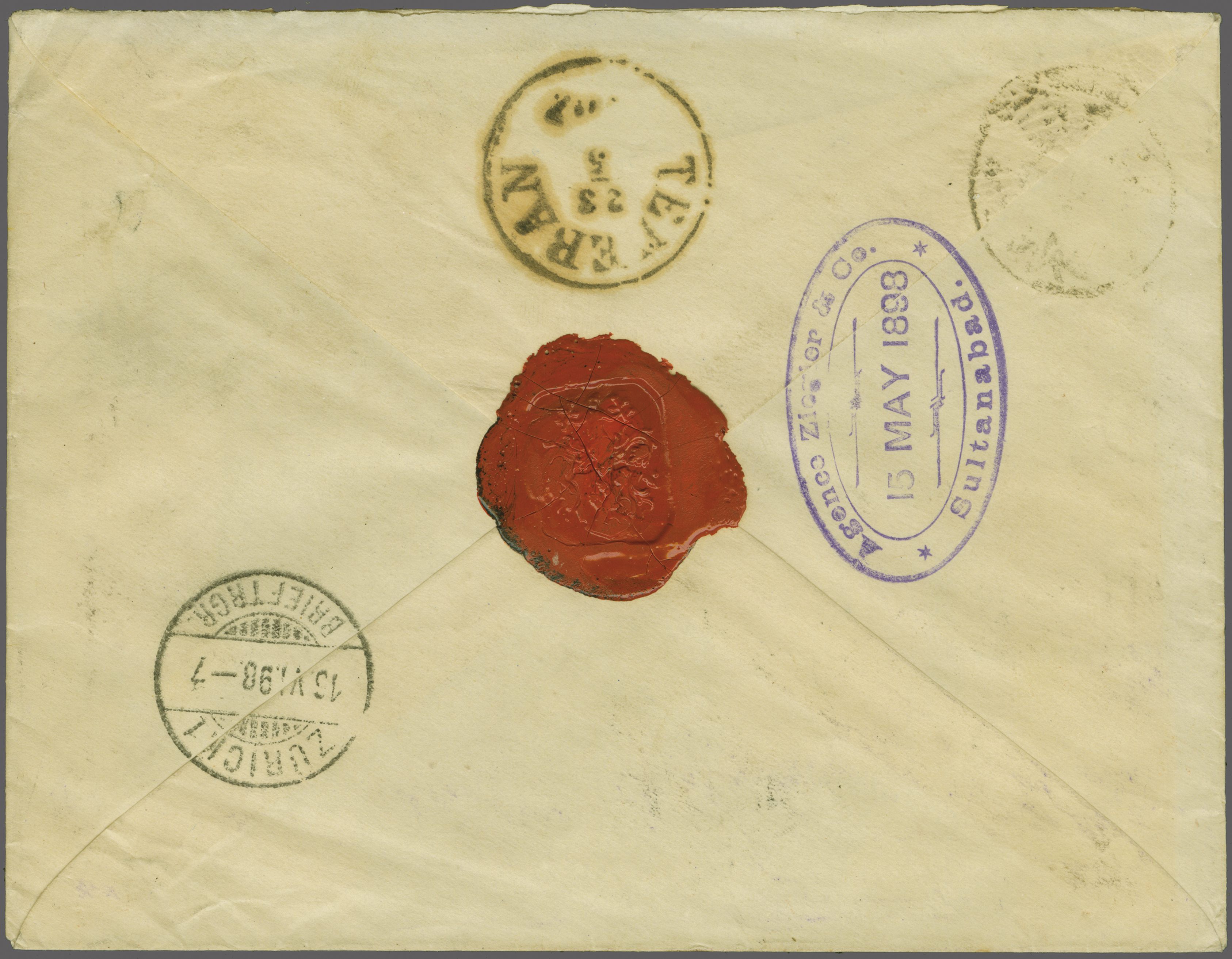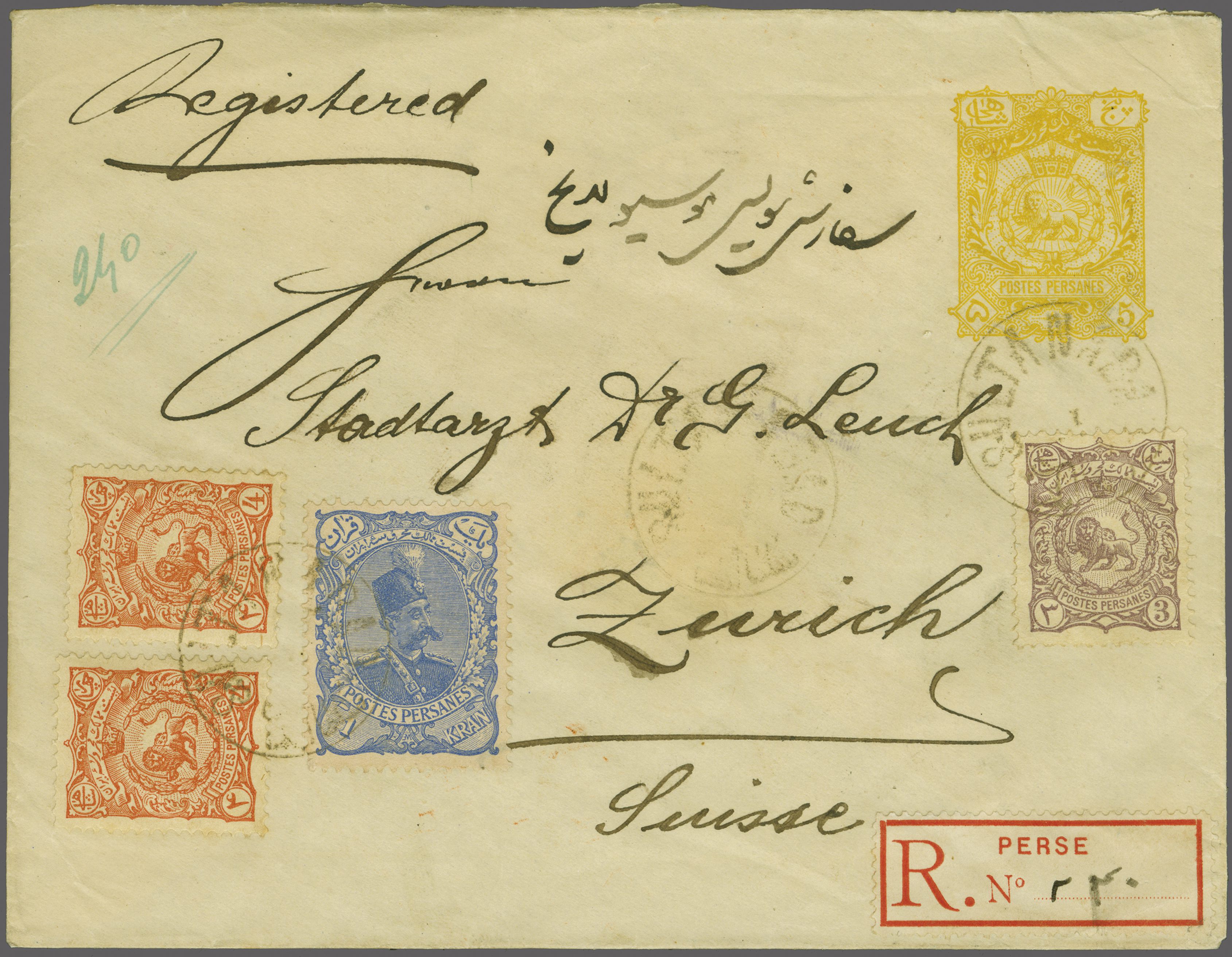 1898 (May 15): Registered 5 ch. stationery envelope to Switzerland uprated 1897 3 ch violet, 4 ch. vermillion (2), and 1 k. ultramarine tied by SULTANABAD cds, with registration PERSE label alongside, TEHERAN transit and