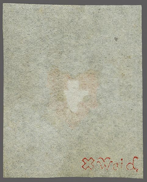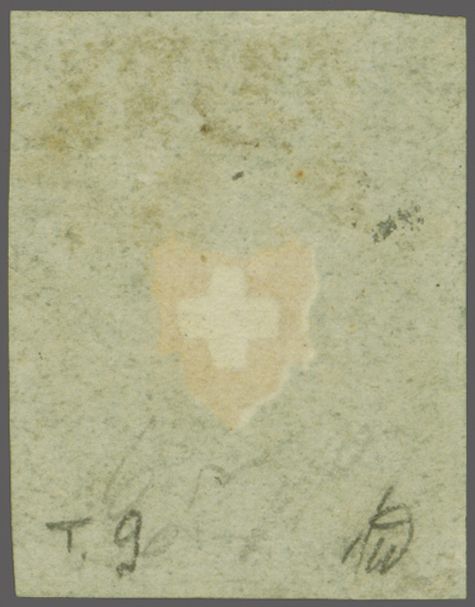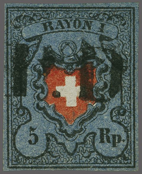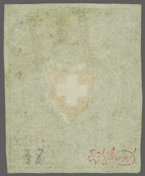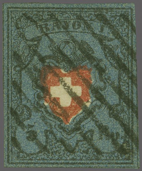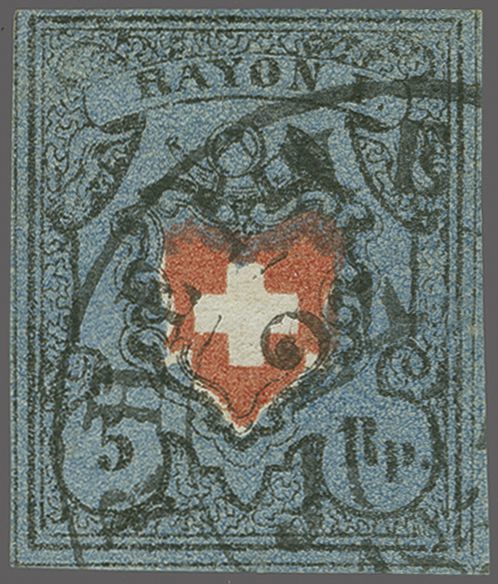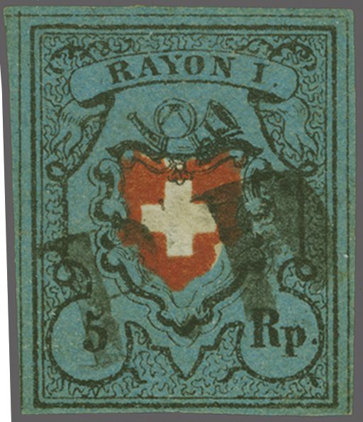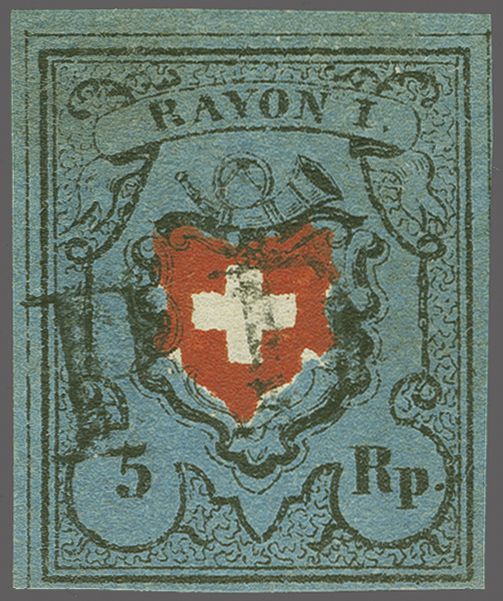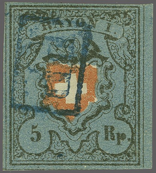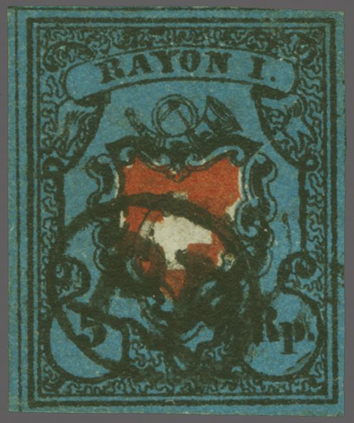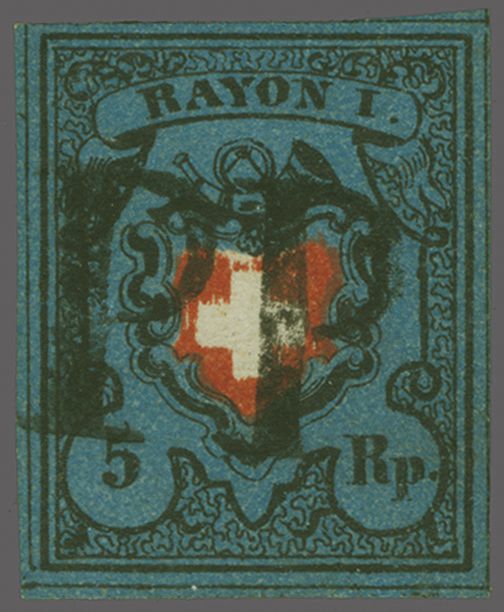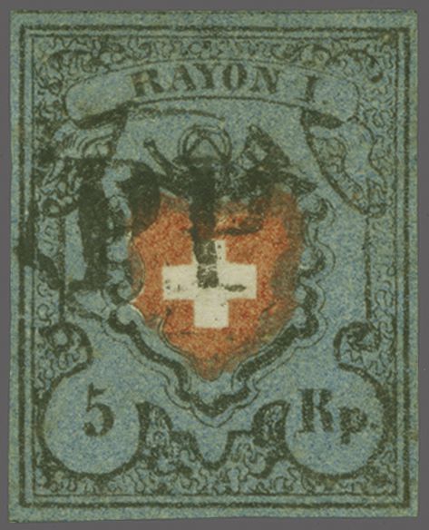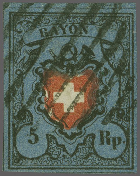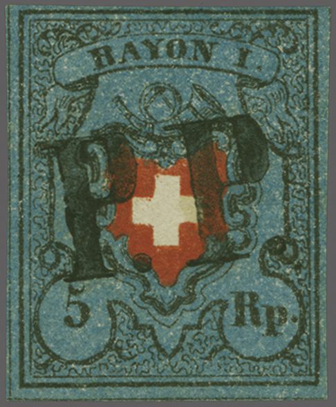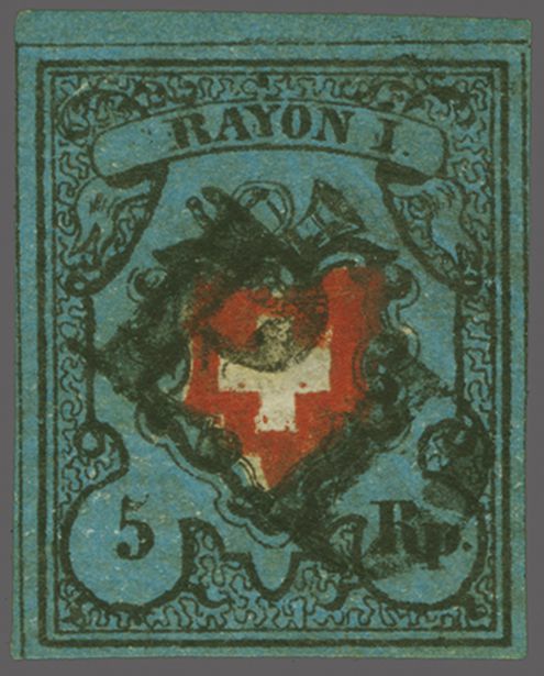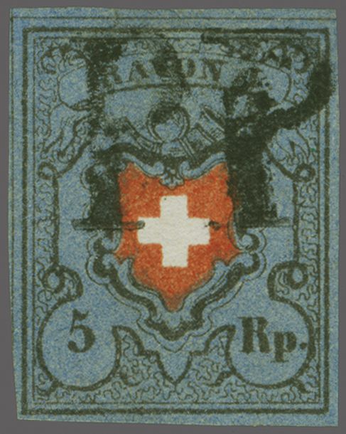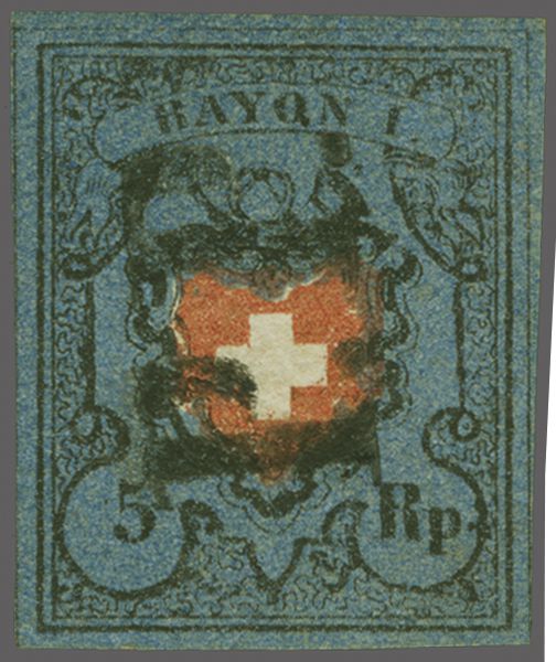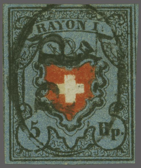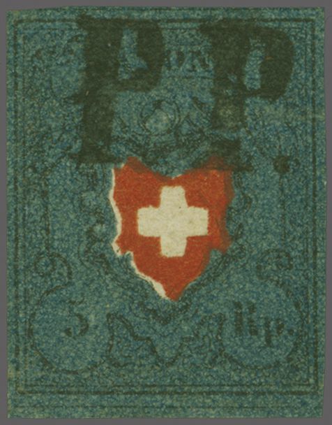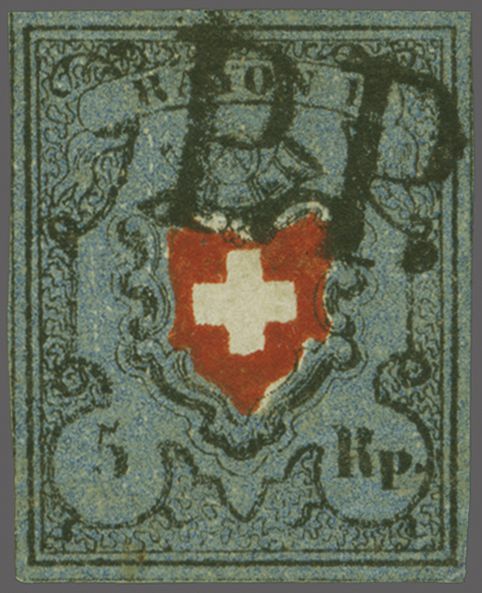 Ohne Kreuzeinfassung: Type 5 mit marmoriertem Blaudruck, farbfr. und breitrandig, klar und zentrisch entw. mit schwarzem "PP." im Oval unbekannter Herkunft (AW 292). Eine seltene Entwertung; Attest von der Weid (1971), Befund