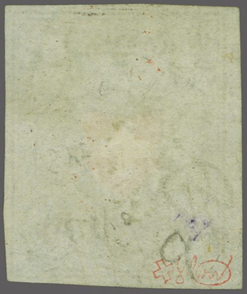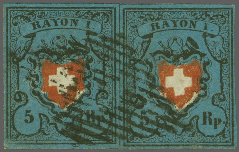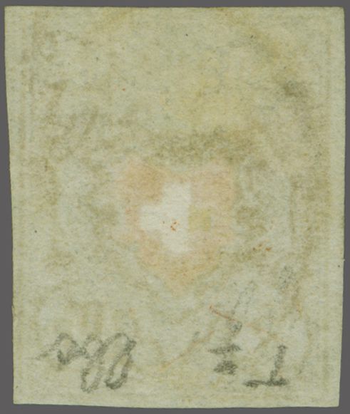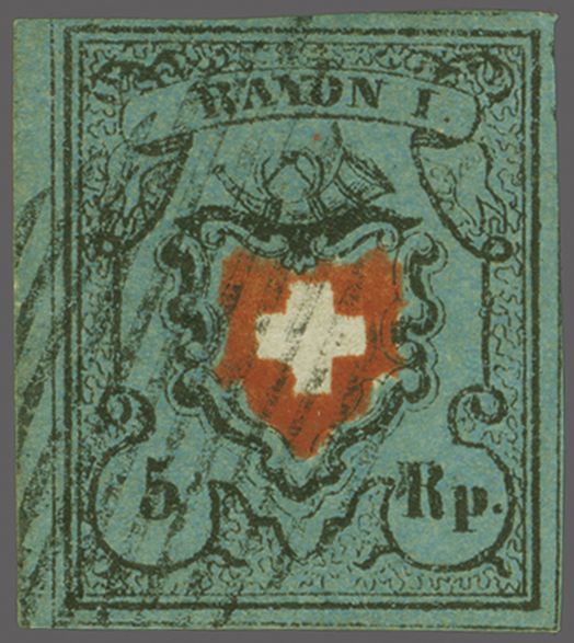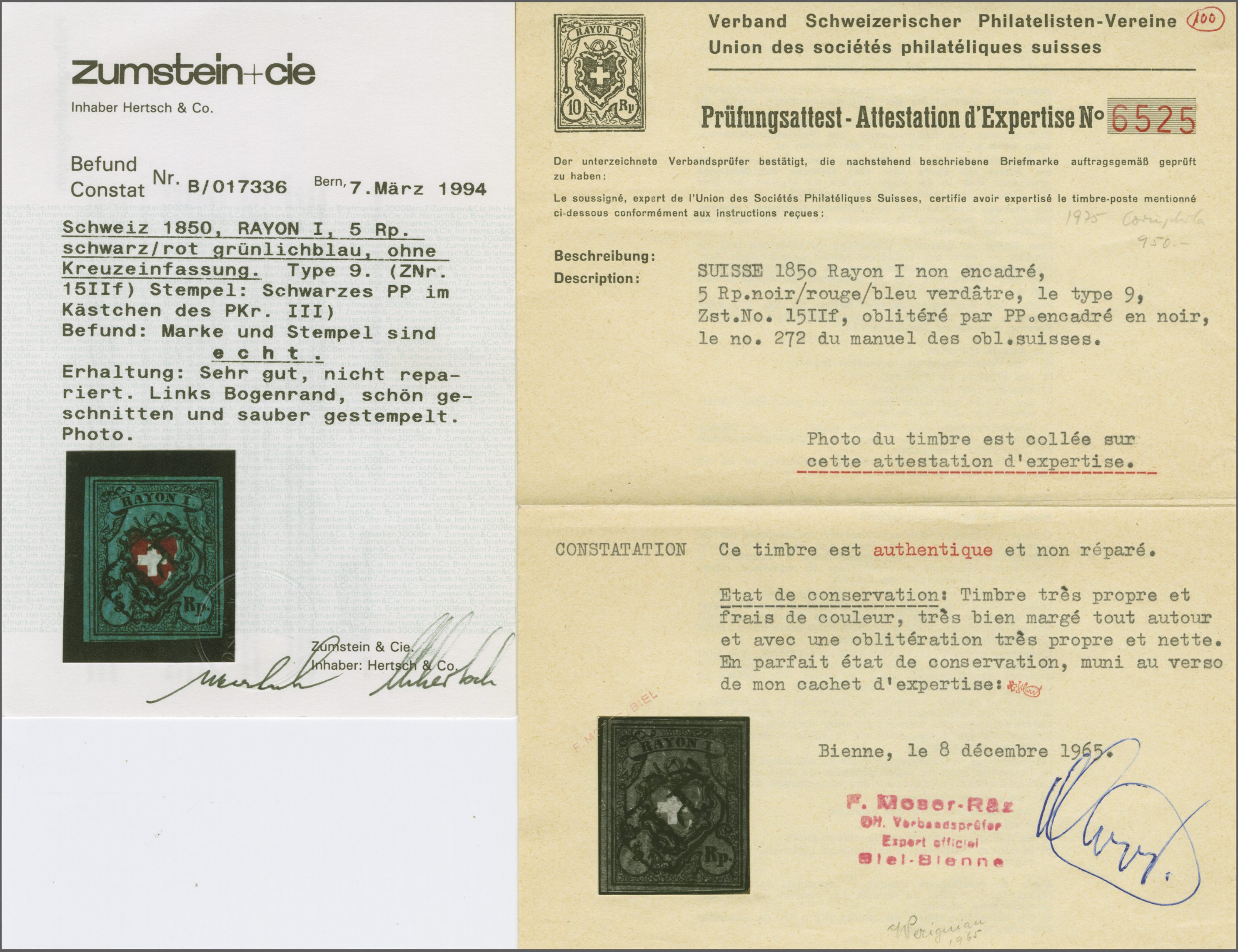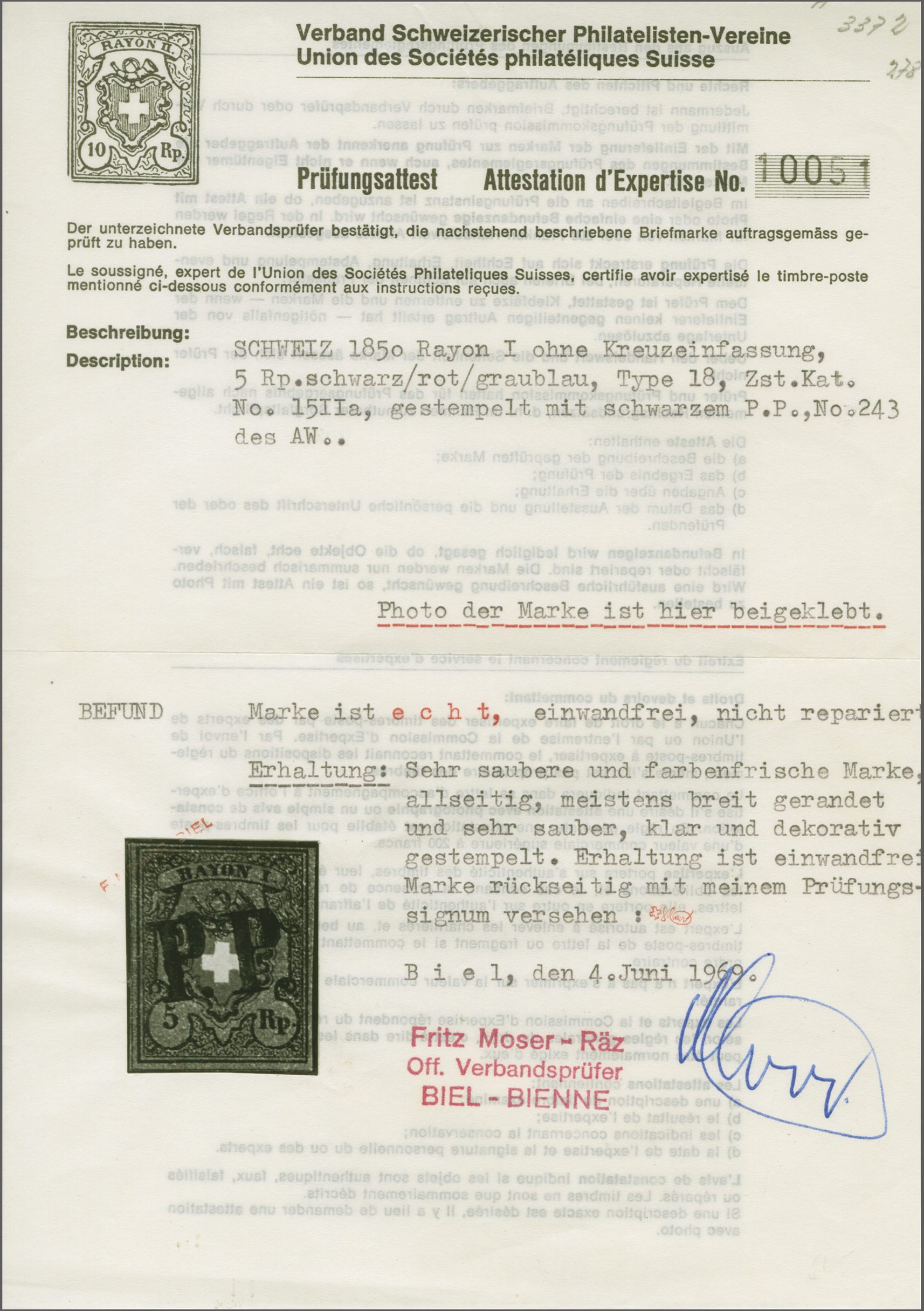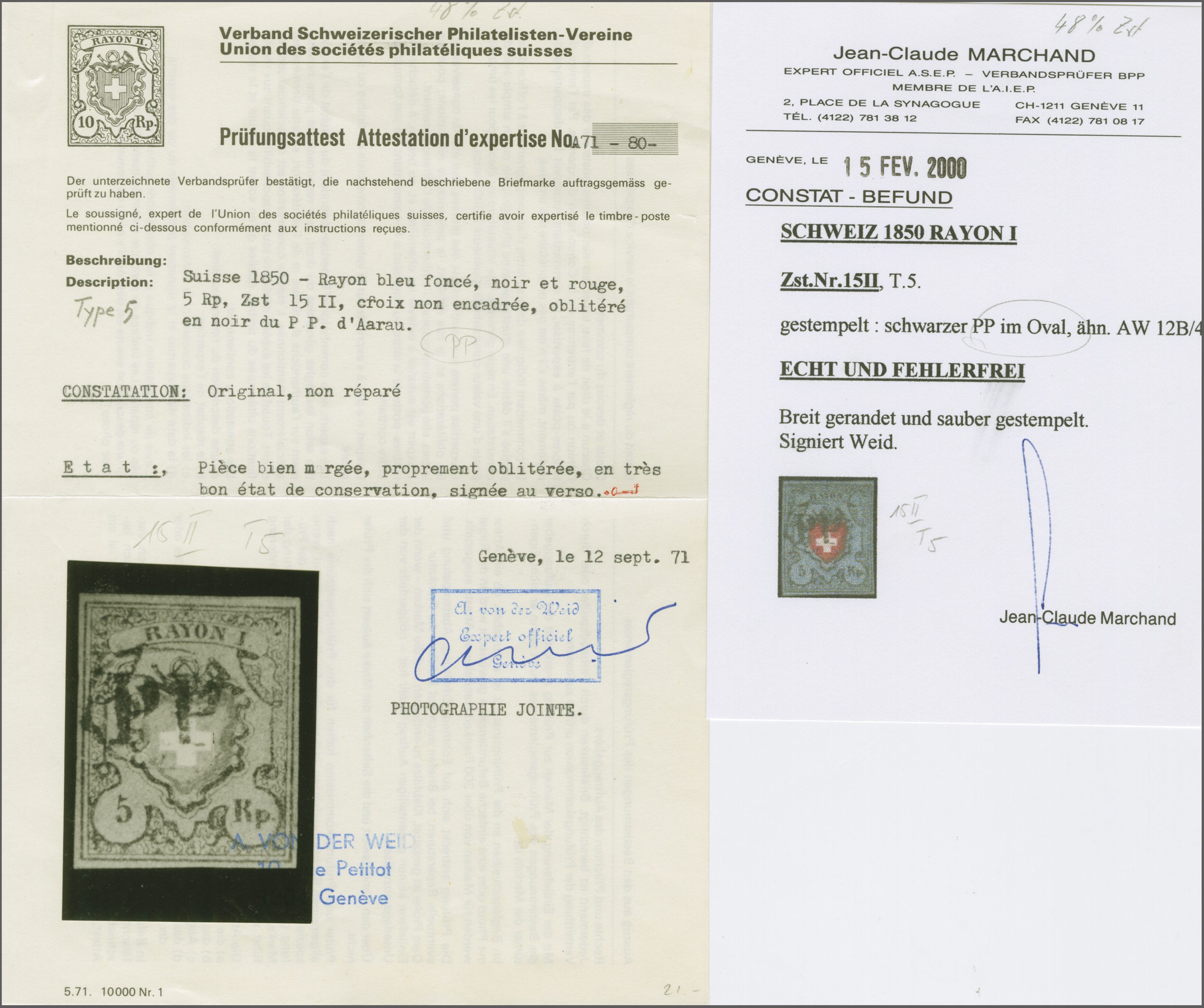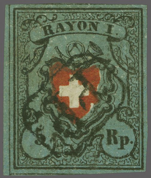 Ohne Kreuzeinfassung: Type 5 mit marmoriertem Blaudruck, farbfr. und breitrandig, klar und zentrisch entw. mit schwarzem "PP." im Oval unbekannter Herkunft (AW 292). Eine seltene Entwertung; Attest von der Weid (1971), Befund